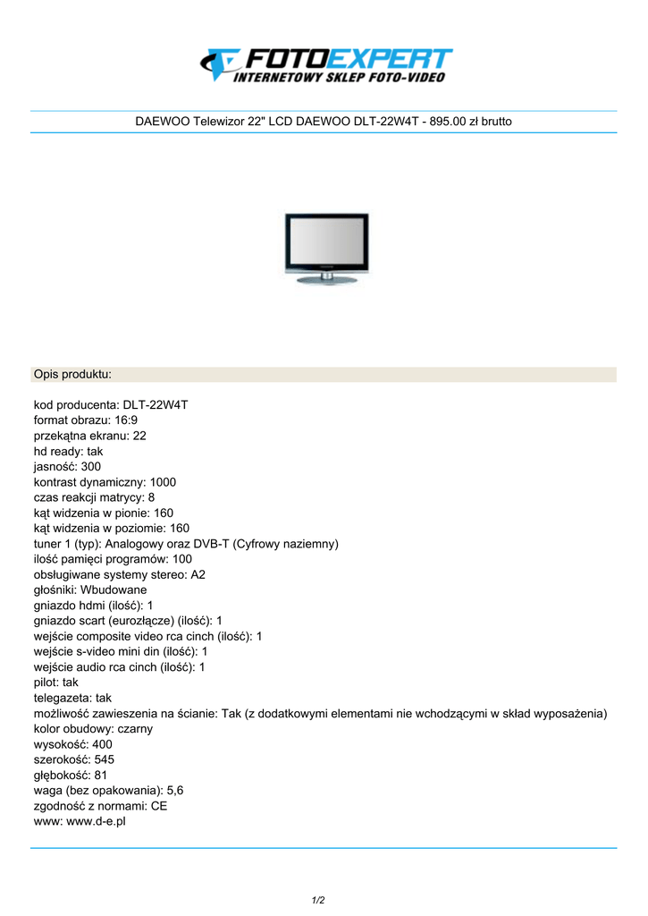 DAEWOO Telewizor 22" LCD DAEWOO DLT-22W4T - 895.00 zł brutto Opis produktu: kod producenta: DLT-22W4T format obrazu: 16:9 przekątna ekranu: 22 hd ready: tak jasność: 300 kontrast dynamiczny: 1000 czas reakcji matrycy: 8 kąt widzenia w pionie: 160 kąt widzenia w poziomie: 160 tuner 1 (typ): Analogowy oraz DVB-T (Cyfrowy naziemny) ilość pamięci programów: 100 obsługiwane systemy stereo: A2 głośniki: Wbudowane gniazdo hdmi (ilość): 1 gniazdo scart (eurozłącze) (ilość): 1 wejście composite video rca cinch (ilość): 1 wejście s-video mini din (ilość): 1 wejście audio rca cinch (ilość): 1 pilot: tak telegazeta: tak możliwość zawieszenia na ścianie: Tak (z dodatkowymi elementami nie wchodzącymi w skład wyposażenia) kolor obudowy: czarny wysokość: 400 szerokość: 545 głębokość: 81 waga (bez opakowania): 5,6 zgodność z normami: CE www: www.d-e.pl 1/2 www: Aparaty cyfrowe DAEWOO Telewizor 22" LCD DAEWOO DLT-22W4T e-mail: [email protected] Forum: www.forum.fotoexpert.pl tel.: (0)68 320 23 45, (0)68 320-23-34, (0)509 598 697 2/2