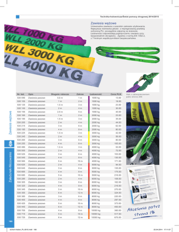 Technika-holownicza/Świat pomocy drogowej 2014/2015 Zawiesia wężowe Załadunek-Mocowanie Zawiesia wężowe Uniwersalne zawiesia o szerokim zakresie użytkowania. Najwyższa niemiecka jakość z impregnowaną powłoką ochronną PU, szczególnie odporną na ścieranie. Ładowności odpowiadają pojedynczemu zawiesiu przy bezpośrednim obciążeniu . Zgodne z normą EN 1492-2, z 7-krotnym współczynnikiem bezpieczeństwa. Długośc robocza Zakres Ładowność 0,5 m 1 m 1000 kg 13.00 Zawiesia pasowe 1 m 2 m 1000 kg 18.00 Zawiesia pasowe 1,5 m 3 m 1000 kg 23.00 530 145 Zawiesia pasowe 2 m 4 m 1000 kg 30.00 530 155 Zawiesia pasowe 2,5 m 5 m 1000 kg 40.00 530 165 Zawiesia pasowe 1 m 2 m 2000 kg 23.00 530 185 Zawiesia pasowe 1,5 m 3 m 2000 kg 35.00 530 205 Zawiesia pasowe 2 m 4 m 2000 kg 44.00 530 215 Zawiesia pasowe 3 m 6 m 2000 kg 62.00 530 195 Zawiesia pasowe 4 m 8 m 2000 kg 80.00 530 225 Zawiesia pasowe 1,5 m 3 m 3000 kg 42.00 530 245 Zawiesia pasowe 2 m 4 m 3000 kg 56.00 530 265 Zawiesia pasowe 3 m 6 m 3000 kg 80.00 530 255 Zawiesia pasowe 4 m 8 m 3000 kg 105.00 530 485 Zawiesia pasowe 1,5 m 3 m 4000 kg 53.00 530 505 Zawiesia pasowe 2 m 4 m 4000 kg 72.00 530 525 Zawiesia pasowe 3 m 6 m 4000 kg 103.00 530 545 Zawiesia pasowe 4 m 8 m 4000 kg 130.00 530 565 Zawiesia pasowe 5 m 10 m 4000 kg 171.00 530 625 Zawiesia pasowe 2 m 4 m 5000 kg 94.00 530 645 Zawiesia pasowe 3 m 6 m 5000 kg 135.00 530 665 Zawiesia pasowe 4 m 8 m 5000 kg 175.00 530 685 Zawiesia pasowe 5 m 10 m 5000 kg 216.00 530 285 Zawiesia pasowe 2 m 4 m 6000 kg 108.00 530 305 Zawiesia pasowe 3 m 6 m 6000 kg 162.00 530 325 Zawiesia pasowe 4 m 8 m 6000 kg 216.00 530 345 Zawiesia pasowe 5 m 10 m 6000 kg 270.00 530 355 Zawiesia pasowe 6 m 12 m 6000 kg 324.00 530 385 Zawiesia pasowe 3 m 6 m 8000 kg 220.00 530 405 Zawiesia pasowe 4 m 8 m 8000 kg 297.00 530 425 Zawiesia pasowe 5 m 10 m 8000 kg 373.00 530 445 Zawiesia pasowe 6 m 12 m 8000 kg 400.00 530 705 Zawiesia pasowe 4 m 8 m 10000 kg 360.00 530 715 Zawiesia pasowe 5 m 10 m 10000 kg 517.00 530 725 Zawiesia pasowe 6 m 12 m 10000 kg 675.00 Nr. kat. Opis 530 095 Zawiesia pasowe 530 105 530 125 Cena PLN Hak z zabezpieczeniem patrz strona 206 ia patrz Akcesor 196 strona 180 sichern-heben_PL-2015.indd 180 25.04.2014 17:11:07 Technika-holownicza/Świat pomocy drogowej 2014/2015 Zawiesia pasowe Duplex Bardzo wytrzymałe zawiesia pasowe wykonane z dwuwarstwoego poliestru zakończone pętlami . Zgodne EN 1492-1. Do podnoszenia, holowania i zabezpieczania solidne i długotrwłe Zalecamy użycie taśm ochronnych przy kontaktach z ostrymi niebezpiecznymi krawedziami. ia patrz Akcesor 196 strona Szerokość Długość Nacisk Ładowność/ U-forma 30 mm 2 m 1 t 2 t Cena PLN 42.00 510 225 Zawiesia pasowe Duplex 30 mm 3 m 1 t 2 t 56.00 510 245 Zawiesia pasowe Duplex 30 mm 4 m 1 t 2 t 67.00 510 255 Zawiesia pasowe Duplex 30 mm 5 m 1 t 2 t 78.00 510 305 Zawiesia pasowe Duplex 60 mm 2 m 2 t 4 t 65.00 510 325 Zawiesia pasowe Duplex 60 mm 3 m 2 t 4 t 83.00 510 345 Zawiesia pasowe Duplex 60 mm 4 m 2 t 4 t 103.00 510 355 Zawiesia pasowe Duplex 60 mm 5 m 2 t 4 t 121.00 510 375 Zawiesia pasowe Duplex 60 mm 6 m 2 t 4 t 144.00 510 385 Zawiesia pasowe Duplex 60 mm 8 m 2 t 4 t 175.00 510 405 Zawiesia pasowe Duplex 90 mm 2 m 3 t 6 t 94.00 510 425 Zawiesia pasowe Duplex 90 mm 3 m 3 t 6 t 121.00 510 445 Zawiesia pasowe Duplex 90 mm 4 m 3 t 6 t 148.00 510 465 Zawiesia pasowe Duplex 90 mm 6 m 3 t 6 t 202.00 510 485 Zawiesia pasowe Duplex 90 mm 8 m 3 t 6 t 238.00 Nr. kat. Opis Długość Nacisk Ładowność/ U-forma 510 505 Zawiesia pasowe Heavy-Duty 120 mm 4 m 4 t 8 t Cena PLN 220.00 510 525 Zawiesia pasowe Heavy-Duty 120 mm 6 m 4 t 8 t 310.00 510 545 Zawiesia pasowe Heavy-Duty 120 mm 8 m 4 t 8 t 400.00 510 565 Zawiesia pasowe Heavy-Duty 120 mm 10 m 4 t 8 t 490.00 510 585 Zawiesia pasowe Heavy-Duty 120 mm 12 m 4 t 8 t 580.00 510 605 Zawiesia pasowe Heavy-Duty 180 mm 6 m 6 t 12 t 625.00 510 625 Zawiesia pasowe Heavy-Duty 180 mm 8 m 6 t 12 t 742.00 510 645 Zawiesia pasowe Heavy-Duty 180 mm 10 m 6 t 12 t 940.00 510 665 Zawiesia pasowe Heavy-Duty 180 mm 12 m 6 t 12 t 1120.00 510 695 Zawiesia pasowe Heavy-Duty 240 mm 4 m 8 t 16 t 535.00 510 705 Zawiesia pasowe Heavy-Duty 240 mm 6 m 8 t 16 t 670.00 510 725 Zawiesia pasowe Heavy-Duty 240 mm 8 m 8 t 16 t 850.00 510 745 Zawiesia pasowe Heavy-Duty 240 mm 10 m 8 t 16 t 985.00 510 765 Zawiesia pasowe Heavy-Duty 240 mm 12 m 8 t 16 t 1165.00 510 815 Zawiesia pasowe Heavy-Duty 300 mm 6 m 10 t 20 t 850.00 510 835 Zawiesia pasowe Heavy-Duty 300 mm 8 m 10 t 20 t 940.00 510 855 Zawiesia pasowe Heavy-Duty 300 mm 10 m 10 t 20 t 1075.00 510 875 Zawiesia pasowe Heavy-Duty 300 mm 12 m 10 t 20 t 1255.00 510 895 Zawiesia pasowe Heavy-Duty 300 mm 14 m 10 t 20 t 1435.00 Zawiesia pasowe Opis Zawiesia pasowe Duplex Załadunek-Mocowanie Nr. kat. 510 205 181 sichern-heben_PL-2015.indd 181 15.04.2014 09:20:34 Technika-holownicza/Świat pomocy drogowej 2014/2015 Specjalne zawiesia pasowe Do sprawnego podnoszenia za spód pojazdów, zawiesie z regulacją długości, dzięki swojej szerokości umożliwia równomierny rozkład obciążeń, należy jednak pamiętać że progi niektórych pojazdów są wrażliwe na nacisk. Regulowana długość od 4,20 m do 5,10 m. Nr. kat. Opis 500 065 Specjalne zawiesie pasowe (1 szt) Szerokość Długość Ładowność EN 300 mm 4,2 - 5,1 m 2500 kg U-Form 1492-1 Zawiesia pasowe 486.00 Zawiesia pasowe z szeklą z pętlami Załadunek-Mocowanie Cena PLN Ze stalowymi,wzmacnianymi szeklami do sprawnego podnoszenia uszkodzonych pojazdów za dach. Zgodne z normą EN 1492-1. Przy silnie uszkodzonych pojazdach z wieloma ostrymi krawędziami zalecamy stosowanie taśm ochronnych. ze stalowymi ogniwami Nr. kat. Opis Wersja Szerokość Długość Ładowność Cena PLN 500 105 Pas transportowy z pętlami 200 mm 3,6 m do 2500 kg 310.00 500 115 Pas transportowy (do trawersy) z pętlami 200 mm 2,5 m do 2500 kg 288.00 500 035 Pas transportowy dwuwarstwowy ze stalowymi ogniwami 80 mm 3,6 