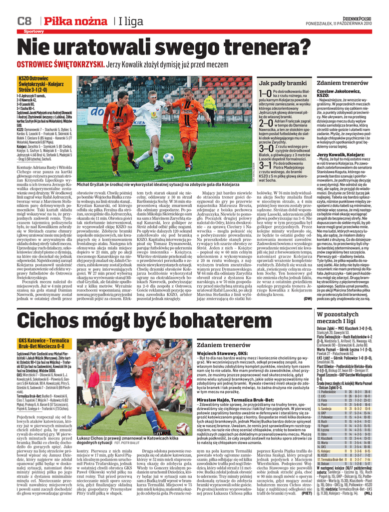 C8 Piłka nożna | I liga PONIEDZIAŁEK, 11 PAŹDZIERNIKA 2010 Nie uratowali swego trenera? OSTROWIEC ŚWIĘTOKRZYSKI. Jerzy Kowalik złożył dymisję już przed meczem KSZO Ostrowiec Świętokrzyski –Kolejarz Stróże 3–1 (2–0) Zdaniem trenerów Po dośrodkowaniu Białka z rzutu rożnego, na 1–0 polu karnym Kolejarza powstało Czesław Jakołcewicz, KSZO: olbrzymie zamieszanie, w wyniku którego zdezorientowany Jędrszczyk głową skierował piłkę do własnej bramki. Adrian Frańczak zagrał w tempo do Damiana Nawrocika, a ten ze stoickim spokojem posłał futbolówkę do siatki obok wybiegającego mu naprzeciw Zarychty. Z rzutu wolnego precyzyjnie dośrodkował Białek, a główkujący z 3 metrów Lasocki dopełnił formalności. Po dośrodkowaniu Piotra Madejskiego z rzutu wolnego, do bramki KSZO z 5 m piłkę głową skierował Socha. 2–0 Dymanowski 7 – Stachurski 5, Dybiec 5, Kardas 6, Lasocki 6 – Frańczak 6, Skórnicki 6, Białek 7, Cieciura 6 (85 kapsa) – Kanarski 5 (77 Wolański), Nawrocik 6 (87 Mąka). Zarychta 5 – Szymiczek 5 (81 Ciećko), Księżyc 5, Szufryn 5, Walęciak 6 – Gryźlak 5, Jędrszczyk 4 (46 Broź 4), Stefanik 5, Madejski 5 –Drąg 5 (58 Łętocha), Socha 6. 3–0 FOT. RAFAŁ SOBOŃ Kontuzje Adriana Basty i Witolda Cichego oraz pauza za kartki głównego reżysera poczynań stróżan Krzysztofa Lipeckiego wymusiła u ich trenera Jerzego Kowalika eksperymentalne zestawienie swej drużyny. W środkowej linii zagrał więc Rafał Jędrszczyk, tworząc wraz z Marcinem Stefanikiem parę defensywnych pomocników. Taki kształt składu mógł wskazywać na to, że przyjezdnych zadowoli remis. Tymczasem tajemnicą poliszynela było, że nad Kowalikiem zebrały się w Stróżach czarne chmury i głowę uratować może mu jedynie zwycięstwo w arcyważnym dla układu dolnej strefy tabeli meczu. Uprzedzając ruch działaczy, szkoleniowiec złożył pismo z dymisją, na które nie doczekał się jednak odpowiedzi. Najwidoczniej zarząd Kolejarza postanowił uzależnić swe postanowienie od efektu wyprawy futbolistów do Ostrowca Świętokrzyskiego. Początek meczu należał do miejscowych. Już w 4 min przed szansą na gola stanął Damian Nawrocik, powstrzymany został jednak w ostatniej chwili przez Jak padły bramki 3–1 Michał Gryźlak (w środku) nie wykorzystał idealnej sytuacji na zdobycie gola dla Kolejarza obrońców rywali. Chwilę później po bombie Wojciecha Białka z rzutu wolnego, na linii strzału stanął... Krystian Kanarski, od którego odbiła się piłka. Feralna dla stróżan, szczególnie dla Jędrszczyka, okazała się 11 min. Obrońca gości tak niefortunnie interweniował, że wyprowadził ekipę KSZO na prowadzenie. Zdobycie bramki uspokoiło miejscowych, nie kwapiących się z kontynuowaniem frontalnego ataku. Następna ich ofensywna akcja miała miejsce dopiero w 23 min, gdy po akcji rzeczonego Kanarskiego na niezłej pozycji znalazł się Jakub Cieciura, zablokowany został jednak przez w porę interweniujących gości. W 27 min przed wyborną okazją na wyrównanie stanął Michał Gryźlak, ale fatalnie spudłował z kilku metrów. Wyraźnie rozochoceni wspomnianą zmarnowaną przypadłością przyjezdni próbowali pójść za ciosem. Efek- tem tych starań okazał się niecelny, oddawany z 30 m strzał Bartłomieja Sochy. W 36 min stuprocentową okazję zmarnowali dla odmiany gospodarze. Po podaniu Mikołaja Skórnickiego sam na sam z Marcinem Zarychtą stanął Kanarski, lecz golkiper ze Stróż zdołał odbić piłkę nogami. Po upływie dalszych 120 sekund zakotłowało się pod bramką KSZO. Kapitalną interwencją popisał się Tomasz Dymanowski, parując futbolówkę po uderzeniu swego imiennika – Księżyca. Wkrótce stróżanie przekonali się o prawdziwości porzekadła o zemście niewykorzystanych sytuacji. Chwilę drzemki obrońców Kolejarza bezlitośnie wykorzystał ograny na ekstraklasowych boiskach Nawrocik, podwyższając na 2–0 dla zespołu z Ostrowca. Goście reklamowali pozycję spaloną zawodnika KSZO, arbiter pozostał jednak nieugięty. Mający już bardzo niewiele do stracenia trener gości desygnował do gry po przerwie napastnika Mateusza Brozia, zdejmując z boiska pechowca Jędrszczyka. Niewiele to pomogło. Początek drugiej polowy należał do Odry, która dwukrotnie – za sprawą Cieciury i Nawrocika – mogła pokusić się o podwyższenie prowadzenia. Na przeszkodzie stanęli przerywający ich szarże obrońcy ze Stróż. Jeden z nich – Księżyc – popisał się w 60 min celnym uderzeniem z wykonywanego z 20 m rzutu wolnego, z najwyższym trudem zneutralizowanym przez Dymanowskiego. W 64 min dla odmiany Zarychta obronił strzał z dystansu Kanarskiego, a w 70 min gospodarzy przed niechybną utratą gola uratował Rafał Lasocki, po akcji Marcina Stefanika z linii wybijając zmierzającą do siatki fut- bolówkę. W 76 min indywidualna akcja Sochy znalazła finał w niecelnym strzale, a 4 min później losy meczu zostały przesądzone. Stróżan dobił wspomniany Lasocki, uderzeniem piłki głową podwyższając na 3–0. Nie bez winy w tym przypadku był golkiper przyjezdnych. Przez kolejne minuty wydawało się, że będzie to ostatni godny odnotowania moment zawodów. Zadowoleni bowiem z wysokiego prowadzenie miejscowi nie kwapili się już z forsowaniem tempa, natomiast gracze Kolejarza sprawiali wrażenie kompletnie rozbitych. Zdobyli się wszak na atak, zwieńczony celnym strzałem Sochy. Ten honorowy gol nie zmienia chyba jednak faktu, że wraz z ostatnim gwizdkiem sędziego przygoda trenera Jerzego Kowalika z Kolejarzem dobiegła kresu. (DW) Cichos mógł być bohaterem GKS Katowice – Termalica Bruk–Bet Nieciecza 0–0 Zdaniem trenerów Sędziowali P Pierściński i Jakub Wójcik (Warszawa). Żółte kartki: Dziedzic 90+1 (za faul na Wójciku) – T ski 63 (za faul na Sadowskim), Kowalski 84 (za faul na Dziedzicu). Widzów 3000. GKS: Wierzbicki 7 – Olkowski 6, N