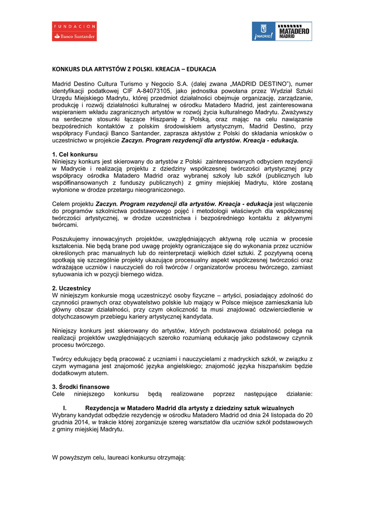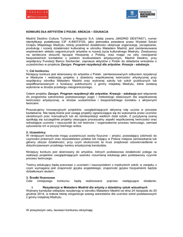 KONKURS DLA ARTYSTÓW Z POLSKI. KREACJA – EDUKACJA Madrid Destino Cultura Turismo y Negocio S.A. (dalej zwana „MADRID DESTINO”), numer identyfikacji podatkowej CIF A-84073105, jako jednostka powołana przez Wydział Sztuki Urzędu Miejskiego Madrytu, której przedmiot działalności obejmuje organizację, zarządzanie, produkcję i rozwój działalności kulturalnej w ośrodku Matadero Madrid, jest zainteresowana wspieraniem wkładu zagranicznych artystów w rozwój życia kulturalnego Madrytu. Zważywszy na serdeczne stosunki łączące Hiszpanię z Polską, oraz mając na celu nawiązanie bezpośrednich kontaktów z polskim środowiskiem artystycznym, Madrid Destino, przy współpracy Fundacji Banco Santander, zaprasza aktystów z Polski do składania wniosków o uczestnictwo w projekcie Zaczyn. Program rezydencji dla artystów. Kreacja - edukacja. 1. Cel konkursu Niniejszy konkurs jest skierowany do artystów z Polski zainteresowanych odbyciem rezydencji w Madrycie i realizacją projektu z dziedziny współczesnej twórczości artystycznej przy współpracy ośrodka Matadero Madrid oraz wybranej szkoły lub szkół (publicznych lub współfinansowanych z funduszy publicznych) z gminy miejskiej Madrytu, które zostaną wyłonione w drodze przetargu nieograniczonego. Celem projektu Zaczyn. Program rezydencji dla artystów. Kreacja - edukacja jest włączenie do programów szkolnictwa podstawowego pojęć i metodologii właściwych dla współczesnej twórczości artystycznej, w drodze uczestnictwa i bezpośredniego kontaktu z aktywnymi twórcami. Poszukujemy innowacyjnych projektów, uwzględniających aktywną rolę ucznia w procesie kształcenia. Nie będą brane pod uwagę projekty ograniczające się do wykonania przez uczniów określonych prac manualnych lub do reinterpretacji wielkich dzieł sztuki. Z pozytywną oceną spotkają się szczególnie projekty ukazujące procesualny aspekt współczesnej twórczości oraz wdrażające uczniów i nauczycieli do roli twórców / organizatorów procesu twórczego, zamiast sytuowania ich w pozycji biernego widza. 2. Uczestnicy W niniejszym konkursie mogą uczestniczyć osoby fizyczne – artyści, posiadający zdolność do czynności prawnych oraz obywatelstwo polskie lub mający w Polsce miejsce zamieszkania lub główny obszar działalności, przy czym okoliczność ta musi znajdować odzwierciedlenie w dotychczasowym przebiegu kariery artystycznej kandydata. Niniejszy konkurs jest skierowany do artystów, których podstawowa działalność polega na realizacji projektów uwzględniających szeroko rozumianą edukację jako podstawowy czynnik procesu twórczego. Twórcy edukujący będą pracować z uczniami i nauczycielami z madryckich szkół, w związku z czym wymagana jest znajomość języka angielskiego; znajomość języka hiszpańskim będzie dodatkowym atutem. 3. Środki finansowe Cele niniejszego konkursu będą realizowane poprzez następujące działanie: I. Rezydencja w Matadero Madrid dla artysty z dziedziny sztuk wizualnych Wybrany kandydat odbędzie rezydencję w ośrodku Matadero Madrid od dnia 24 listopada do 20 grudnia 2014, w trakcie której zorganizuje szereg warsztatów dla uczniów szkół podstawowych z gminy miejskiej Madrytu. W powyższym celu, laureaci konkursu otrzymają: • Wynagrodzenie w wysokości 1.200 euro, w które wliczone są koszty utrzymania. Od powyższej kwoty odliczone zostaną podatki i inne potrącenia, zgodnie z obowiązującymi przepisami • Bilet lotniczy na przelot z Polski do Hiszpanii i z powrotem • Zakwaterowanie na koszt Matadero Madrid w mieszkaniu usytuowanym w dzielnicy Arganzuela • Ponadto, można uzyskać dodatkowo do 1.000 euro na pokrycie kosztów produkcji artystycznej (n.p. koszty podróży uczniów). Środkami tymi zarządzać będą pracownicy MADRID DESTINO Powyższy budżet będzie zarządzany przez MADRID DESTINO, zgodnie ze zwyczajowymi procedurami. Charakterystyka pomieszczeń i innych środków technicznych udostępnianych przez Matadero Madrid: • Dostęp do Sali Warsztatowej w celu odbycia zajęć z uczniami wybranych szkół • Możliwość korzystania z pomieszczenia z dostępem do Internetu w Biurze Koordynacji ośrodka Matadero Madrid • Wsparcie ze strony specjalisty w dziedzinie współczesnej twórczości i edukacji, odpowiedzialnego za aspekt organizacyjny pobytu i za wyniki warsztatów • Możliwość korzystania ze sprzętu znajdującego się w posiadaniu Matadero Madrid, po uprzednim zgłoszeniu zapotrzebowania oraz w miarę dostępności sprzętu Wybrany kandydat będzie zobowiązany do przestrzegania wewnętrznych norm korzystania z ośrodka Matadero (godziny pracy, protokół bezpieczeństwa, zasady korzystania z dostępnych materiałów i pomieszczeń, itp.). 4. Wymagana dokumentacja i termin składania wniosków Kandydaci zobowiązani są do złożenia następującej dokumentacji: • Wypełniony formularz zgłoszenia (patrz Załącznik I). • Opis projektu (od 500 do 1000 słów), zawierający następujące informacje: 1. Przedział wiekowy, do którego skierowany jest projekt, zważywszy, że nauczaniem podstawowym w Hiszpanii objęte są dzieci w wieku od 6 do 12 lat 2. Plan ogólny i harmonogram projektu, z uwzględnieniem m.in. liczby zajęć i czasu ich trwania (biorąc pod uwagę, że zajęcia szkolne odbywają się w godzinach 9 -16) 3. Szacunkowe koszty projektu i opis niezbędnych materiałów, do zatwierdzenia przez MADRID DESTINO • Krótki życiorys wnioskodawcy: 500 słów. • W razie potrzeby, można załączyć dodatkowe dokumenty (nie więcej niż 3) związane z projektem - mogą to być zarówno materiały graficzne jak i teksty (do 500 słów każdy). • List motywacyjny kandydata. Oprócz powyższych dokumentów, niezbędnych do wzięcia udziału w konkursie, wybrani kandydaci będą musieli dostarczyć: • Kopię paszportu •Oświadczenie potwierdzające brak okoliczności wskazanych w art. 60 Real Decreto L