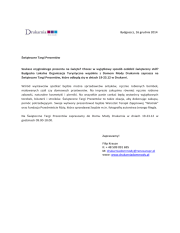 Bydgoszcz, 16 grudnia 2014 Świąteczne Targi Prezentów Szukasz oryginalnego prezentu na święta? Chcesz w wyjątkowy sposób ozdobić świąteczny stół? Bydgoska Lokalna Organizacja Turystyczna wspólnie z Domem Mody Drukarnia zaprasza na Świąteczne Targi Prezentów, które odbędą się w dniach 19-23.12 w Drukarni. Wśród wystawców spotkać będzie można sprzedawców antyków, ręcznie robionych bombek, malowanych szali czy domowych przetworów. Na imprezie zakupimy również ręcznie robione zabawki, naturalne kosmetyki i pierniki. Na wszystkie panie czekać będą wytwórcy wyjątkowych torebek, biżuterii i stroików. Świąteczne Targi Prezentów to także okazja, aby dokonując zakupu, pomóc potrzebującym. Swoje wytwory prezentować będzie Warsztat Terapii Zajęciowej "Wiatrak" oraz fundacja Przedmieście Róży, która sprzedawać będzie m.in. fotografię autorstwa Jerzego Riegla. Na Świąteczne Targi Prezentów zapraszamy do Domu Mody Drukarnia w dniach 19-23.12 w godzinach 09.00-18.00. Zapraszamy! Filip Krauze K: + 48 509 091 695 M: [email protected] www: www.drukarniadommody.pl