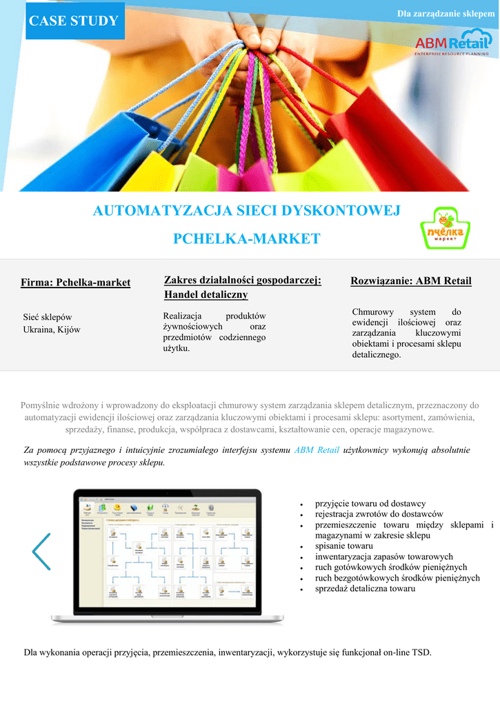 Dla zarządzanie sklepem CASE STUDY AUTOMATYZACJA SIECI DYSKONTOWEJ PCHELKA-MARKET Firma: Pchelka-market Zakres działalności gospodarczej: Handel detaliczny Rozwiązanie: ABM Retail ______________ Sieć sklepów Ukraina, Kijów Realizacja produktów żywnościowych oraz przedmiotów codziennego użytku. Chmurowy system do ewidencji ilościowej oraz zarządzania kluczowymi obiektami i procesami sklepu detalicznego. ……………………………… Pomyślnie wdrożony i wprowadzony do eksploatacji chmurowy system zarządzania sklepem detalicznym, przeznaczony do automatyzacji ewidencji ilościowej oraz zarządzania kluczowymi obiektami i procesami sklepu: asortyment, zamówienia, sprzedaży, finanse, produkcja, współpraca z dostawcami, kształtowanie cen, operacje magazynowe. Za pomocą przyjaznego i intuicyjnie zrozumiałego interfejsu systemu ABM Retail użytkownicy wykonują absolutnie wszystkie podstawowe procesy sklepu. przyjęcie towaru od dostawcy rejestracja zwrotów do dostawców przemieszczenie towaru między sklepami i magazynami w zakresie sklepu spisanie towaru inwentaryzacja zapasów towarowych ruch gotówkowych środków pieniężnych ruch bezgotówkowych środków pieniężnych sprzedaż detaliczna towaru Dla wykonania operacji przyjęcia, przemieszczenia, inwentaryzacji, wykorzystuje się funkcjonał on-line TSD. Wdrożenie ABM Retail Zarząd sieci aktywnie wykorzystuje system zarządzania: Zarządzanie zapasami i rozliczeniami wzajemnymi z kontrahentami: zarządzają zamówieniami i dostawami (harmonogramami dostaw, kalendarzem zamówień i dostaw dla operatywnego formowania zamówień dostawcy, automatycznie obliczają zapotrzebowanie na towar); dla kontroli cen i asortymentu dostaw przeprowadza się automatyczne prowadzenie specyfikacji dostawców; za pomocą systemu ABM Retail formuje się harmonogram płatności, formują się i wyładowują się do klient-banku dokumenty płatnościowe; w systemie ABM Retail są prowadzone umowy marketingowe, automatycznie są obliczane retrobonusy i formuje się pakiet dokumentów. Zarządzanie asortymentem: określenie aktywnego asortymentu dla sklepów; rejestracja minimalnej pozostałości towaru (zapas ubezpieczeniowy). Zarządzanie kształtowaniem cen: Za pomocą systemu ABM Retail został otrzymany elastyczny mechanizm zarządzania kształtowaniem cen. indywidualne zasady marż na grupy towarów i poszczególne; automatyczne obliczanie cen sprzedaży; kontrola według cen orientacyjnych i cen od producenta; ustawienie cen promocyjnych. Zarządzanie produkcja własną: kulinaria, kawiarnia, dział mięsny, piekarnia. wykorzystanie kart technologicznych; produkcja wieloprzedziałowa; zapełnienie produkcji od sprzedaży. Wdrożenie ABM Retail Przez ekspertów ABM Cloud została przeprowadzona integracja z 1C Księgowość, co pozwoliło istotnie zaoszczędzić czas na odzwierciedlenie pierwotnych dokumentów w reglamentowanej ewidencji. Prowadzi się operatywne i jakościowe wsparcie. Jesteśmy gotowi rekomendować firmę ABM Cloud, jako wiarygodnego partnera, który bierze pod uwagę interesy Klientów. ABM Cloud - innowacyjna firma, która świadczy profesjonalne IT-usługi w dziedzinie opracowania, projektowania i wdrożenia rozwiązań programowych w chmurze dla zarządzania zapasami, sklepami i transportem. Rosja Ukraina Kazachstan Polska Tel: +7 (495) 204-15-09 Tel: +380 (44) 207-39-55 Tel: +7 (727) 311-03-51 Tel: +48 (22) 206-21-05 [email protected] www.abmcloud.com