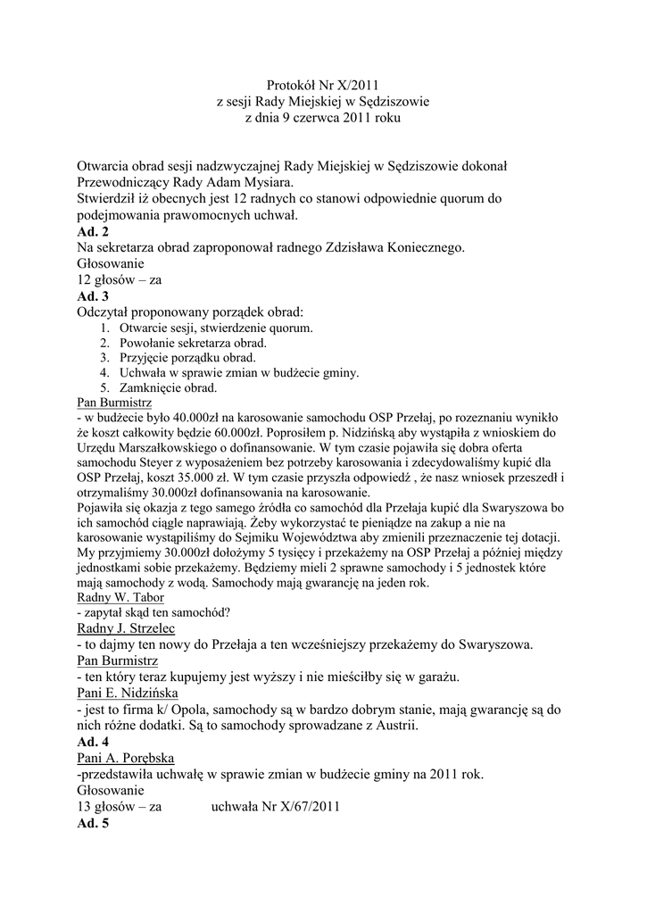 Protokół Nr X/2011 z sesji Rady Miejskiej w Sędziszowie z dnia 9 czerwca 2011 roku Otwarcia obrad sesji nadzwyczajnej Rady Miejskiej w Sędziszowie dokonał Przewodniczący Rady Adam Mysiara. Stwierdził iż obecnych jest 12 radnych co stanowi odpowiednie quorum do podejmowania prawomocnych uchwał. Ad. 2 Na sekretarza obrad zaproponował radnego Zdzisława Koniecznego. Głosowanie 12 głosów – za Ad. 3 Odczytał proponowany porządek obrad: 1. Otwarcie sesji, stwierdzenie quorum. 2. Powołanie sekretarza obrad. 3. Przyjęcie porządku obrad. 4. Uchwała w sprawie zmian w budżecie gminy. 5. Zamknięcie obrad. Pan Burmistrz - w budżecie było 40.000zł na karosowanie samochodu OSP Przełaj, po rozeznaniu wynikło że koszt całkowity będzie 60.000zł. Poprosiłem p. Nidzińską aby wystąpiła z wnioskiem do Urzędu Marszałkowskiego o dofinansowanie. W tym czasie pojawiła się dobra oferta samochodu Steyer z wyposażeniem bez potrzeby karosowania i zdecydowaliśmy kupić dla OSP Przełaj, koszt 35.000 zł. W tym czasie przyszła odpowiedź , że nasz wniosek przeszedł i otrzymaliśmy 30.000zł dofinansowania na karosowanie. Pojawiła się okazja z tego samego źródła co samochód dla Przełaja kupić dla Swaryszowa bo ich samochód ciągle naprawiają. Żeby wykorzystać te pieniądze na zakup a nie na karosowanie wystąpiliśmy do Sejmiku Województwa aby zmienili przeznaczenie tej dotacji. My przyjmiemy 30.000zł dołożymy 5 tysięcy i przekażemy na OSP Przełaj a później między jednostkami sobie przekażemy. Będziemy mieli 2 sprawne samochody i 5 jednostek które mają samochody z wodą. Samochody mają gwarancję na jeden rok. Radny W. Tabor - zapytał skąd ten samochód? Radny J. Strzelec - to dajmy ten nowy do Przełaja a ten wcześniejszy przekażemy do Swaryszowa. Pan Burmistrz - ten który teraz kupujemy jest wyższy i nie mieściłby się w garażu. Pani E. Nidzińska - jest to firma k/ Opola, samochody są w bardzo dobrym stanie, mają gwarancję są do nich różne dodatki. Są to samochody sprowadzane z Austrii. Ad. 4 Pani A. Porębska -przedstawiła uchwałę w sprawie zmian w budżecie gminy na 2011 rok. Głosowanie 13 głosów – za uchwała Nr X/67/2011 Ad. 5 Przewodniczący zamknął obrady nadzwyczajnej sesji Rady Miejskiej w Sędziszowie. Na tym protokół zakończono Protokołował Sekretarz Przewodniczył