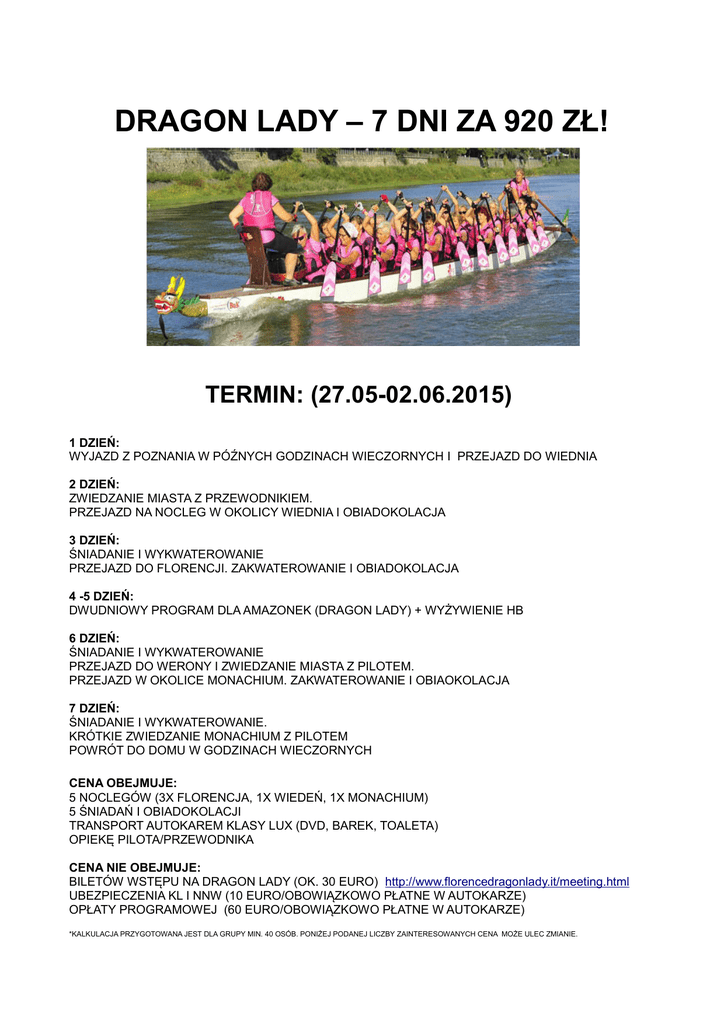 DRAGON LADY – 7 DNI ZA 920 ZŁ! TERMIN: (27.05-02.06.2015) 1 DZIEŃ: WYJAZD Z POZNANIA W PÓŹNYCH GODZINACH WIECZORNYCH I PRZEJAZD DO WIEDNIA 2 DZIEŃ: ZWIEDZANIE MIASTA Z PRZEWODNIKIEM. PRZEJAZD NA NOCLEG W OKOLICY WIEDNIA I OBIADOKOLACJA 3 DZIEŃ: ŚNIADANIE I WYKWATEROWANIE PRZEJAZD DO FLORENCJI. ZAKWATEROWANIE I OBIADOKOLACJA 4 -5 DZIEŃ: DWUDNIOWY PROGRAM DLA AMAZONEK (DRAGON LADY) + WYŻYWIENIE HB 6 DZIEŃ: ŚNIADANIE I WYKWATEROWANIE PRZEJAZD DO WERONY I ZWIEDZANIE MIASTA Z PILOTEM. PRZEJAZD W OKOLICE MONACHIUM. ZAKWATEROWANIE I OBIAOKOLACJA 7 DZIEŃ: ŚNIADANIE I WYKWATEROWANIE. KRÓTKIE ZWIEDZANIE MONACHIUM Z PILOTEM POWRÓT DO DOMU W GODZINACH WIECZORNYCH CENA OBEJMUJE: 5 NOCLEGÓW (3X FLORENCJA, 1X WIEDEŃ, 1X MONACHIUM) 5 ŚNIADAŃ I OBIADOKOLACJI TRANSPORT AUTOKAREM KLASY LUX (DVD, BAREK, TOALETA) OPIEKĘ PILOTA/PRZEWODNIKA CENA NIE OBEJMUJE: BILETÓW WSTĘPU NA DRAGON LADY (OK. 30 EURO) http://www.florencedragonlady.it/meeting.html UBEZPIECZENIA KL I NNW (10 EURO/OBOWIĄZKOWO PŁATNE W AUTOKARZE) OPŁATY PROGRAMOWEJ (60 EURO/OBOWIĄZKOWO PŁATNE W AUTOKARZE) *KALKULACJA PRZYGOTOWANA JEST DLA GRUPY MIN. 40 OSÓB. PONIŻEJ PODANEJ LICZBY ZAINTERESOWANYCH CENA MOŻE ULEC ZMIANIE.