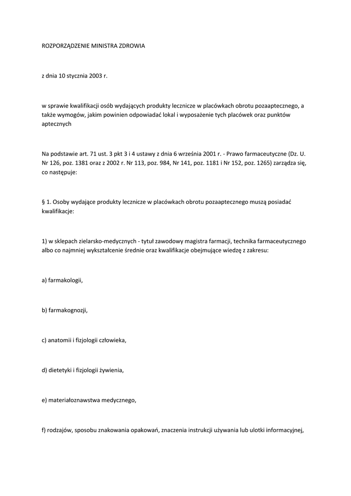 ROZPORZĄDZENIE MINISTRA ZDROWIA z dnia 10 stycznia 2003 r. w sprawie kwalifikacji osób wydających produkty lecznicze w placówkach obrotu pozaaptecznego, a także wymogów, jakim powinien odpowiadać lokal i wyposażenie tych placówek oraz punktów aptecznych Na podstawie art. 71 ust. 3 pkt 3 i 4 ustawy z dnia 6 września 2001 r. - Prawo farmaceutyczne (Dz. U. Nr 126, poz. 1381 oraz z 2002 r. Nr 113, poz. 984, Nr 141, poz. 1181 i Nr 152, poz. 1265) zarządza się, co następuje: § 1. Osoby wydające produkty lecznicze w placówkach obrotu pozaaptecznego muszą posiadać kwalifikacje: 1) w sklepach zielarsko-medycznych - tytuł zawodowy magistra farmacji, technika farmaceutycznego albo co najmniej wykształcenie średnie oraz kwalifikacje obejmujące wiedzę z zakresu: a) farmakologii, b) farmakognozji, c) anatomii i fizjologii człowieka, d) dietetyki i fizjologii żywienia, e) materiałoznawstwa medycznego, f) rodzajów, sposobu znakowania opakowań, znaczenia instrukcji używania lub ulotki informacyjnej, g) zasad prawidłowego przechowywania i obrotu produktami leczniczymi i wyrobami medycznymi oraz postępowania w przypadku reklamacji i wstrzymania lub wycofania z obrotu, h) udzielania pierwszej pomocy przedmedycznej - nabytą w ramach kursu II stopnia z zakresu towaroznawstwa zielarskiego według programu zatwierdzonego przez ministra właściwego do spraw zdrowia; 2) w sklepach specjalistycznego zaopatrzenia medycznego - tytuł zawodowy magistra farmacji, magistra rehabilitacji, magistra fizjoterapii, technika farmaceutycznego, technika fizjoterapii albo co najmniej wykształcenie średnie oraz kwalifikacje obejmujące podstawową wiedzę z zakresu: a) podstawowych grup wyrobów medycznych, b) podstawowych surowców stosowanych do produkcji wyrobów medycznych, c) anatomii i fizjologii człowieka, d) zasad prawidłowego przechowywania i obrotu poszczególnych grup asortymentowych wyrobów medycznych, e) sposobów wyjaławiania wyrobów medycznych, f) rodzajów, sposobu znakowania opakowań, znaczenia instrukcji używania lub ulotki informacyjnej, g) postępowania w przypadku reklamacji oraz wstrzymania lub wycofania z obrotu wyrobów medycznych, h) udzielania pierwszej pomocy przedmedycznej - nabytą w ramach kursu z zakresu towaroznawstwa materiałów medycznych według programu zatwierdzonego przez ministra właściwego do spraw zdrowia; 3) w sklepach zielarsko-drogeryjnych - tytuł zawodowy magistra farmacji, technika farmaceutycznego albo co najmniej wykształcenie średnie oraz kwalifikacje obejmujące wiedzę z zakresu: a) leczniczych surowców roślinnych, b) chemii związków naturalnych, c) postaci leku roślinnego, d) wskazań i przeciwwskazań do zastosowania w lecznictwie ziół i preparatów pochodzenia roślinnego, e) udzielania pierwszej pomocy przedmedycznej, f) zasad prawidłowego przechowywania i obrotu produktami leczniczymi roślinnymi oraz postępowania w przypadku reklamacji i wstrzymania lub wycofania z obrotu - nabytą w ramach kursu I stopnia z zakresu towaroznawstwa zielarskiego według programu zatwierdzonego przez ministra właściwego do spraw zdrowia; 4) w sklepach zoologicznych: a) tytuł zawodowy lekarza weterynarii, technika weterynarii, inżyniera zootechnika oraz magistra zootechniki albo co najmniej wykształcenie średnie oraz kwalifikacje obejmujące podstawową wiedzę z zakresu: - stosowania produktów leczniczych weterynaryjnych, - znajomości wskazań i przeciwwskazań sprzedawanych produktów leczniczych weterynaryjnych i postępowania w przypadku wystąpienia działań niepożądanych, - warunków przechowywania produktów leczniczych weterynaryjnych, - postępowania w przypadku reklamacji oraz wstrzymania lub wycofania z obrotu produktów leczniczych weterynaryjnych nabytą w ramach kursu specjalistycznego według programu zatwierdzonego przez ministra właściwego do spraw zdrowia w porozumieniu z ministrem właściwym do spraw rolnictwa, b) co najmniej 5 letni staż pracy w sklepach zoologicznych oraz kwalifikacje obejmujące podstawową wiedzę nabytą na kursie, o którym mowa w lit. a. § 2. Lokal punktu aptecznego musi odpowiadać następującym wymogom: 1) stanowić odrębny budynek lub wydzielony lokal; 2) być wyposażony w odpowiednie urządzenia wentylacyjne; 3) ściany i podłogi lokalu muszą być gładkie, łatwo zmywalne i łatwe do utrzymania w czystości, 4) zapewniać przechowywanie produktów leczniczych w sposób gwarantujący zachowanie ich właściwej jakości określonej przez wytwórcę lub farmakopeę, ze szczególnym uwzględnieniem zakresu temperatury. § 3. 1. W skład powierzchni punktu aptecznego wchodzą: 1) izba ekspedycyjna; 2) magazyn lub magazyny służące do przechowywania produktów leczniczych; 3) komora przyjęć, która może być usytuowana w pobliżu wejścia przeznaczonego dla dostaw towaru i dla personelu; w komorze przyjęć może być usytuowana szatnia dla personelu z odrębnymi szafami na okrycia wierzchnie, fartuchy i obuwie w ilości zależnej od zatrudnionego personelu; 4) archiwum; 5) pomieszczenie sanitarne, w którym może być przechowywany sprzęt do utrzymywania porządku; 6) powierzchnia komunikacyjna, w tym korytarze. 2. Lokal punktu aptecznego powinien być usytuowany na pierwszej kondygnacji nadziemnej budynku, z zastrzeżeniem ust. 3 i 4. 3. Izba ekspedycyjna punktu aptecznego nie może stanowić pomieszczenia przechodniego i musi być usytuowana na pierwszej kondygnacji nadziemnej budynku tak, aby poziom podłogi tego pomieszczenia znajdował się na poziomie lub powyżej poziomu urządzonego terenu budynku. 4. Dopuszcza się usytuowanie pozostałych pomieszczeń punktu aptecznego na innej kondygnacji pod warunkiem, że lokal punktu aptecznego stanowić będzie organizacyjnie i funkcjonalnie wydzieloną całość tak, aby każde z pomieszczeń wchodzących w skład punktu aptecznego dostępne było bez konieczności wychodzenia na zewnątrz. § 4. 1. Do punktu apteczneg
