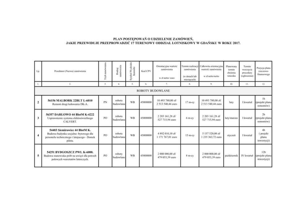2. 3. 4. Symbol Wydziału/ Komórki 1. Przedmiot (Nazwa) zamówienia Rodzaj zamówienia Lp. Tryb zamówienia PLAN POSTĘPOWAŃ O UDZIELENIE ZAMÓWIEŃ, JAKIE PRZEWIDUJE PRZEPROWADZIĆ 17 TERENOWY ODDZIAŁ LOTNISKOWY W GDAŃSKU W ROKU 2017. Kod CPV 5. 6. Orientacyjna wartość zamówienia Termin realizacji Całkowita orientacyjna zamówienia wartość zamówienia w zł netto/ euro (w dniach lub miesiącach) w zł netto/netto Planowany termin złożenia wniosku Termin wszczęcia procedury (ogłoszenia) Pozycja planu rzeczowofinansowego 7. 8. 9. 10. 11. 12. ROBOTY BUDOWLANE 2 56156 MALBORK 22BLT L-6010 Remont drogi kołowania DK-A. PN robota budowlana WB 45000000 10 493 780,00 zł/ 2 513 540,44 euro 17 m-cy 10 493 780,00 zł/ 2 513 540,44 euro luty I kwartał 1b (projekt planu remontów) PO robota budowlana WB 45000000 2 203 161,28 zł/ 527 715,94 euro 6 m-cy 2 203 161,28 zł/ 527 715,94 euro luty/marzec I kwartał 2b (projekt planu remontów) PO robota budowlana WB 45000000 4 892 010,10 zł/ 1 171 767,01 euro 15 m-cy 5 157 520,00 zł/ 1 235 363,72 euro styczeń I kwartał 4b ( projekt planu inwestycji) PO roboty budowlane WB 45000000 2 000 000,00 zł/ 479 053,39 euro 8 m-cy 2 000 000,00 zł/ 479 053,39 euro październik 56357 DARŁOWO 44 BlotM K-4222 3 Usprawnienie systemu elektroświetlnego CALVERT. 54403 Siemirowice 44 BlotM K. 4 Budowa budynku socjalno -bytowego dla personelu technicznego i latajacego - Domek pilota. 54251 BYDGOSZCZ PWL K-6000. 5 Budowa stanowiska prób na uwięzi dla potrzeb polowych warsztatów lotniczych. 12b IV kwartał (projekt planu inwestycji) USŁUGI 54108 MIROSŁAWIEC 12 BBSP K-6009. 7 Opracowanie programu intwestycji na budowę wielofunkcyjnego portu lotniczego wraz ze strażnicą wojskowej straży pożarnej. PO usługi SPI 71320000 81 300,81 zł/ 19 473,72 euro 4 m-ce 222 865,88 zł/ 53 382,33 euro luty I kwartał 8a (projekt planu inwestycji) PO usługi SPI 71320000 81 300,81 zł/ 19 473,72 euro 4 m-ce 222 865,88 zł/ 53 382,33 euro luty I kwartał 9a (projekt planu inwestycji) PO usługi SPI 71320000 14 658,93 zł/ 3 511,21 euro 9 m-cy 222 865,88 zł/ 53 382,33 euro kwiecień/ maj II kwartał 10b (projekt planu inwestycji) PO usługi SPI 71320000 29 317,86 zł/ 7 022,41 euro 9 m-cy 222 865,88 zł/ 53 382,33 euro kwiecień/ maj II kwartał 11a (projekt planu inwestycji) PO usługi SPI 71320000 16 287,47 zł/ 3 901,28 euro 5 m-cy 222 865,88 zł/ 53 382,33 euro kwiecień II kwartał 13a (projekt planu inwestycji) 54109 MIROSŁAWIEC 12 BBSP K-6009. 8 Opracowanie programu intwestycji na budowę 2 hangarów technicznych wraz z infrastrukturą towarzyszącą 54039 POWIDZ K-6015. 9 10 Opracowanie dokumentacji projektowej na przygotowanie infrastruktury dla inwestycji naziemnych mobilnych systemów nawigacyjnych TACAN. 54079 ŚWIDWIN, INOWROCŁAW. Opracowanie dokumentacji projektowej na przygotowanie infrastruktury dla instalacji naziemnych mobilnych systemów nawigacyjnych TACAN. 54042 POWIDZ 33 Blot K-6015. Opracowanie dokumentacji projektowej na wykonanie zdalnego sterowania oświetleniem 11 i monitoringu oświetlenia płaszczyzn samolotów APRON 1 (PPSTS), APRON 2 (CPPS), APRON 3 (GMP II). DOSTAWY 12 54038 12 LOTNISK, WYBRANE KOMPLEKSY. Przygotowanie infrastruktury dla potrzeb systemu ILS z DME wraz z zakupem i montażem. PO PN - przetarg nieograniczony; PO - przetarg ograniczony. dostawa SPI/WB 44 208 008,00 zł/ 10 588 998,06 euro 45 m-cy 44 208 008,00 zł/ październik 10 588 998,06 euro 5b IV kwartał (projekt planu inwestycji)