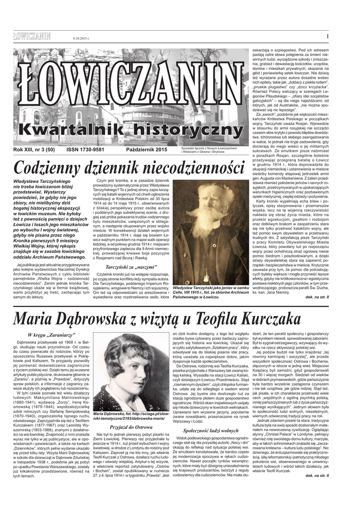 I 8.10.2015 r. Rok XIII, nr 3 (50) ISSN 1730-9581 Październik 2015 oskarżają o szpiegostwo. Pod ich adresem padają ostre słowa potępienia za śmierć niewinnych ludzi, wyrządzone szkody i zniszczenia, grabież i dewastację kościołów, urzędów, domów i mieszkań prywatnych, skazanie na głód i poniewierkę setek łowiczan. Nie dziwią też wyrażane przez autora dosadne wobec nich epitety, takie jak: „żołdacy z piekła rodem”, „pruskie plugastwo” czy „dzicz krzyżacka”. Również Polacy walczący w szeregach Legionów Piłsudskiego – „ofiary idei socjalistów galicyjskich” – są dla niego najeźdźcami, od których, jak od Austriaków, „nie można spodziewać się nic lepszego”. Za „swoich”, podobnie jak większość mieszkańców Królestwa Polskiego w początkach wojny, Tarczyński uważa Rosjan. Wprawdzie w stosunku do armii rosyjskiej nie szczędzi czasem słów krytyki z powodu błędów dowództwa, tchórzostwa lub słabego zaangażowania w walce, to jednak nie kryje zadowolenia, gdy docierają do niego wieści o jej militarnych Sprzedaż łącznie z Nowym Łowiczaninem sukcesach. Ze smutkiem pisze natomiast i Wieściami z Głowna i Strykowa o porażkach Rosjan, szczególnie boleśnie przeżywając przegraną batalię o Łowicz w grudniu 1914 r., która doprowadziła do okupacji niemieckiej i ustanowienia w mieście siedziby komendy etapowej jednostek armii gen. Augusta von Mackensena. Z żalem przedstawia również położenie jeńców i rannych rosyjskich, przetrzymywanych w upokarzających warunkach higienicznych oraz pozbawionych opieki medycznej, ciepłej odzieży i pożywienia. Karty kroniki wypełniają echa bitew i potyczek, opisy stacjonowania i przemarszów wojska, lecz na tę wojenną rzeczywistość nakłada się obraz życia miasta, które na przekór egzekucjom, gwałtom i rozbojom oraz dotkliwym brakom w zaopatrzeniu stara się nie tylko przetrwać kataklizm wojny, ale też pomóc swym obywatelom w przetrwaniu trudnych dni. Z satysfakcją pisze Tarczyński o pracy Komitetu Obywatelskiego Miasta Łowicza, który powołany tuż po rozpoczęciu wojny przez ochotniczą straż ogniową niesie pomoc biednym i poszkodowanym, a dzięki straży obywatelskiej stara się zapewnić porządek i bezpieczeństwa w mieście. Krytycznie zauważa przy tym, że pomoc dla potrzebujących byłaby większa i mogła przynieść lepsze efekty, gdyby nie krótkowzroczna i egoistyczna postawa niektórych jego członków, w tym przeWładysław Tarczyński jako jeniec w zamku wodniczącego, proboszcza parafii Św. Ducha, Celle, VIII 1915 r., fot. ze zbiorów Archiwum ks. kan. Jana Niemiry. Państwowego w Łowiczu. dok. na str. II Codzienny dziennik niecodzienności Władysława Tarczyńskiego nie trzeba łowiczanom bliżej przedstawiać. Wystarczy powiedzieć, że gdyby nie jego zbiory, nie mielibyśmy dziś bogatej historycznej ekspozycji w łowickim muzeum. Nie byłoby też z pewnością pamięci o dziejach Łowicza i losach jego mieszkańców po wybuchu I wojny światowej, gdyby nie pisana przez niego Kronika pierwszych 9 miesięcy Wielkiej Wojny, której rękopis znajduje się w zasobie łowickiego oddziału Archiwum Państwowego. Czym jest kronika, a w zasadzie dziennik prowadzony systematycznie przez Władysława Tarczyńskiego? To z jednej strony zapis toczących się batalii wojennych od chwili ogłoszenia mobilizacji w Królestwie Polskim od 30 lipca 1914 aż do 14 maja 1915 r., obserwowanych z bliskiej perspektywy przez osobę autora i poddanych jego subiektywnej ocenie, z drugiej zaś próba pokazania trudów codziennego bytu mieszkańców, uwięzionych w obleganym, a następnie okupowanym przez wojsko mieście. W konsekwencji działań wojennych w październiku 1914 r. staje się bowiem Łowicz ważnym punktem na mapie walk operacji łódzkiej, a od połowy grudnia 1914 r. miejscem przyfrontowego zaplecza dla 9 Armii niemieckiej, prowadzącej krwawe boje pozycyjne z Rosjanami nad Bzurą i Rawką. Jej publikacja jest aktualnie przygotowywana jako kolejne wydawnictwo Naczelnej Dyrekcji Archiwów Państwowych z cyklu biblioteki pamiętników „Wielka Wojna – codzienność niecodzienności”. Zanim jednak kronika Tarczyńskiego ukaże się w formie książkowej, warto przybliżyć jej treść, zachęcając tym samym do lektury. Tarczyński za „naszymi” Czytelnik kroniki już na wstępie rozpoznaje, po czyjej stronie konfliktu leży sympatia autora. Dla Tarczyńskiego, poddanego Imperium Rosyjskiemu, wrogowie to Niemcy i ich sojusznicy. Oni też są odpowiedzialni za aresztowania i wysiedlenia oraz rozstrzeliwania osób, które Maria Dąbrowska z wizytą u Teofila Kurczaka W kręgu „Zaraniarzy” Dąbrowska przebywała od 1908 r. w Belgii, studiując nauki przyrodnicze. Od czasu do czasu powracała do rodziców, którzy po opuszczeniu Russowa przebywali w Poklękowie pod Kaliszem. Te przyjazdy pozwoliły jej porównać doświadczenia zagraniczne z życiem polskiej wsi. Dzięki temu jej wczesne artykuły publicystyczne, drukowane głównie w „Zaraniu”, a później w „Prawdzie”, dotyczyły spraw polskich, a informacje z zagranicy zawsze służyły ich pogłębieniu lub rozszerzeniu. W tym czasie poznała też wielu działaczy ludowych: Maksymiliana Malinowskiego (1880-1941), wydawcę „Zorzy”, Irenę Kosmowską (1879-1944), współzałożycielkę szkół rolniczych czy Stefanię Sempołowską (1870-1940), organizatorkę tajnego ruchu oświatowego. Zaprzyjaźniła się też z Teofilem Kurczakiem (1877-1967) oraz Leonildą Wyszomirską (1903-1988), znanymi z działalności na wsi łowickiej. Znajomość z nimi znalazła wyraz nie tylko w jej publicystyce, ale w opowiadaniach i powieściach, a także na kartach „Dzienników”, których pełne wydanie ukazało się przed kilku laty. Wizyta Marii Dąbrowskiej w szkole dla dziewcząt w Dąbrowie Zduńskiej w listopadzie 1938 r., podobnie jak jej pobyt po upadku Powstania Warszaws
