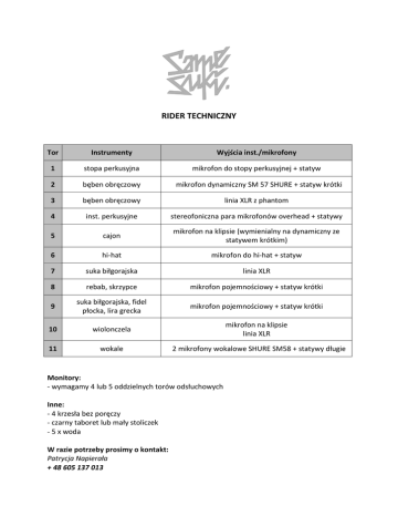 RIDER TECHNICZNY Tor Instrumenty Wyjścia inst./mikrofony 1 stopa perkusyjna mikrofon do stopy perkusyjnej + statyw 2 bęben obręczowy 3 bęben obręczowy linia XLR z phantom 4 inst. perkusyjne stereofoniczna para mikrofonów overhead + statywy 5 cajon mikrofon na klipsie (wymienialny na dynamiczny ze statywem krótkim) 6 hi-hat mikrofon do hi-hat + statyw 7 suka biłgorajska linia XLR 8 rebab, skrzypce mikrofon pojemnościowy + statyw krótki 9 suka biłgorajska, fidel płocka, lira grecka mikrofon pojemnościowy + statyw krótki 10 wiolonczela mikrofon na klipsie linia XLR 11 wokale mikrofon dynamiczny SM 57 SHURE + statyw krótki 2 mikrofony wokalowe SHURE SM58 + statywy długie Monitory: - wymagamy 4 lub 5 oddzielnych torów odsłuchowych Inne: - 4 krzesła bez poręczy - czarny taboret lub mały stoliczek - 5 x woda W razie potrzeby prosimy o kontakt: Patrycja Napierała + 48 605 137 013