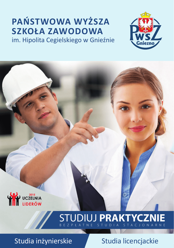 Państwowa Wyższa Szkoła Zawodowa im. Hipolita Cegielskiego w Gnieźnie STUDIUJ PRAKTYCZNIE b e z p ł a t n e Studia inżynierskie s t u d i a s t a c j o n a r n e Studia licencjackie PWSZ w Gnieźnie Gniezno pierwsza stolica Polski jedno z najstarszych miast w kraju, pełne zabytków, w którym historia spotyka się z nowoczesnością. Gniezno ma wiele walorów turystycznych oraz gospodarczych. Mieszkańcy „Grodu Lecha” prowadzą aktywne życie kulturalne. Państwowa Wyższa Szkoła Zawodowa im. Hipolita Cegielskiego w Gnieźnie PWSZ w Gnieźnie jest uczelnią publiczną, która została utworzona 1 lipca 2004 r. na podstawie rozporządzenia Rady Ministrów z dnia 22 czerwca 2004 r. (Dz. U. NR 150 poz.1572). PWSZ w Gnieźnie główne akcenty kładzie na: • kreatywność, która sprzyja tworzeniu nowych technologii • zdobywanie wiedzy i umiejętności w sposób praktyczny przez dostęp do nowoczesnej aparatury badawczej • partnerskie współdziałanie z otoczeniem, szczególnie z przedsiębiorcami Dzięki podpisanym umowom partnerskim studenci i pracownicy naukowi PWSZ w Gnieźnie mają możliwość kształcenia się poza granicami kraju oraz uczestniczenia we wspólnych projektach badawczych. Studenci mają możliwość odbycia praktyk, staży, czy też realizacji tematu pracy dyplomowej w firmach w całej Polsce a nawet za granicą. W ramach programów studiów Uczelnia realizuje dla swoich studentów wyjazdy studyjne do zakładów produkcyjnych i spotkania z pracodawcami. Spotkanie z przedstawicielami firmy Volkswagen Poznań, Kampus Uczelni 2015 r. Studenci transportu i ochrony środowiska w zakładzie produkującym kostkę brukową „Pozbruk”. Studenci zapoznali się z nowoczesną linią technologii oraz produkcji prefabrykatów betonowych STUDIUJ PRAKTYCZNIE b e z p ł a t n e s t u d i a s t a c j o n a r n e Studenci ochrony środowiska współuczestniczyli w latach 2012-2015 w projekcie naukowo-badawczym oznaczania fosforu ogólnego w próbkach gleby realizowanym dla Muzeum Archeologicznego w Biskupinie www.pwsz-gniezno.edu.pl Kierunki studiów inżynierskie • • • • • • elektronika i telekomunikacja informatyka inżynieria środowiska ochrona środowiska/technologia chemiczna* transport zarządzanie i inżynieria produkcji Studia stacjonarne bezpłatne • 3,5 roku (7 semestrów) Studia niestacjonarne płatne • 4 lata (8 semestrów) * po uzyskaniu zgody MNiSW licencjackie • pielęgniarstwo (stacjonarne) • fizjoterapia NOWY KIERUNEK • filologia angielska** Czy wiesz że, PWSZ w Gnieźnie współpracuje z Politechniką Poznańską, Uniwersytetem Ekonomicznym w Poznaniu, Uniwersytetem Kazimierza Wielkiego w Bydgoszczy. ** w przygotowaniu Studium podyplomowe „Zarządzanie środowiskiem” Prowadzimy również praktyczne kursy doskonalenia zawodowego z zakresu nowoczesnych technologii, ochrony środowiska, zarządzania dla nauczycieli oraz pracowników firm. Atuty Uczelni • Nie musisz płacić za naukę na studiach stacjonarnych (PWSZ w Gnieźnie to Uczelnia publiczna), możesz się ubiegać o pomoc materialną w formie stypendiów. • Gwarantujemy urozmaicony i ciekawy program studiów, który sprawi, że staniesz się specjalistą w danej dziedzinie kształcenia, jak również będziesz przygotowany do podjęcia studiów magisterskich w innych uczelniach akademickich; m.in. w Politechnice Poznańskiej. • Realizujemy kształcenie o profilu praktycznym zgodnie z nową ustawą „Prawo o szkolnictwie wyższym, nasi studenci odbywają co najmniej trzymiesięczne praktyki zawodowe. Ich celem jest uzupełnienie wiedzy zdobywanej na studiach i przygotowanie do przyszłej pracy. • Będziesz miał okazję uczyć się od profesorów z bogatym dorobkiem naukowym oraz młodych pracowników nauki, którzy realizują badania m.in. w poznańskich ośrodkach akademickich. • Zapewniamy komfortowe warunki studiowania z wykorzystaniem nowoczesnej bazy laboratoryjnej w Kampusie przy ul. Wrzesińskiej. Kampus Uczelni Laboratorium tworzyw sztucznych Państwowa Wyższa Szkoła Zawodowa im. Hipolita Cegielskiego w Gnieźnie Inżynier poszukiwany! Znaki szczególne ciekawość, logiczne myślenie, pomysłowość, kreatywność, praktyczne działanie, dokładność… Pomożemy Ci kształtować przyszłość! Politechnika Poznańska jest uczelnią patronacką dla PWSZ w Gnieźnie, stąd też programy studiów są w pełni zgodne z programami realizowanymi na wydziałach PP. Wielu pracowników dydaktycznych PWSZ w Gnieźnie realizuje prace naukowe w Politechnice Poznańskiej. Inżynier Elektroniki i telekomunikacji Specjalista od projektowania, konfigurowania, zarządzania i utrzymywania sieci komputerowych oraz infrastruktury sieciowej. Wie jak funkcjonuje telefonia komórkowa, telewizja, radio, komputery tablety, urządzenia elektroniczne codziennego użytku. Nie straszne mu sieci telekomunikacyjne – światłowodowe i bezprzewodowe oraz Internet rzeczy. Specjalność • Systemy i sieci teleinformatyczne Nasi absolwenci łatwo znajdują dobrze płatną pracę w firmach informatycznych, elektronicznych i telekomunikacyjnych. Studenci odbywają praktyki m.in. w firmie INEA. W 2014 r. odbyło się w Uczelni spotkanie studentów z pracownikami firmy Nokia. Inżynier Informatyki Specjalista w zakresie projektowania i wdrażania systemów informatycznych w różnych środowiskach, z wykorzystaniem najnowszych technologii informatycznych. Zna inteligentne instalacje i potrafi je zaprojektować. Wielość specjalności wyróżnia ten kierunek i daje możliwość realizacji własnej ścieżki kształcenia i pogłębiania zainteresowań. Specjalności studia stacjonarne • • • • systemy informatyczne mikroprocesorowe systemy automatyki mechatronika i układy mikroprocesorowe teleinformatyka i elektronika studia niestacjonarne • informatyka stosowana • inteligentne systemy sterowania Instytut Informatyki i Elektroniki współpracuje z wieloma firmami z bran