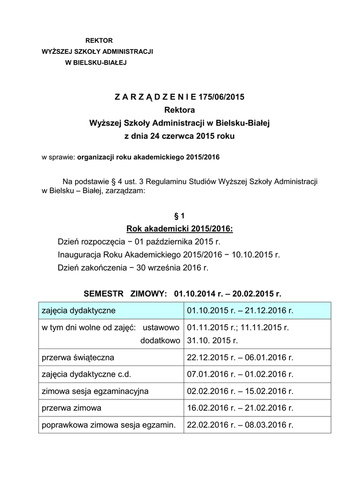 REKTOR WYśSZEJ SZKOŁY ADMINISTRACJI W BIELSKU-BIAŁEJ Z A R Z Ą D Z E N I E 175/06/2015 Rektora WyŜszej Szkoły Administracji w Bielsku-Białej z dnia 24 czerwca 2015 roku w sprawie: organizacji roku akademickiego 2015/2016 Na podstawie § 4 ust. 3 Regulaminu Studiów WyŜszej Szkoły Administracji w Bielsku – Białej, zarządzam: §1 Rok akademicki 2015/2016: Dzień rozpoczęcia − 01 października 2015 r. Inauguracja Roku Akademickiego 2015/2016 − 10.10.2015 r. Dzień zakończenia − 30 września 2016 r. SEMESTR ZIMOWY: 01.10.2014 r. – 20.02.2015 r. zajęcia dydaktyczne 01.10.2015 r. – 21.12.2016 r. w tym dni wolne od zajęć: ustawowo 01.11.2015 r.; 11.11.2015 r. dodatkowo 31.10. 2015 r. przerwa świąteczna 22.12.2015 r. – 06.01.2016 r. zajęcia dydaktyczne c.d. 07.01.2016 r. – 01.02.2016 r. zimowa sesja egzaminacyjna 02.02.2016 r. – 15.02.2016 r. przerwa zimowa 16.02.2016 r. – 21.02.2016 r. poprawkowa zimowa sesja egzamin. 22.02.2016 r. – 08.03.2016 r. SEMESTR LETNI: 21.02.2016 r. – 30.09.2016 r. zajęcia dydaktyczne 22.02.2016 r. – 24.03.2016 r. przerwa świąteczna 25.03.2016 r. – 03.04.2016 r. zajęcia dydaktyczne c.d. 04.04.2016 r. – 15.06.2016 r. w tym dni wolne od zajęć: ustawowo 1.05.2016 r.; 3.05.2016 r.; 15.05.2016 26.05.2016 r. dodatkowo 2.05.2016 r. letnia sesja egzaminacyjna 16.06.2016 r. – 28.06.2016 r. organizacja oraz przeprowadzenie obron prac dyplomowych 29.06.2016 r. - 23.07.2016 r. przerwa letnia 14.07.2016 r. – 15.09.2016 r. poprawkowa letnia sesja egzaminacyjna 16.09.2016 r. – 27.09.2016 r. sprawy organizacyjne związane z zakończeniem roku akademickiego 2015/2016 i rozpoczęciem roku akademickiego 2016/2017 28.09.2016 r. – 30.09.2016 r. §2 Dodatkowy czas wolny od zajęć w zaleŜności od potrzeb danego wydziału lub kierunku moŜe ustanowić dziekan. §3 Dziekan wydziału w oparciu o obowiązujące plany i programy studiów ustala szczegółową organizację roku akademickiego dla poszczególnych kierunków studiów. §4 Zarządzenie wchodzi w Ŝycie z dniem 1 października 2015 roku. Bielsko-Biała, dnia 24 czerwca 2015 r. ks. prof. dr hab. Manfred Uglorz Rektor WSA