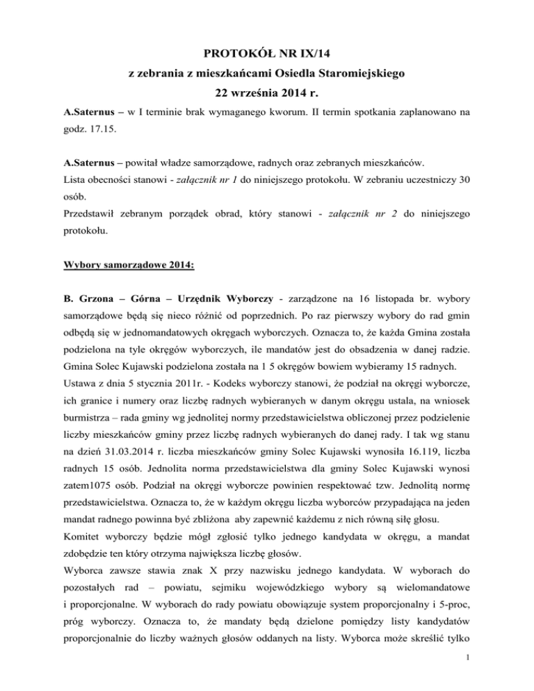 PROTOKÓŁ NR IX/14 z zebrania z mieszkańcami Osiedla Staromiejskiego 22 września 2014 r. A.Saternus – w I terminie brak wymaganego kworum. II termin spotkania zaplanowano na godz. 17.15. A.Saternus – powitał władze samorządowe, radnych oraz zebranych mieszkańców. Lista obecności stanowi - załącznik nr 1 do niniejszego protokołu. W zebraniu uczestniczy 30 osób. Przedstawił zebranym porządek obrad, który stanowi - załącznik nr 2 do niniejszego protokołu. Wybory samorządowe 2014: B. Grzona – Górna – Urzędnik Wyborczy - zarządzone na 16 listopada br. wybory samorządowe będą się nieco różnić od poprzednich. Po raz pierwszy wybory do rad gmin odbędą się w jednomandatowych okręgach wyborczych. Oznacza to, że każda Gmina została podzielona na tyle okręgów wyborczych, ile mandatów jest do obsadzenia w danej radzie. Gmina Solec Kujawski podzielona została na 1 5 okręgów bowiem wybieramy 15 radnych. Ustawa z dnia 5 stycznia 2011r. - Kodeks wyborczy stanowi, że podział na okręgi wyborcze, ich granice i numery oraz liczbę radnych wybieranych w danym okręgu ustala, na wniosek burmistrza – rada gminy wg jednolitej normy przedstawicielstwa obliczonej przez podzielenie liczby mieszkańców gminy przez liczbę radnych wybieranych do danej rady. I tak wg stanu na dzień 31.03.2014 r. liczba mieszkańców gminy Solec Kujawski wynosiła 16.119, liczba radnych 15 osób. Jednolita norma przedstawicielstwa dla gminy Solec Kujawski wynosi zatem1075 osób. Podział na okręgi wyborcze powinien respektować tzw. Jednolitą normę przedstawicielstwa. Oznacza to, że w każdym okręgu liczba wyborców przypadająca na jeden mandat radnego powinna być zbliżona aby zapewnić każdemu z nich równą siłę głosu. Komitet wyborczy będzie mógł zgłosić tylko jednego kandydata w okręgu, a mandat zdobędzie ten który otrzyma największa liczbę głosów. Wyborca zawsze stawia znak X przy nazwisku jednego kandydata. W wyborach do pozostałych rad – powiatu, sejmiku wojewódzkiego wybory są wielomandatowe i proporcjonalne. W wyborach do rady powiatu obowiązuje system proporcjonalny i 5-proc, próg wyborczy. Oznacza to, że mandaty będą dzielone pomiędzy listy kandydatów proporcjonalnie do liczby ważnych głosów oddanych na listy. Wyborca może skreślić tylko 1 jedno nazwisko na jednej z list niezależnie od liczby mandatów do obsadzenia. Np. na gminę Solec przypadają 3 mandaty do rady powiatu ale wyborca stawia znak X tylko przy nazwisku jednego kandydata. Także jeden głos przysługuje wyborcy w wyborach do sejmiku wojewódzkiego. Wójtowie, burmistrzowie i prezydenci miast są wybierani w wyborach bezpośrednich. Oznacza to, że zwycięża ten kandydat, który uzyskał ponad połowę ważnie oddanych głosów. Jeżeli żaden z kandydatów takiej większości nie uzyska, za dwa tygodnie ( 30.11.2014) przeprowadzona jest dogrywka. W drugiej turze głosowania obowiązuje zwykła większość, a więc kandydat wygrywa większością głosów nad swoim „przeciwnikiem”. Do drugiej tury wyborów przechodzi dwóch kandydatów z najlepszym wynikiem. Przypominamy mieszkańcom, że od tego roku obowiązuje w naszej gminie nowa geografia wyborcza. Sytuacja ta ma miejsce w obwodzie nr 10 obejmującym Sołectwo Chrośna, obwodzie nr 11 obejmującym Przyłubie i leśnictwa oraz obwodzie nr 12, który obejmuje swym zasięgiem Rudy, Otorowo-Makowiska i Wypaleniska. Pomimo że obwody 10 i 11 nie osiągają liczby 500 mieszkańców, pozwala to na zmniejszenie odległości, którą wyborca musi pokonać do siedziby obwodowej komisji wyborczej. Ponadto omawiane miejscowości tworzą zwartą zabudowę i za utworzeniem tych obwodów przemawiały względy geograficzne, ekonomiczne, usytuowanie ciągów komunikacyjnych oraz więzi społeczne. Gmina Solec Kujawski została podzielona na 12 stałych obwodów głosowania. Podział gminy na stałe obwody głosowania podtrzymuje również zasadę, że obwód głosowania obejmuje swoimi granicami cały okręg wyborczy lub dwa okręgi wyborcze. Karty do głosowania będą w 4 kolorach, przedziurkowane (ułatwienie dla osób niewidzących, zabezpieczenie przed podrobieniem). Osoby starsze i niepełnosprawne będą miały możliwość głosowania poprzez: - pełnomocnika, - korespondencyjnie, - UMiG udostępni samochód, który dowiezie jego lokalu wyborczego, prośba o wcześniejsze zgłoszenie do Urzędu chęci skorzystania z samochodu. Do czasu wyborów będziemy prowadzić szeroką kampanię informacyjną m.in. dot. siedzib obwodowych komisji wyborczych (w każdym numerze „Soleckich Wiadomości z Ratusza”, poprzez ulotki informacyjne). B. Pietruszyńska – Czy w języku Braille'a podane będą nazwiska kandydatów na karcie do głosowania ? B. Grzona – Górna – osoby niewidzące i słabo widzące w każdym lokalu wyborczym będą mogły skorzystać z nakładki w alfabecie Braille'a, w celu oddania głosu na danego kandydata. 2 T. Substyk – Burmistrz MiG – dodatkowo w pobliżu lokali wyborczych będą wolontariusze, którzy pomogą osobom starszym czy niepełnosprawnym dostać się do lokalu wyborczego. J. Koszarski – Przewodniczący RM – dodał, że dobrze byłoby, aby czas do dnia wyborów tj. do 16 listopada br. wykorzystać na propagowanie udziału w wyborach. Zaapelował do mieszkańców o liczny udział w wyborach, o dokładne zapoznanie się z sylwetkami kandydatów do Rady Miejskiej i sensownego wyboru swoich przedstawicieli do Rady Miejskiej Ad. 1. A.Saterus – przedstawił sprawozdanie z działalności Zarządu za 2014 rok – stanowiący zał. nr 3 do niniejszego protokołu. Ad. 2. T. Substyk – Burmistrz MiG - omówiła tematy związane z budżetem i realizacją inwestycji w 2014 roku: - zakończono I etap budowy tunelu – czekamy na ostatnią transzę środków finansowych w wysokości 2,5 mln zł. Gmina na budowę tunelu zaciągnęła kredyt w wysokości 12 mln zł, z czego 9 mln uda