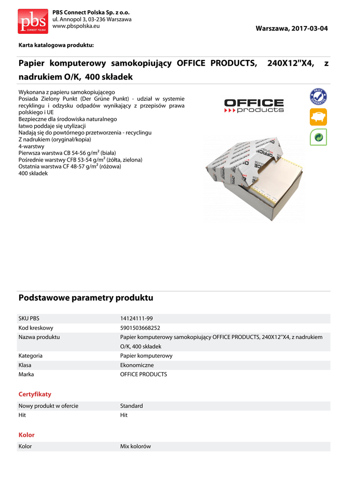 PBS Connect Polska Sp. z o.o. ul. Annopol 3, 03-236 Warszawa www.pbspolska.eu Warszawa, 2017-03-04 Karta katalogowa produktu: Papier komputerowy samokopiujący OFFICE PRODUCTS, 240X12''X4, nadrukiem O/K, 400 składek Wykonana z papieru samokopiującego Posiada Zielony Punkt (Der Grüne Punkt) - udział w systemie recyklingu i odzysku odpadów wynikający z przepisów prawa polskiego i UE Bezpieczne dla środowiska naturalnego łatwo poddaje się utylizacji Nadają się do powtórnego przetworzenia - recyclingu Z nadrukiem (oryginał/kopia) 4-warstwy Pierwsza warstwa CB 54-56 g/m² (biała) Pośrednie warstwy CFB 53-54 g/m² (żółta, zielona) Ostatnia warstwa CF 48-57 g/m² (różowa) 400 składek Podstawowe parametry produktu SKU PBS 14124111-99 Kod kreskowy 5901503668252 Nazwa produktu Papier komputerowy samokopiujący OFFICE PRODUCTS, 240X12''X4, z nadrukiem O/K, 400 składek Kategoria Papier komputerowy Klasa Ekonomiczne Marka OFFICE PRODUCTS Certyfikaty Nowy produkt w ofercie Standard Hit Hit Kolor Kolor Mix kolorów z PBS Connect Polska Sp. z o.o. ul. Annopol 3, 03-236 Warszawa www.pbspolska.eu Warszawa, 2017-03-04 Karta katalogowa produktu cd. Papier komputerowy samokopiujący OFFICE PRODUCTS, nadrukiem O/K, 400 składek Podstawowe parametry produktu Cecha Produkt Papier komputerowy Typ 4-warstwowy Rodzaj Samokopiujący Materiał Papier W ofercie od 2015-03 Wspólny słownik zamówień CPV 30197644-2 Papier kserograficzny Jednostki logistyczne Opakowanie 1 80 op 240X12''X4, z