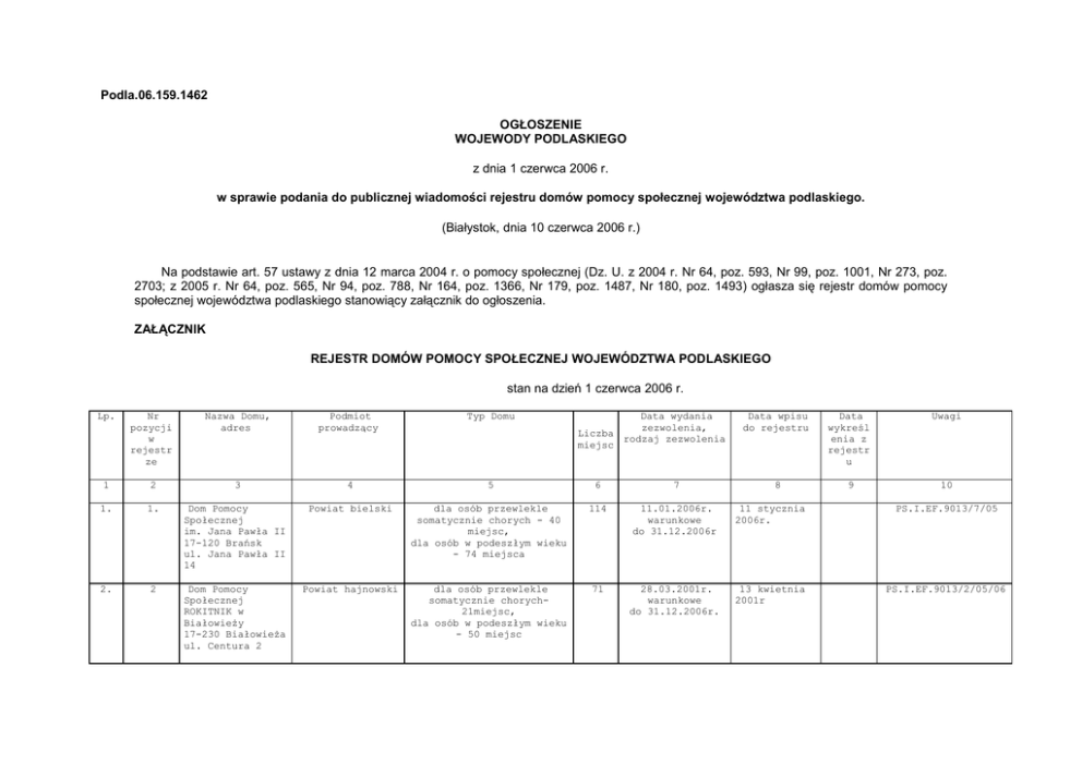 Podla.06.159.1462 OGŁOSZENIE WOJEWODY PODLASKIEGO z dnia 1 czerwca 2006 r. w sprawie podania do publicznej wiadomości rejestru domów pomocy społecznej województwa podlaskiego. (Białystok, dnia 10 czerwca 2006 r.) Na podstawie art. 57 ustawy z dnia 12 marca 2004 r. o pomocy społecznej (Dz. U. z 2004 r. Nr 64, poz. 593, Nr 99, poz. 1001, Nr 273, poz. 2703; z 2005 r. Nr 64, poz. 565, Nr 94, poz. 788, Nr 164, poz. 1366, Nr 179, poz. 1487, Nr 180, poz. 1493) ogłasza się rejestr domów pomocy społecznej województwa podlaskiego stanowiący załącznik do ogłoszenia. ZAŁĄCZNIK REJESTR DOMÓW POMOCY SPOŁECZNEJ WOJEWÓDZTWA PODLASKIEGO stan na dzień 1 czerwca 2006 r. Lp. Nr pozycji w rejestr ze Nazwa Domu, adres Podmiot prowadzący Typ Domu Data wydania zezwolenia, Liczba rodzaj zezwolenia miejsc Data wpisu do rejestru Data wykreśl enia z rejestr u Uwagi 1 2 3 4 5 6 7 8 9 10 1. 1. Dom Pomocy Społecznej im. Jana Pawła II 17-120 Brańsk ul. Jana Pawła II 14 Powiat bielski dla osób przewlekle somatycznie chorych - 40 miejsc, dla osób w podeszłym wieku - 74 miejsca 114 11.01.2006r. warunkowe do 31.12.2006r 11 stycznia 2006r. PS.I.EF.9013/7/05 2. 2 Dom Pomocy Społecznej ROKITNIK w Białowieży 17-230 Białowieża ul. Centura 2 Powiat hajnowski dla osób przewlekle somatycznie chorych21miejsc, dla osób w podeszłym wieku - 50 miejsc 71 28.03.2001r. warunkowe do 31.12.2006r. 13 kwietnia 2001r PS.I.EF.9013/2/05/06 3. 3. Dom Pomocy Społecznej w Łomży 18-400 Łomża ul. Polowa 39 Miasto Łomża dla dzieci i młodzieży niepełnosprawnych intelektualnie dziewczęta 102 28.03.2001r. warunkowe do 31.12.2006r 13 kwietnia 2001r. WS.I.9013/3/01 4. 4. Dom Pomocy Społecznej dla Dzieci i Młodzieży Zgromadzenia Sióstr Franciszkanek Rodziny Maryi w Augustowie 16-301 Augustów ul. Studzieniczna 2 Na zlecenie powiatu augustowskiego Zgromadzenie Sióstr Franciszkanek Rodziny Maryi Prowincji Warszawskiej ul. Hoża 53, 00-681 Warszawa dla dzieci i młodzieży niepełnosprawnych intelektualnie dziewczęta 50 18.04.2001r. warunkowe do 31.12.2006r 18 marca 2004r. PS.I.9013/1/04 5. 5. Dom Pomocy Społecznej dla Dzieci i Młodzieży Zgromadzenia Sióstr Franciszkanek Rodziny Maryi w Augustowie 16-300 Augustów ul. 3-go Maja 57 Na zlecenie powiatu augustowskiego Zgromadzenie Sióstr Franciszkanek Rodziny Maryi Prowincji Warszawskiej ul. Hoża 53, 00-681 Warszawa dla dzieci i młodzieży niepełnosprawnych intelektualnie dziewczęta 80 18.04.2001r. warunkowe do 31.12.2006r 18 marca 2004r. PS.I.9013/2/04 6. 6. Dom Pomocy Społecznej w Choroszczy 16-070 Choroszcz Aleja Niepodległości 4 Powiat białostocki dla osób przewlekle psychicznie chorych 302 20.04.2001r. warunkowe do 31.12.2006r 10 maja 2001r. WS.I.9013/7/01 7. 7. Dom Pomocy Społecznej w Czerewkach 16-061 Juchnowiec Kościelny Czerewki 1 Powiat białostocki dla osób przewlekle somatycznie chorych 103 20.04.2001r. warunkowe do 31.12.2006r 3 stycznia 2006r. WS.I.9013/8/01 8. 8. Dom Pomocy Społecznej dla Dorosłych Zgromadzenia Sióstr Franciszkanek Na zlecenie powiatu sejneńskiego Zgromadzenie Sióstr Franciszkanek dla osób starych kobiety 25 23.04.2001r. warunkowe do 31.12.2006r 14 maja 2001r WS.I.9013/6/01 Rodziny Maryi w Sejnach 16-500 Sejny ul. Mickiewicza 10a Rodziny Maryi Prowincji Warszawskiej ul. Hoża 53, 00-681 Warszawa 9. 9 Dom Pomocy Społecznej KALINA w Suwałkach 16-400 Suwałki ul. Pułaskiego 66a Miasto Suwałki dla osób przewlekle somatycznie chorych 195 24.04.2001r. warunkowe do 31.12.2006r 14 maja 2001r 10. 10 Dom Pomocy Społecznej w Jałówce z Filią w Łaźniach 16-054 Jałówka ul. Leśna 11 Powiat białostocki Dom Pomocy Społecznej w Jałówce dla osób przewlekle psychicznie chorych - 85 miejsca, Filia w Łaźniach dla osób przewlekle somatycznie chorych - 35 miejsca 120 2.12.2004r. warunkowe do 31.12.2006r 29 grudnia 2005r. 11. 11 Dom Pomocy Społecznej W Uhowie 18-100 Łapy Uhowo, ul. Surażska 67 Powiat białostocki dla osób przewlekle somatycznie chorych 125 15.05.2001r. warunkowe do 31.12.2006r 31 maja 2001r. WS.I.9013/11/01 12. 13. Dom Pomocy Społecznej DOM KOMBATANTA w Mocieszach 19-124 Jaświły Mociesze 4a Powiat moniecki dla osób przewlekle somatycznie chorych 43 04.06.2001r. warunkowe do 31.12.2006r 21 czerwca 2001r. WS.I.9013/14/01 13. 14. Dom Pomocy Społecznej w Mońkach 19-100 Mońki ul. PCK 15 Powiat moniecki dla osób starych 16 04.06.2001r. warunkowe do 31.12.2006r 21 czerwca 2001r. WS.I.9013/13/01 14. 15. Dom Pomocy Społecznej pod wezwaniem św. Franciszka z Asyżu w Tykocinie 16-080 Tykocin ul. Klasztorna 1 Na zlecenie powiatu łomżyńskiego CARITAS Diecezji Łomżyńskiej dla osób przewlekle psychicznie chorych kobiety 33 22.06.2001r. warunkowe do 31.12.2006r 12 lipca 2001r. WS.I.9013/17/01 15. 16. Na zlecenie dla osób przewlekle 200 28.06.2001r. 17 lipca WS.I.9013/1/03 Dom Pomocy WS.I.9013/16/01 PS.I.EF.9013/10/05 Społecznej "Spokojna Przystań" w Garbarach 16-055 Juszkowy Gród powiatu białostockiego Przedsiębiorstwo Wielobranżowe mgr Zdzisław Konikowski, ul. Konduktorska 1, 15-711 Białystok psychicznie chorych Powiat wysokomazowiecki dla dorosłych niepełnosprawnych intelektualnie warunkowe do 31.12.2006r 2001r. 110 08.06.2001r. warunkowe do 31.12.2006r 17 lipca 2001r. WS.I.9013/15/01 16. 17. Dom Pomocy Społecznej w Kozarzach 18-230 Ciechanowiec Kozarze 63 17. 18. Powiatowy Dom Pomocy Społecznej w Siemiatyczach 17-300 Siemiatycze ul. 3-go Maja 2 Powiat siemiatycki dla osób przewlekle somatycznie chorych 70 14.08.2001r. warunkowe do 31 grudnia 2006r. 31 sierpnia 2001r. WS.I.9013/18/01 18. 19. Dom Pomocy Społecznej w Białymstoku 15-328 Białystok ul. Świerkowa 9 Miasto Białystok dla osób przewlekle somatycznie chorych 160 28.11.2001r warunkowe do 31.12.2006r 18 grudnia 2001r. WS.I.9013/21/01 19. 20. Dom Pomocy Społecznej im. Wiktorii Kowalewskiej w Łomży 18-400 Łomża ul. Sikorskiego 222 Na zlecenie powiatu łomżyńskiego Polski Komitet Pomocy Społecznej, Zarz