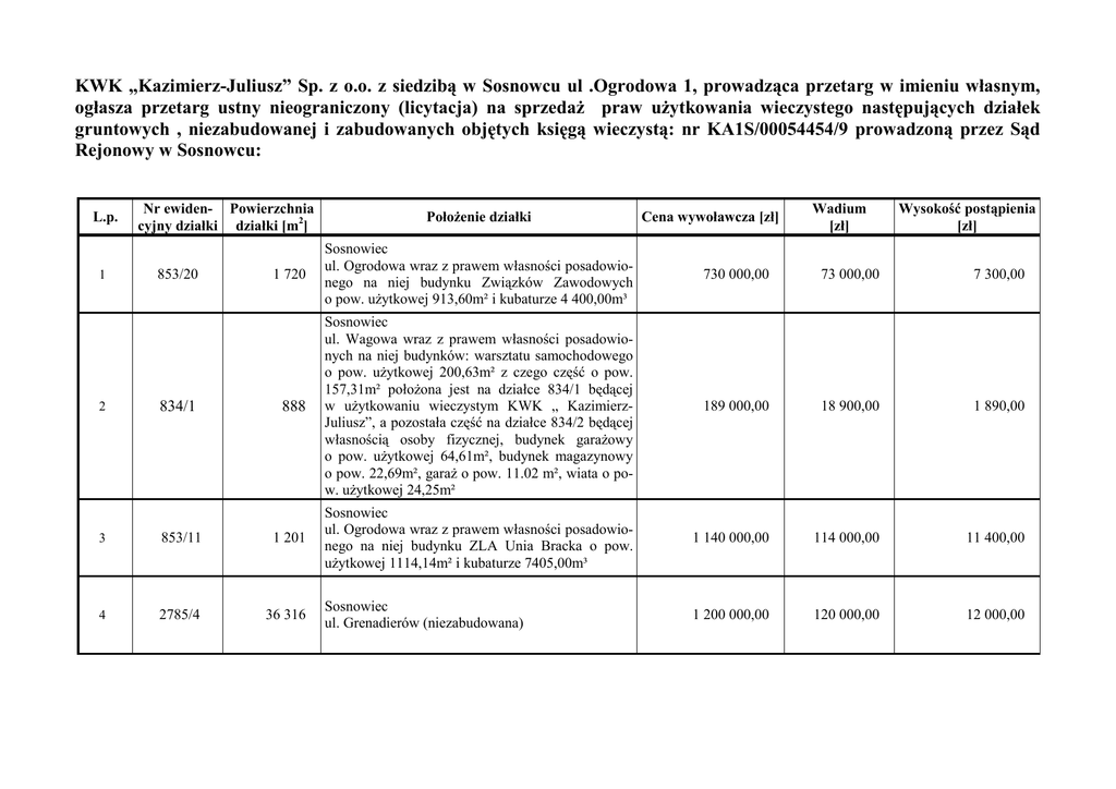 Ogloszenie sprzedaz 4 dzialek - KWK " Kazimierz