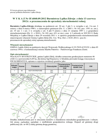 W lewym górnym rogu dokumentu pieczęć podłużna Burmistrz Lądka-Zdroju. W Y K A Z Nr IF.6840.09.2012 Burmistrza Lądka-Zdroju z dnia 13 czerwca 2012r. o przeznaczeniu do sprzedaży nieruchomości rolnej. Burmistrz Lądka-Zdroju działając na podstawie art. 30 ust. 2 pkt 3, w związku z art. 11a ust. 3 ustawy z dnia 8 marca 1990 r. o samorządzie gminnym (Dz. U. z 2001 r. Nr 142, poz. 1591 ze. zm.), art. 35 ust. 1 i ust. 2 w związku z art. 4 pkt 9 ustawy z dnia 21 sierpnia 1997 r. o gospodarce nieruchomościami (Dz. U. z 2010 r. Nr 102, poz. 651 ze zm.), oraz § 3 uchwały nr XIV/83/11 Rady Miejskiej w Lądku-Zdroju z dnia 29 września 2011 r. w sprawie gospodarowania nieruchomościami stanowiącymi własność Gminy Lądek-Zdrój (Dz. Urz. Woj. Dol. z 10.01.2012 r. poz.6) – przeznacza do sprzedaży niżej opisaną nieruchomość. Własność nieruchomości GMINA Lądek-Zdrój na podstawie decyzji Wojewody Wałbrzyskiego G.VI-7019-4/553/91 z dnia 05 czerwca 1991r. o komunalizacji mienia Skarbu Państwa – Państwowego Funduszu Ziemi. Opis nieruchomości Wieś KATY BYSTRZYCKIE, gmina Lądek-Zdrój, działka oznaczona geodezyjnym numerem 46 (AM-1) o powierzchni 0,49 ha, dla której Sąd Rejonowy w Kłodzku prowadzi księgę wieczystą nr SW1K/00054552/6, opisana w rejestrze ewidencji gruntów jako Działka zlokalizowana jest w otoczeniu terenów o charakterze mieszkalno-gospodarczym i rolnym. Od strony zachodnie sąsiaduje z siedliskiem gospodarstwa rolnego. Dojazd od gminnej drogi publicznej (dz. nr 68/2) dalej gminną drogą gruntową. 1 Przeznaczenie w planie zagospodarowania przestrzennego Zgodnie z ustaleniami planu zagospodarowania przestrzennego miejscowości Kąty Bystrzyckie uchwalonego uchwałą Nr XIII/157/03 Rady Miejskiej w Lądku- Zdroju z dnia 25 września 2003 r. (Dz. Urz. Woj. Dol. Nr 30, poz.526 z 13.02.2004 r.) przedmiotowa działka wchodzi w skład większego terenu oznaczonego symbolem RO. Tereny oznaczone symbolem przeznaczenia RO przeznacza się na następujące funkcje odnoszące się do zagospodarowania: produkcja rolna, sadownicza lub ogrodnicza z wyłączeniem przedsięwzięć, dla których raport oddziaływania przedsięwzięcia na środowisko jest lub może być wymagany, łąki, pastwiska, nieużytki, lasy, niezbędne obiekty infrastruktury technicznej i komunikacyjnej, w tym drogi publiczne klasy drogi lokalnej lub dojazdowej, trasy turystyczne, punkty widokowe, ścieżki rowerowe, wody powierzchniowe oraz inne zrealizowane przed wejściem planu w życie, o ile są zgodne z przepisami szczególnymi. Pełny tekst planu zagospodarowania przestrzennego znajduje się na stronie: http://bip.ug-ladekzdroj.dolnyslask.pl/dokument.php?iddok=181&idmp=51&r=r Cena nieruchomości 32.000 zł. (słownie: trzydzieści dwa tysiące złotych) Podatek VAT Zgodnie z obowiązującym art. 43 ust. 1 pkt 9 ustawy z dnia 11 marca 2004 r. o podatku od towarów i usług (j.t. Dz. U z 2011 r. Nr 177, poz. 1054 ze zm.).) zwalnia się od podatku dostawę terenów niezabudowanych innych niż tereny budowlane oraz przeznaczone pod zabudowę, tak więc sprzedaż nieruchomości rolnej podlega również zwolnieniu od podatku VAT. Obciążenia Nieruchomość jest wolna od obciążeń i zadłużeń, nie jest obciążona ograniczonymi prawami rzeczowymi, ani ograniczeniami w rozporządzaniu. Nie istnieją żadne nie wykonane roszczenia prywatno-prawne osób trzecich. Nieruchomość nie była przedmiotem umów zobowiązaniowych a nadto nie toczą się żadne postępowania administracyjne lub sądowe, których byłaby przedmiotem. 2 Koszty i opłaty Koszty związane z przygotowaniem nieruchomości do sprzedaży zostały wliczone do ceny wywoławczej. Natomiast wszelkie koszty związane z zawarciem umowy notarialnej przenoszącej własność jak: taksa notarialna wraz z podatkiem VAT, opłaty sądowe i opłaty za wypisy aktu notarialnego obciążają nabywcę. Uwagi 1) Sprzedaż nieruchomości odbywa się według stanu prawnego uwidocznionego w ewidencji gruntów. Gmina Lądek Zdrój nie ponosi odpowiedzialności za ewentualne późniejsze zmiany powierzchni czy klasyfikacji gruntów wynikłe na skutek prowadzenia prac geodezyjnych. 2) Nadto, sprzedaż odbywa się w stanie istniejącego uzbrojenia podziemnego i naziemnego terenu, określonego w dniu sprzedaży tej nieruchomości na mapie zasadniczej prowadzonej przez Powiatowy Ośrodek Dokumentacji Geodezyjnej i Kartograficznej w Kłodzku, który nie wyklucza istnienia w terenie innych, nie wykazanych na mapie budów i urządzeń podziemnych, które nie były zgłoszone do inwentaryzacji lub o których brak jest informacji w instytucjach branżowych, przy czym w przypadku związanych z tym faktem ewentualnych kolizji projektowych nabywca przeniesie stosowne media na własny koszt, po dokonaniu przewidzianych prawem uzgodnień i uzyskaniu pozwoleń. 3) Geodezyjne okazanie granic przez uprawnionego geodetę może nastąpić na wniosek nabywcy za dodatkowa opłatą. Procedura sprzedaży Wykaz wywiesza się na okres 21 dni, tj. od dnia 13 czerwca 2011r. do dnia 04 lipca 2012r. w siedzibie Urzędu Miasta i Gminy w Lądku-Zdroju przy ul. Rynek 31, a także informacja o jego wywieszeniu będzie podana do publicznej wiadomości przez ogłoszenie w prasie lokalnej – Tygodnik Powiatowy Euroregio Glacensis oraz na stronach internetowych tut. Urzędu www.ladek.pl i w Biuletynie Informacji Publicznej w zakładce-Nieruchomości komunalne. Ustala się 6-cio tygodniowy termin (licząc od dnia wywieszenia wykazu) do złożenia wniosku przez osoby, którym przysługuje pierwszeństwo w nabyciu nieruchomości na podstawie art. 34, ust. 1, pkt. 1 i 2 ustawy o gospodarce nieruchomościami. Pierwszeństwo przysługuje osobie, która spełnia jeden z następujących warunków: 1) przysługuje jej roszczenie o nabycie nieruchomości z mocy ustawy o gospodarce nieruchomościami lub odrębnych przepisów, jeżeli złoży wniosek o nabycie przed upływem terminu ok