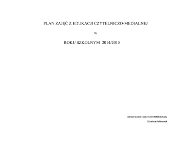PLAN ZAJĘĆ Z EDUKACJI CZYTELNICZO-MEDIALNEJ w ROKU SZKOLNYM 2014/2015 Opracowanie: nauczyciel bibliotekarz Elzbieta Sobieszek PLANOWANY TERMIN REALIZACJI KLASA I a, I b, TEMAT LEKCJI 1.Poznajemy bibliotekę szkolną - zajęcia biblioteczne. UWAGI I 2015 r. Biblioteka szkolna. Wypożyczalnia, czytelnia (księgozbiór podręczny, czasopisma). Zbiory biblioteki: książki, czasopisma, środki audiowizualne, multimedialne – CD i ich rozmieszczenie. Książki przeznaczone dla młodszych dzieci: bajki, wiersze, opowiadania, lektury szkolne. Regulamin biblioteki, godziny otwarcia biblioteki. Poszanowanie dokumentów bibliotecznych. Samodzielny wypożyczenia. II wybór książek do 2. Pasowanie na czytelnika. 1.Jesteśmy czytelnikami . Czytelnia miejscem nauki i rozrywki. Zbiory czytelni: księgozbiór podręczny, czasopisma, zbiory audiowizualne i IV 2015 r. X 2014 r. multimedialne. Czasopisma dla młodszych dzieci. Ich zawartość. Cechy różniące od wydawnictw zwartych.Zbiory „Księgozbioru podręcznego”: encyklopedie, słowniki, leksykony. 2. . Książka, jej twórcy: autor, tłumacz, II 2015 r. ilustrator, wydawca, drukarz. Rola ilustracji - znani ilustratorzy. Pisarze, poeci dla dzieci - J.Tuwim, J.Brzechwa, A.A.Milne, A.Lindgren (sylwetki pisarzy) III 1. Charakterystyczne elementy budowy książki. XI 2014 r. Książka, jej budowa i szata graficzna (okładka, oprawa, obwoluta, trzon książki , karta przed-tytułowa, tytułowa, rozdział, format, objętość, spis treści).. Posługiwanie się spisem treści. Rola ilustracji. Książki elektroniczne – e-Booki, Poszanowanie książek, higiena czytania. 2. Szukamy w bibliotece informacji na dany temat – korzystamy z książek poznawczych i popularnonaukowych dla młodszych dzieci. Ćwiczenia umiejętności odnalezienia II 2015 r. podstawowych informacji w wydawnictwach informacyjnych. Ćwiczenia w korzystaniu z multimedialnych wydawnictw informacyjnych. Elementy techniki pracy umysłowej, organizowanie własnego warsztatu pracy umysłowej, własnych zbiorów. IV 1. Uczymy się korzystać ze słowników XII 2014 r. i encyklopedii. Elementy budowy wydawnictw informacyjnych - (wstęp, objaśnienia skrótów, żywa pagina, hasło treściowe). Encyklopedie multimedialne na CD, porównanie (zalety i wady) z encyklopedią tradycyjną, ocena przydatności. 2. Dzieje pisma, książki, prasy i innych przekazów medialnych. Czas i miejsce rozpowszechniania się pisma. Formy i materiały piśmiennicze (nośniki): tabliczki gliniane, zwój, kodeks – formy tradycyjne.Nowoczesne nośniki: dyski, CD, dyskietki, Internet 3. Wyszukiwanie informacji zadanych przez nauczyciela, dobór wydawnictw, odczytanie hasła ze zrozumieniem. Warsztat informacyjny biblioteki: katalogi tradycyjne, kartoteki, zautomatyzowane systemy wyszukiwania (zagadnienia ogólne). Katalog alfabetyczny i jego budowa, przeznaczenie. ( lekcja w Gminnej Bibliotece Publicznej) V 1.Książka popularnonaukowa, jej struktura X 2014 r. i miejsce w bibliotece. Literatura popularnonaukowa (treść, aparat pomocniczy). Różnica między literaturą piękną, a literaturą popularnonaukową pod względem budowy i zawartości. Umiejętność czytania i rozumienia tekstów popularnonaukowych. Katalog rzeczowy przeznaczenie. 2. i jego budowa, II 2015 r. Działy UKD. Układ książek na półkach. Wyszukiwanie książki na określony temat na podstawie katalogu rzeczowego. Zautomatyzowany system wyszukiwania informacji – na podstawie systemu w Bibliotece Publicznej. Technika wyszukiwania informacji o książkach w programach komputerowych – katalogach. Internetowe katalogi bibliotek. VI 1. Kartoteki: tekstowa, zagadnieniowa. bibliograficzno - III 2015 r. Opis bibliograficzny książki i artykułów z czasopisma. Poszukiwanie materiałów na określony temat w kartotece, celowość tworzenia kartotek, przeznaczenie. Budowa zawartość kartotek: hasła, układ materiałów w kartotekach. 2. Warsztat samodzielnej pracy ucznia: XI 2014 r. Właściwie zorganizowane miejsce pracy, prawidłowe warunki nauki. Techniki uczenia się (zapamiętywania, notowania oraz metody szybkiego czytania). Internet – wykorzystanie dogodnego dostępu do informacji. Higiena pracy umysłowej. 3. Poszukiwanie materiałów na określony I 2015 r. temat. Wydawnictwa informacji pośredniej – źródła informacji o książce: bibliografia, zestawienie bibliograficzne, bibliografia załącznikowa; katalogi wydawnicze, witryny internetowe. Zasady sporządzania spisu bibliograficznego, opis bibliograficzny Regulamin konkursu: 1. W konkursie biorą udział chętni uczniowie z klas II i III 2. Uczestnicy konkursu wykonują zakładkę do książki 3. Do wykonania zakładki można użyć ciekawych materiałów ( co podpowie wyobraźnia: tkanina, plastik ,nitki, muszelki, piasek, ziarna, liście, papier itp.) 4. Zakładka musi być podpisana ( imię, nazwisko, klasa ) 5. Prace należy złożyć w bibliotece do 19 października ( piątek ) 6.Zakładki oceni Komisja Konkursowa