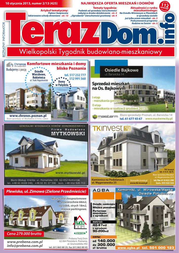 NAJWIĘKSZA OFERTA MIESZKAŃ I DOMÓW 10 stycznia 2013, numer 2/13 (425) Artykuł tematyczny: Podatek od sprzedaży nieruchomości nabytej w drodze dziedziczenia - str. 4 „Ogrodzenie” nieruchomości gruntowej - str. 4 BEZPŁATNY INFORMATOR Piękne i bezpieczne lakierowane schody drewniane - str. 13 Tematy tygodnia: Aktualności z rynku mieszkaniowego: 112 inwesty cji Na Osiedlu Wiśniowym w Plewiskach w sprzedaży zostało już tylko osiem mieszkań - str. 3 Podsumowanie programu Rodzina na Swoim - str. 3 Komfortowe mieszkania i domy blisko Poznania Osiedle Wierzbowe, Rokietnica ul. Trakt Napoleoński tel. 517 232 777 512 991 560 Domy w Palędziu www.chronos.poznan.pl Biuro sprzedaży: ul. Wschodnia 23 A/65, Luboń TK Invest sp. z o.o. sp.k. Kamienica na Podolanach ul. Węgorzewska 25 [email protected] www.tk-invest.pl tel./fax 61 8 422 290 kom. 533 322 322 Komorniki, ul. Wirowska/Wąska Osiedle Południowe Plewiska, ul. Zimowa (Zielone Przedmieście) Mieszkanie dwupoziomowe powierzchnia 66m2, ogródek, strych 18m2, miejsce parkingowe. Biuro Sprzedaży Mieszkań ul. Węgorzewska 25/5 Osiedle zamknięte Miejsca postojowe Parterowe mieszkania z ogródkami metraż: 40-87m2 z ogrodami: 90-200m2 Cena 279.000 brutto www.prebena.com.pl [email protected] Prebena Twój Dom 62-064 Plewiska k. Poznania, ul. Grunwaldzka 492 tel. (61) 863 80 25, fax (61) 863 80 45 ceny: od 140.000 do 300.000 zł brutto www.agba.pl tel. 501 000 123 Os. Cytrusowe w Skórzewie mieszkania z ogrodem SMBDJ “Ławica-Zachód” ul. Łobeska 16 60-182 Poznań www.lawicazachod.pl [email protected] tel. 61 868 19 11 metraż: 73-75 (64,20 + pom. gospodarcze) cena: 2.740-2.940 zł brutto+działka Budynek cztero-mieszkaniowy, parter:taras+ogród, piętro: balkon+ogród. Miejsca postojowe na posesji. Szybki dojazd do Poznania, zachodniej obwodnicy miasta i autostrady A2. Warta Park • cena już od 2.670 zł brutto/m2 • liczba mieszkań w II etapie inwestycji 90 Mieszkania I etapu gotowe do odbioru Salon Sprzedaży Mieszkań: Luboń, ul. Armii Poznań 58, tel.: (61) 8994 750, fax: (61) 8994 754 godz. otwarcia: pon.-pt.: 9.00-17.00, sob.: 10.00-14.00 e-mail: [email protected], www.pajo.pl Plewiska ul. Strażewicza/Miętowa Cena 3990 zł/m2 brutto Powierzchnia 35-56 m2 Inwestycja obejmuje 96 mieszkań 2 Powołaj się na NAS! ! aktualności z rynku mieszkaniowego Na Osiedlu Wiśniowym w Plewiskach w sprzedaży zostało już tylko osiem mieszkań Nowoczesne osiedle mieszkaniowe spółki Twoje M w Plewiskach, usytuowane jest przy ulicy Fabianowskiej 12. Liczy pięć szeregów dwulokalowych domów jednorodzinnych, w skład których wchodzą trzypokojowe, jednopoziomowe mieszkania. Razem jest ich 60. Każde posiada osobne wejście, miejsce parkingowe i ogródek - w przypadku lokali na parterze, bądź balkon - we wszystkich usytuowanych na piętrze. Powierzchnia każdego z mieszkań wynosi niecałe 69 mkw. Inwestycja została już całkowicie ukończona. Niewątpliwą jej zaletą jest położenie w spokojnej i atrakcyjnej okolicy. Osiedle jest zamknięte, mieszkania wykonane są w technologii ekologicznej, przez zastosowanie wysokiej jakości materiałów są też bardzo ekonomiczne w utrzymaniu. Klienci, którzy już mieszkają na Osiedlu Wiśniowym, mówią o wzorcowej realizacji inwestycji oraz lekkiej i nowoczesnej architekturze - jako głównych czynnikach skłaniających ich do zakupu. Podsumowanie programu Rodzina na Swoim To jest już koniec. Po 5 latach funkcjonowania, program Rodzina na Swoim odszedł do lamusa. Przykre było to pożegnanie, gdyż skutecznie wspierał Polaków w zakupie własnego mieszkania. Od 2007 roku z preferencyjnych kredytów skorzystało ponad 175 tysięcy gospodarstw domowych. Łączna kwota udzielonych pożyczek przekroczyła 31 miliardów złotych. Deweloperzy są zgodni. Program zdominował sprzedaż i uratował niejednego inwestora mieszkaniowego. Skorzystanie z programu rządowych dopłat było możliwe wyłącznie dla osób spełniających kilka określonych przez ustawodawcę warunków. Nazwa sugerowała, że były to tylko rodziny. W rzeczywistości na preferencyjny kredyt mogli zdecydować się małżonkowie, osoby samotnie wychowujące przynajmniej jedno dziecko oraz osoby niepozostające w związku małżeńod parametrów programu RnS. Niemniej, niespełskim. Narzucone warunki prowadziły czasami na 6 procent sprzedanych mieszkań udało się nim do kuriozalnych sytuacji, kiedy to, by skorzystać objąć - mówi Tomasz Wnuk, dyrektor generalny z ulgi, tworzyły się fikcyjne małżeństwa czy rozMalta Fountain. - Każdemu programowi stymuluwody. Koniec RnS to problem dla deweloperów. jącemu rynek nieruchomości należy przyklasnąć. Problem, gdyż program niejednokrotnie stanoBez dwóch zdań RnS zdominował sprzedaż i zawił o sukcesie danej inwestycji. - Program RnS był korzystny zarówno dla klientów jak i deweloperów. Pomógł nam w procesie sprzedaży mieszkań w podpoznańskiej Rokietnicy. Wystarczy wspomnieć, że 90 procent lokali znalazło swoich nabywców właśnie dzięki funkcjonowaniu takiego programu. Niestety, późniejsze zmiany w limitach cenowych uniemożliwiły powtórzenie takich korzyści przy naszej kolejnej inwestycji w Swarzędzu - mówi Joanna Rzelechowska z Kalbud Deweloper. pewne uratował wyniki niejednego dewelopera Wprowadzane zmiany w programie hamowały - dodaje T. Wnuk. Rząd szykuje kolejny program trochę rynek mieszkań, a deweloperzy nie zao nazwie Mieszkanie dla Młodych. Specjaliści wsze mogli dostosować się do przyjętych nozaznaczają, że nie będzie on już taki korzystwelizacji. - Dla naszych wyników sprzedażowych ny jak RnS. Jak obliczają analitycy, na dopłaprogram RnS nie miał tak dużego znaczenia, tach będzie można zyskać mniej niż obecnie gdyż była to oferta tylko na wybraną partię i co ważne, MdM obejmie wyłącznie rynek demieszkań. Rodzina na Swoim, dla deweloperów weloperski. Pamiętajmy jednak, że większo