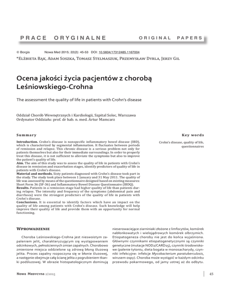 PRACE © Borgis ORYGINALNE ORIGINAL PA P E R S Nowa Med 2015; 22(2): 45-53 DOI: 10.5604/17312485.1167004 *Elżbieta Bąk, Adam Soszka, Tomasz Stelmaszuk, Przemysław Dyrla, Jerzy Gil Ocena jakości życia pacjentów z chorobą Leśniowskiego-Crohna The assessment the quality of life in patients with Crohn’s disease Oddział Chorób Wewnętrznych i Kardiologii, Szpital Solec, Warszawa Ordynator Oddziału: prof. dr hab. n. med. Artur Mamcarz Summary Key wo rd s Introduction. Crohn’s disease is nonspecific inflammatory bowel disease (IBD), which is characterized by segmental inflammation. It fluctuates between periods of remission and relapse. This chronic disease is a serious problem not only for patients themselves but also for their immediate surroundings. In order to properly treat this disease, it is not sufficient to alleviate the symptoms but also to improve the patient’s quality of life. Aim. The aim of this study was to assess the quality of life in patients with Crohn’s disease in remission and exacerbation stages, identify predictors of quality of life in patients with Crohn’s disease. Material and methods. Sixty patients diagnosed with Crohn’s disease took part in the study. The study took place between 1 January and 31 May 2011. The quality of life was assessed by means of the questionnaire designed based on existing measures: Short Form 36 (SF-36) and Inflammatory Bowel Disease Questionnaire (IBDQ). Results. Patients in a remission stage had higher quality of life than patients during relapse. The intensity and frequency of the symptoms (abdominal pain and diarrhoea) were the strongest predictors of the quality of life in patients with Crohn’s disease. Conclusions. It is essential to identify factors which have an impact on the quality of life among patients with Crohn’s disease. Such knowledge will help improve their quality of life and provide them with an opportunity for normal functioning. Wprowadzenie Choroba Leśniowskiego-Crohna jest nieswoistym zapaleniem jelit, charakteryzującym się występowaniem odcinkowych, pełnościennych zmian zapalnych. Chorobowo zmienione miejsca oddzielone są zdrową błoną śluzową jelita. Proces zapalny rozpoczyna się w błonie śluzowej, a następnie obejmuje całą ścianę jelita z pogrubieniem tkanki podśluzowej. W obrazie histopatologicznym dominują Nowa Medycyna 2/2015 Crohn’s disease, quality of life, questionnaires nieserowaciejące ziarniniaki złożone z limfocytów, komórek nabłonkowatych i wielojądrowych komórek olbrzymich. Etiopatogeneza choroby nie jest do końca wyjaśniona. Głównymi czynnikami etiopatogenetycznymi są czynniki genetyczne (mutacje NOD2/CARD15), czynniki środowiskowe (palenie tytoniu, dieta bogata w monosacharydy, czynniki infekcyjne: infekcje Mycobacterium paratuberculosis, wirusem ospy). Choroba może wystąpić w każdym odcinku przewodu pokarmowego, od jamy ustnej aż do odbytu. 45 Elżbieta Bąk i wsp. Najczęściej występującą lokalizacją zmian zapalnych jest końcowy odcinek jelita krętego (ileum terminale) – 40-50% przypadków; jelito grube zajęte jest w 20% przypadków, natomiast obie lokalizacje występują u ok. 30-40% chorych. Rzadziej choroba zlokalizowana jest w górnym odcinku przewodu pokarmowego, proksymalnym odcinku jelita cienkiego i wyrostku robaczkowym. Makroskopowo zmiany chorobowe są małymi drobnymi owrzodzeniami, następnie dołącza się obrzęk błony śluzowej na powierzchni, na której mogą być widoczne głębokie linijne owrzodzenia, miejscami łączące się ze sobą i otaczające prawidłową błonę śluzową, co daje efekt „brukowania”. W przebiegu omawianego schorzenia obserwuje się naprzemienne okresy zaostrzeń i remisji (1-3). Choroba występuje najczęściej u ludzi młodych między 16. a 25. rokiem życia. Częstość występowania wśród kobiet i mężczyzn jest porównywalna. W Unii Europejskiej zapadalność wynosi 5/100 tys. ludności rocznie. W Polsce na chorobę Leśniowskiego-Crohna choruje ok. 15 tys. osób (1, 2). Jako schorzenie przewlekłe stanowi ono poważny problem zarówno dla pacjentów, jak i najbliższego otoczenia. Fakt, iż choroba Leśniowskiego-Crohna jest w dalszym ciągu nieuleczana, jest bardzo trudny do zaakceptowania przez pacjenta. Ta świadomość często prowadzi do rozwoju depresji, w rezultacie działa jako psychogenny czynnik, który pogarsza stan kliniczny chorego. Bardzo ważnym elementem właściwego prowadzenia choroby jest nie tylko łagodzenie objawów, ale również poprawa jakości życia chorego. Choroba Leśniowskiego-Crohna, z racji przewlekłego przebiegu, może doprowadzić do niepełnosprawności chorego, rozwoju negatywnych zachowań i emocji, upośledzenia funkcji biopsychospołecznych pacjenta, w konsekwencji powodując niższą jakość życia (1-3). Należy włożyć wiele wysiłku w planowanie opieki nad przewlekle chorym, aby zapewnić mu optymalny stopień aktywności życiowej. Jednym z ważnych elementów oceny sprawowanej opieki medycznej jest „jakość życia” (3, 4). Według współczesnej definicji Światowej Organizacji Zdrowia (WHO) „jakość życia” jest indywidualnym spostrzeganiem przez chorego własnej życiowej sytuacji, w odniesieniu do systemu wartości i kultury, w zależności od własnych wymagań, celów, wzorców, lęków oraz zainteresowań. Termin „jakość życia” w ujęciu medycznym to parametr niezbędny do badania efektów leczenia schorzenia, pomaga lepiej zrozumieć, czego tak naprawdę potrzebuje pacjent, aby lepiej czuć się ze swoją chorobą i móc w życiu codziennym normalnie z nią funkcjonować (3-5). Problem jakości życia osób z chorobą Leśniowskiego-Crohna jest często niezauważalny zarówno przez personel medyczny, jak i środowisko chorego. Przyczyną tego faktu jest brak dostatecznej wiedzy na temat samej choroby i brak dostatecznej wiedzy co do narzędzi stosowanych w ocenie jakości życia pacjentów z omaw