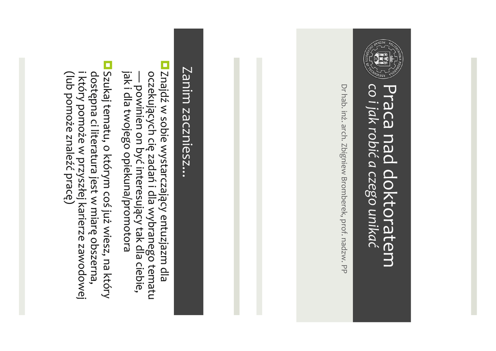 !!!!Praca!nad!doktoratem! ! !!!! co#i#jak#robić#a#czego#unikać# !!!!!!!!!!!!!!!!!!!!!!!!!!!!!Dr!hab.!inż.!arch.!Zbigniew!Bromberek,!prof.!nadzw.!PP! Zanim!zaczniesz...! ! Znajdź!w!sobie!wystarczający!entuzjazm!dla! oczekujących!cię!zadań!i!dla!wybranego!tematu! —!powinien!on!być!interesujący!tak!dla!ciebie,! jak!i!dla!twojego!opiekuna/promotora! ! Szukaj!tematu,!o!którym!coś!już!wiesz,!na!który! dostępna!ci!literatura!jest!w!miarę!obszerna,!!!!!!!!!! i!który!pomoże!w!przyszłej!karierze!zawodowej! (lub!pomoże!znaleźć!pracę)! Zanim!zaczniesz...! ! Nie!przeceniaj!swoich!możliwości!co!do! wysiłku!i!czasu!koniecznych!dla!ukończenia! wymaganych!zadań! ! Nie!przeceniaj!swoich!możliwości!w!zakresie! zbierania!danych,!ich!analizowania,! syntetyzowania!i!integracji:!nie!wahaj!się! prosić!o!pomoc! ! Nie!polegaj!na!innych:!oni!nie!zawsze!będą! dostępni,!akurat!gdy!będą!tobie!potrzebni! Cel!doktoratu! ! Praca!inżynierska:#demonstruje#zdolność#kandydata#do# wykonywania#nadzorowanych#prac#badawczych#pod# kierunkiem#promotora# ! Praca#magisterska:#demonstruje#zdolność#kandydata#do# samodzielnego#prowadzenia#pracy#badawczej#pod# kierunkiem#promotora# ! Praca!doktorska:!demonstruje!zdolność! kandydata!do!określenia!obszaru!badawczego! oraz!dobrania!odpowiednich!narzędzi!i!metod! umożliwiających!uzupełnienie!luk!w!istniejącej! wiedzy!lub!otwarcie!nowych!jej!obszarów! Co!to!jest!teza?! ! Teza!to!propozycja!lub!stwierdzenie,!które! przedstawia!się!publicznie,!popierając!je! argumentem!(hipotezą)!lub!ciągiem! argumentów!logicznie!ze!sobą!połączonych!! Określenie!tematu! ! Temat!pracy!można!(i!należy!)!zmieniać!aż!do! punktu,!w!którym!wiernie!oddaje!zawartość! dysertacji!! ! Uwaga:#zmiany#są#niedopuszczalne#po#otwarciu# przewodu#–#wymagają#zgody#Rady#Wydziału!# ! Zakres!należy!zawężać:!zacznij!od!wąskiego!!! i!dalej!go!zawężaj!–!w!miarę!postępu!badań! ! O!temacie!należy!myśleć!jak!o!zestawie! roboczych!pytań/hipotez! Określenie!tematu! ! Nie!bądź!„dziennikarzem!z!tabloidu”:!zadbaj!!!!!! o!jasność!i!klarowność!sformułowań,!a!unikaj! „tajemniczości”!i!niedomówień!! ! Nie!próbuj!obejmować!swoją!pracą!więcej!!!!!!!! niż!musisz,!by!przedstawić!dowód!swojej!tezy! ! Nie!przywiązuj!się!zbytnio!do!rezultatów!swojej! pracy!wykonanej!na!wcześniejszych!etapach!–! niemal!na!pewno!stracą!one!na!znaczeniu!w! miarę!postępów!dysertacji! Zawartość!dysertacji! Wstęp! Opis!problemu!badawczego! Kontekst!teoretyczny! Przyjęte!założenia! Hipoteza!badawcza! Przebieg!badań!i!rodzaj!wymaganych!wyników! Znaczenie!wyników!dla!twojej!dyscypliny!nauki! Opis!i!analiza!wyników!badawczych! Modyfikacje!wprowadzone!do!planu!badań!w!ich!trakcie! Podsumowanie! Wykorzystana!bibliografia! Załączniki! Zadbaj!o!przejrzystą!konstrukcję!dysertacji:! ! ! ! ! ! ! ! ! ! ! ! ! Zawartość!dysertacji! ! Upewnij!się,!że!rozdziały!dysertacji!są! podobnej!wielkości! ! Skonstruuj!dowód!swojej!tezy!jako!ciąg! przyczynowo]skutkowy!(„jeśli!—!to”)! ! Upewnij!się,!że!przedstawiony!ciąg!myślowy! jest!nieprzerwany,!a!(robocze)!konkluzje! kolejnych!rozdziałów!logicznie!prowadzą!! do!kolejnych!(roboczych)!hipotez!! ! Bądź!precyzyjny,!asertywny!ale!skromny! Zawartość!dysertacji! ! Nie!formułuj!wniosków!bez!rzetelnego! przeprowadzenia!dowodu! ! Powstrzymaj!się!od!stwierdzeń,!których!nie! jesteś!w!stanie!uzasadnić!bez!oparcia!się!na! naukowych!faktach! ! Nie!korzystaj!z!efektów!pracy!innych!bez! jednoznacznego!wskazania!ich!autora!(dotyczy!! to!grafiki,!zdjęć,!tabel,!wykresów!i!np.!definicji)! Dziedzina! Specjalność! Teza! (założenie)! Hipoteza! (argumentacja)! Test! 1.!Co!jest!problemem!badawczym?! 2.!Czy!problem!wart!jest!badań?! 3.!Skąd!się!wzięło!moje!własne! zainteresowanie!problemem?! 4.!Jakiego!rodzaju!jest!dostępna! literatura!problemu?! 5.!Czy!literatura!sugeruje!kierunek! prac!dla!rozwiązania!problemu?! 6.!Czy!istnieją!nieprzebadane!możli] we!rozwiązania!wynikające!z!(5)?! 7.!Jakiego!rodzaju!dowody!byłyby! konieczne!dla!naświetlenia! problemu!lub!jego!rozwiązania?! 8.!Dlaczego!potwierdzenie!albo! odrzucenie!tezy!ma!znaczenie?! definicja! problemu! badawczego! nasza!wiedza!!!!!!!!!! o!problematyce!! i!obszarze,!!!!!!!!!!!!!! w!ramach!którego! badamy!problem! dowody!do!zdobycia! znaczenie!badań! dr!hab.!inż.!arch.!Zbigniew!Bromberek,!prof.!nadzw.!PP! ! Wydział!Budownictwa!i!Inżynierii!Środowiska! Politechnika!Poznańska! ! [email protected]!