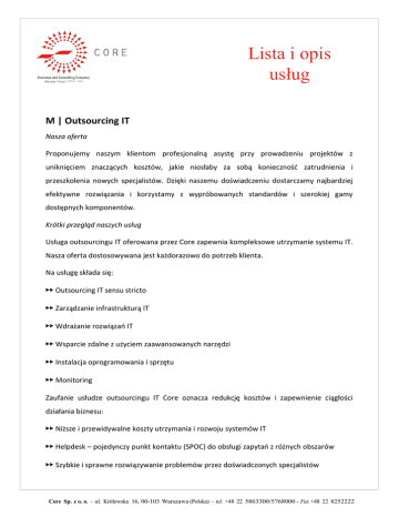 Milan, Italy Lista i opis usług M | Outsourcing IT Nasza oferta Proponujemy naszym klientom profesjonalną asystę przy prowadzeniu projektów z uniknięciem znaczących kosztów, jakie niosłaby za sobą konieczność zatrudnienia i przeszkolenia nowych specjalistów. Dzięki naszemu doświadczeniu dostarczamy najbardziej efektywne rozwiązania i korzystamy z wypróbowanych standardów i szerokiej gamy dostępnych komponentów. Krótki przegląd naszych usług Usługa outsourcingu IT oferowana przez Core zapewnia kompleksowe utrzymanie systemu IT. Nasza oferta dostosowywana jest każdorazowo do potrzeb klienta. Na usługę składa się: ▶▶ Outsourcing IT sensu stricto ▶▶ Zarządzanie infrastrukturą IT ▶▶ Wdrażanie rozwiązań IT ▶▶ Wsparcie zdalne z użyciem zaawansowanych narzędzi ▶▶ Instalacja oprogramowania i sprzętu ▶▶ Monitoring Zaufanie usłudze outsourcingu IT Core oznacza redukcję kosztów i zapewnienie ciągłości działania biznesu: ▶▶ Niższe i przewidywalne koszty utrzymania i rozwoju systemów IT ▶▶ Helpdesk – pojedynczy punkt kontaktu (SPOC) do obsługi zapytań z różnych obszarów ▶▶ Szybkie i sprawne rozwiązywanie problemów przez doświadczonych specjalistów Core Sp. z o. o. – ul. Królewska 16, 00-103 Warszawa (Polska) – tel. +48 22 5863300/5768000 - Fax +48 22 8252222