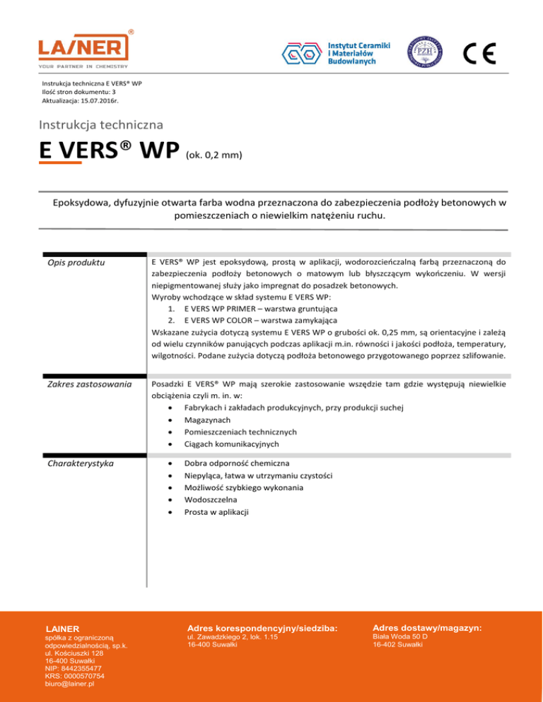 Instrukcja techniczna E VERS® WP Ilość stron dokumentu: 3 Aktualizacja: 15.07.2016r. Instrukcja techniczna E VERS® WP (ok. 0,2 mm) Epoksydowa, dyfuzyjnie otwarta farba wodna przeznaczona do zabezpieczenia podłoży betonowych w pomieszczeniach o niewielkim natężeniu ruchu. Opis produktu E VERS® WP jest epoksydową, prostą w aplikacji, wodorozcieńczalną farbą przeznaczoną do zabezpieczenia podłoży betonowych o matowym lub błyszczącym wykończeniu. W wersji niepigmentowanej służy jako impregnat do posadzek betonowych. Wyroby wchodzące w skład systemu E VERS WP: 1. E VERS WP PRIMER – warstwa gruntująca 2. E VERS WP COLOR – warstwa zamykająca Wskazane zużycia dotyczą systemu E VERS WP o grubości ok. 0,25 mm, są orientacyjne i zależą od wielu czynników panujących podczas aplikacji m.in. równości i jakości podłoża, temperatury, wilgotności. Podane zużycia dotyczą podłoża betonowego przygotowanego poprzez szlifowanie. Zakres zastosowania Posadzki E VERS® WP mają szerokie zastosowanie wszędzie tam gdzie występują niewielkie obciążenia czyli m. in. w: Fabrykach i zakładach produkcyjnych, przy produkcji suchej Magazynach Pomieszczeniach technicznych Ciągach komunikacyjnych Dobra odporność chemiczna Niepyląca, łatwa w utrzymaniu czystości Możliwość szybkiego wykonania Wodoszczelna Prosta w aplikacji Charakterystyka LAINER Adres korespondencyjny/siedziba: Adres dostawy/magazyn: spółka z ograniczoną odpowiedzialnością, sp.k. ul. Kościuszki 128 16-400 Suwałki NIP: 8442355477 KRS: 0000570754 [email protected] ul. Zawadzkiego 2, lok. 1.15 16-400 Suwałki Biała Woda 50 D 16-402 Suwałki Instrukcja techniczna E VERS® WP Ilość stron dokumentu: 3 Aktualizacja: 15.07.2016r. Dane techniczne Klasa reakcji na ogień Bfl-S1 Odporność na ścieranie < 3000 mg Przyczepność przy odrywaniu ≥ 1,5 N/mm 2 Odporność na uderzenie Klasa II: ≥ 10 Nm Wytrzymałość na zginanie F20 Jakość powierzchni bazowej Powierzchnia bazowa jest zazwyczaj powierzchnią betonową lub polimerową. Powierzchnia bazowa musi być czysta i wolna od kurzu oraz luźnych cząsteczek. Beton musi być wyraźnie suchy, o wytrzymałości na rozciąganie minimum 1,5 N/mm2. Zanieczyszczenia w rodzaju zatłuszczenia, zaolejenia, pozostałości farb, związków chemicznych i mleczka cementowego muszą zostać bezwzględnie usunięte. Przygotowanie powierzchni bazowej Najlepszą metodą przygotowania powierzchni jest bezpyłowe śrutowanie. Dopuszcza się możliwość innego przygotowania, jak np.: frezowanie, ręczne lub maszynowe czyszczenie szlifowanie, opalanie itp. Mieszanie i nakładanie Najlepszą metodą przygotowania powierzchni jest bezpyłowe śrutowanie. Dopuszcza się możliwość innego przygotowania, jak np.: frezowanie, ręczne lub maszynowe czyszczenie szlifowanie, opalanie itp. Zużycie materiału Zużycie materiału zależy od nierówności i stopnia przygotowanego podłoża, temperatury, grubości powłoki oraz stosowanych narzędzi i metody nakładania. Czas wiązania W warunkach temperaturowych od 15 °C do 25 °C należy przyjąć następujące wartości: Czyszczenie Ruch pieszy - 12 godzin Lekki ruch kołowy - 24 godziny Pełne utwardzenie - 7 dni W przypadku konieczności czyszczenia podłoża lub narzędzi z nieutwardzonych materiałów można stosować odpowiednie rozpuszczalniki organiczne i czyściwa. Takim rozpuszczalnikiem może być ksylen. Operacje takie najlepiej przeprowadzać poza obszarem wykonywanych prac w specjalnie wyznaczonym miejscu. Zabrudzenia po utwardzeniu materiału są nierozpuszczalne i można je oczyścić mechanicznie. LAINER Adres korespondencyjny/siedziba: Adres dostawy/magazyn: spółka z ograniczoną odpowiedzialnością, sp.k. ul. Kościuszki 128 16-400 Suwałki NIP: 8442355477 KRS: 0000570754 [email protected] ul. Zawadzkiego 2, lok. 1.15 16-400 Suwałki Biała Woda 50 D 16-402 Suwałki Instrukcja techniczna E VERS® WP Ilość stron dokumentu: 3 Aktualizacja: 15.07.2016r. Uwagi BHP Do każdego dostarczanego materiału i składnika dostarczane są Karty Charakterystyki. Podczas manipulowania, mieszania i aplikowania zaleca się stosowanie okularów i rękawic ochronnych oraz masek p. pyłowych. Magazynowanie Wszystkie materiały wchodzące w skład systemu E VERS® WP powinny być przechowywane w suchych i zacienionych miejscach. Optymalne temperatury to 10 – 15 °C. Wpływ na środowisko Posadzka E VERS® SL jest wolna od rozpuszczalników i jako produkt końcowy uważana jest za nieszkodliwy dla zdrowia i środowiska. Kolorystyka E VERS® WP występuje w 8 podstawowych kolorach wg wzornika Lainer: 500 WP - jasnoszary (zbliżony do RAL 7035) 501 WP – ciemnoszary (zbliżony do RAL 7045) 502 WP – jasnobeżowy (zbliżony do RAL 1013) 503 WP – ciemnobeżowy (zbliżony do RAL 1001) 504 WP – zielony (zbliżony do RAL 6025) 505 WP – czerwony (zbliżony do RAL 3013) 506 WP – musztardowy (zbliżony do RAL 1006) 507 WP – niebieski (zbliżony do RAL 5012) Atesty i certyfikaty: 273/322/290/216 – atest higieniczny wydany przez Zakład Toksykologii Środowiska – Gdański Uniwersytet Medyczny LAINER spółka z ograniczoną odpowiedzialnością, sp. k. gwarantuje wysoką jakość dostarczanych materiałów i bierze pełną odpowiedzialność za ewentualne wady oferowanych materiałów. Jednak ze względu na zmienność warunków montażu i zastosowań produktów LAINER, informacje zawarte w niniejszej karcie stanowią jedynie ogólne wytyczne dotyczące zastosowania. Klient ponosi wyłączną odpowiedzialność za wykorzystanie wyrobu bez uprzedniej konsultacji z LAINER w innych obszarach zastosowań niż podano w niniejszej karcie technicznej, a także za ewentualne szkody z tego wynikające. Wszystkie materiały mogą być stosowane jedynie przez przeszkolone i doświadczone brygady wykonawcze. Bezpośrednio przed aplikacją Klient jest zobowiązany do sprawdzenia stanu podłoża, warunków klimatycznych i ja