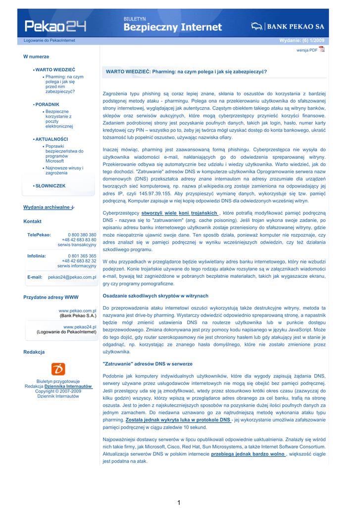 Wydanie: (6) 1/2009 Logowanie do PekaoInternet wersja PDF W numerze WARTO WIEDZIEĆ Pharming: na czym polega i jak się przed nim zabezpieczyć? PORADNIK Bezpieczne korzystanie z poczty elektronicznej AKTUALNOŚCI Poprawki bezpieczeństwa do programów Microsoft Najnowsze wirusy i zagrożenia SŁOWNICZEK WARTO WIEDZIEĆ: Pharming: na czym polega i jak się zabezpieczyć? Zagrożenia typu phishing są coraz lepiej znane, skłania to oszustów do korzystania z bardziej podstępnej metody ataku - pharmingu. Polega ona na przekierowaniu użytkownika do sfałszowanej strony internetowej, wyglądającej jak autentyczna. Częstym obiektem takiego ataku są witryny banków, sklepów oraz serwisów aukcyjnych, które mogą cyberprzestępcy przynieść korzyści finansowe. Zadaniem podrobionej strony jest pozyskanie poufnych danych, takich jak login, hasło, numer karty kredytowej czy PIN – wszystko po to, żeby jej twórca mógł uzyskać dostęp do konta bankowego, ukraść tożsamość lub popełnić oszustwo, używając nazwiska ofiary. Inaczej mówiąc, pharming jest zaawansowaną formą phishingu. Cyberprzestępca nie wysyła do użytkownika wiadomości e-mail, nakłaniających go do odwiedzenia spreparowanej witryny. Przekierowanie odbywa się automatycznie bez udziału i wiedzy użytkownika. Warto wiedzieć, jak do tego dochodzi. "Zatruwanie" adresów DNS w komputerze użytkownika Oprogramowanie serwera nazw domenowych (DNS) przekształca adresy znane internautom na adresy zrozumiałe dla urządzeń tworzących sieć komputerową, np. nazwa pl.wikipedia.org zostaje zamieniona na odpowiadający jej adres IP, czyli 145.97.39.155. Aby przyspieszyć wymianę danych, wykorzystuje się tzw. pamięć podręczną. Komputer zapisuje w niej kopię odpowiedzi DNS dla odwiedzonych wcześniej witryn. Wydania archiwalne Cyberprzestępcy stworzyli wiele koni trojańskich , które potrafią modyfikować pamięć podręczną DNS - nazywa się to "zatruwaniem" (ang. cache poisoning). Jeśli trojan wykona swoje zadanie, po wpisaniu adresu banku internetowego użytkownik zostaje przeniesiony do sfałszowanej witryny, gdzie Kontakt TelePekao: 0 800 380 380 +48 42 683 83 80 serwis transakcyjny może nieopatrznie ujawnić swoje dane. Ten sposób działa, ponieważ komputer nie rozpoznaje, czy adres znalazł się w pamięci podręcznej w wyniku wcześniejszych odwiedzin, czy też działania Infolinia: 0 801 365 365 +48 42 683 82 32 serwis informacyjny W obu przypadkach w przeglądarce będzie wyświetlany adres banku internetowego, który nie wzbudzi E-mail: [email protected] szkodliwego programu. podejrzeń. Konie trojańskie używane do tego rodzaju ataków rozsyłane są w załącznikach wiadomości e-mail, bywają też zagnieżdżone w pobranych bezpłatnie materiałach, takich jak wygaszacze ekranu, gry czy programy pornograficzne. Przydatne adresy WWW Osadzanie szkodliwych skryptów w witrynach www.pekao.com.pl (Bank Pekao S.A.) Do przeprowadzenia ataku internetowi oszuści wykorzystują także destrukcyjne witryny, metoda ta nazywana jest drive-by pharming. Wystarczy odwiedzić odpowiednio spreparowaną stronę, a napastnik www.pekao24.pl (Logowanie do PekaoInternet) będzie mógł zmienić ustawienia DNS na routerze użytkownika lub w punkcie dostępu bezprzewodowego. Zmiana dokonywana jest przy pomocy kodu napisanego w języku JavaScript. Może do tego dojść, gdy router szerokopasmowy nie jest chroniony hasłem lub gdy atakujący jest w stanie je odgadnąć, np. korzystając ze znanego hasła domyślnego, które nie zostało zmienione przez Redakcja użytkownika. "Zatruwanie" adresów DNS w serwerze Biuletyn przygotowuje Redakcja Dziennika Internautów Copyright © 2007-2009 Dziennik Internautów Podobnie jak komputery indywidualnych użytkowników, które dla wygody zapisują żądania DNS, serwery używane przez usługodawców internetowych nie mogą się obejść bez pamięci podręcznej. Jeśli przestępcy uda się ją zmodyfikować, wtedy przez stosunkowo krótki okres czasu (zazwyczaj do kilku godzin) wszyscy, którzy wpiszą w przeglądarce adres obranego za cel banku, trafią na stronę oszusta. Jest to jeden z najskuteczniejszych sposobów na pozyskanie dużej ilości poufnych danych za jednym zamachem. Do niedawna uznawano go za najtrudniejszą metodę wykonania ataku typu pharming. Została jednak wykryta luka w protokole DNS - jej wykorzystanie umożliwia zafałszowanie pamięci podręcznej w ciągu zaledwie 10 sekund. Najpoważniejsi dostawcy serwerów w lipcu opublikowali odpowiednie uaktualnienia. Znalazły się wśród nich takie firmy, jak Microsoft, Cisco, Red Hat, Sun Microsystems, a także Internet Software Consortium. Aktualizacja serwerów DNS w polskim internecie przebiega jednak bardzo wolno , większość ciągle jest podatna na atak. 1 jest podatna na atak. Jak uchronić się przed pharmingiem? 1. Należy używać regularnie aktualizowanego oprogramowania antywirusowego oraz zapory ogniowej (firewalla). Wykluczy to możliwość zmiany ustawień naszego komputera przez konie trojańskie lub wirusy. 2. Warto korzystać z usług zaufanego i uprawnionego dostawcy internetowego – stosowane przez niego zabezpieczenia są pierwszą linią obrony przed pharmingiem. 3. Należy upewnić się, czy nasz router jest chroniony unikalnym hasłem. Większość routerów jest dostarczanych z domyślnym hasłem administratora, które agresorzy mogą łatwo odgadnąć. 4. Trzeba sprawdzać adres każdej strony, która żąda podania informacji identyfikacyjnych. Należy upewnić się, że sesja jest nawiązywana pod znanym autentycznym adresem witryny i że nie są do niego dołączone żadne dodatkowe znaki. 5. Zaleca się szczególną ostrożność, jeżeli z okna przeglądarki nagle znikną symbole bezpiecznego połączenia (np. mała kłódka pasku statusu, litera "s" w "https://" przed internetowym adresem banku) lub gdy strona wygląda inaczej niż zwykle. Wtedy najlepiej jest przerwa