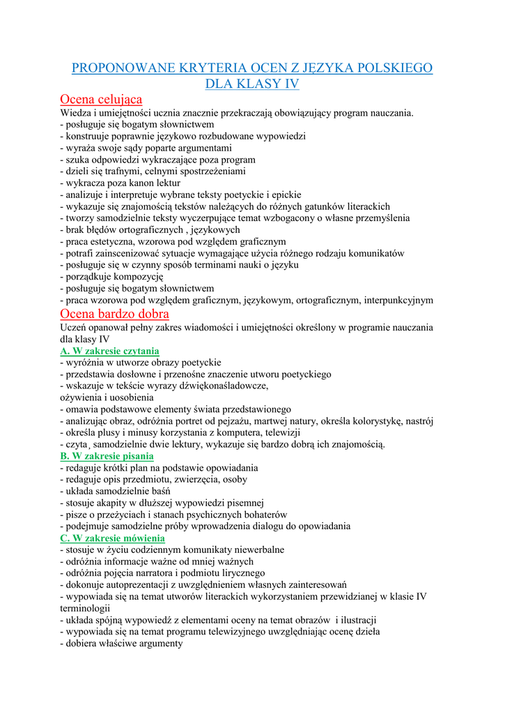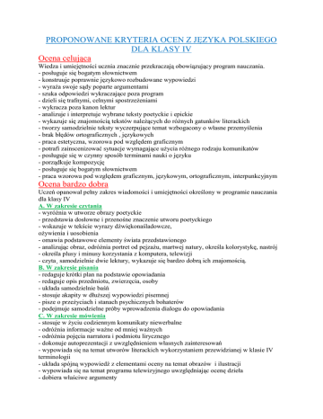 PROPONOWANE KRYTERIA OCEN Z JĘZYKA POLSKIEGO DLA KLASY IV Ocena celująca Wiedza i umiejętności ucznia znacznie przekraczają obowiązujący program nauczania. - posługuje się bogatym słownictwem - konstruuje poprawnie językowo rozbudowane wypowiedzi - wyraża swoje sądy poparte argumentami - szuka odpowiedzi wykraczające poza program - dzieli się trafnymi, celnymi spostrzeżeniami - wykracza poza kanon lektur - analizuje i interpretuje wybrane teksty poetyckie i epickie - wykazuje się znajomością tekstów należących do różnych gatunków literackich - tworzy samodzielnie teksty wyczerpujące temat wzbogacony o własne przemyślenia - brak błędów ortograficznych , językowych - praca estetyczna, wzorowa pod względem graficznym - potrafi zainscenizować sytuacje wymagające użycia różnego rodzaju komunikatów - posługuje się w czynny sposób terminami nauki o języku - porządkuje kompozycję - posługuje się bogatym słownictwem - praca wzorowa pod względem graficznym, językowym, ortograficznym, interpunkcyjnym Ocena bardzo dobra Uczeń opanował pełny zakres wiadomości i umiejętności określony w programie nauczania dla klasy IV A. W zakresie czytania - wyróżnia w utworze obrazy poetyckie - przedstawia dosłowne i przenośne znaczenie utworu poetyckiego - wskazuje w tekście wyrazy dźwiękonaśladowcze, ożywienia i uosobienia - omawia podstawowe elementy świata przedstawionego - analizując obraz, odróżnia portret od pejzażu, martwej natury, określa kolorystykę, nastrój - określa plusy i minusy korzystania z komputera, telewizji - czyta¸ samodzielnie dwie lektury, wykazuje się bardzo dobrą ich znajomością. B. W zakresie pisania - redaguje krótki plan na podstawie opowiadania - redaguje opis przedmiotu, zwierzęcia, osoby - układa samodzielnie baśń - stosuje akapity w dłuższej wypowiedzi pisemnej - pisze o przeżyciach i stanach psychicznych bohaterów - podejmuje samodzielne próby wprowadzenia dialogu do opowiadania C. W zakresie mówienia - stosuje w życiu codziennym komunikaty niewerbalne - odróżnia informacje ważne od mniej ważnych - odróżnia pojęcia narratora i podmiotu lirycznego - dokonuje autoprezentacji z uwzględnieniem własnych zainteresowań - wypowiada się na temat utworów literackich wykorzystaniem przewidzianej w klasie IV terminologii - układa spójną wypowiedź z elementami oceny na temat obrazów i ilustracji - wypowiada się na temat programu telewizyjnego uwzględniając ocenę dzieła - dobiera właściwe argumenty - zna podstawową zasadę akcentowania, poprawnie akcentuje dane przykłady D. W zakresie wiedzy o języku 1. Głoska, litera, sylaba - odróżnia głoski dźwięczne i bezdźwięczne, twarde i miękkie, ustne i nosowe - poprawnie akcentuje wyrazy 2. Wyraz - używa bezokoliczników - poprawnie stosuje formy czasowników w różnych - buduje zdania z różnymi formami rzeczowników - ustala, jakich przypadków wymagają poszczególne rzeczowniki - uzupełnia tekst odpowiednimi formami przymiotnika - dostrzega związki miedzy przysłówkiem a czasownikiem oraz przymiotnikiem a rzeczownikiem - ustala funkcje przyimków i spójników w zdaniach 3. Zdanie - używa zdań zgodnie z intencją nadawcy - stosuje odpowiednie znaki interpunkcyjne w tekście - rozwija zdania poprzez dodawanie określeń do podmiotu i orzeczenia - tworzy opis na podstawie ilustracji bądź zdjęcia - wplata do opowiadania inne formy wypowiedzi - pisze poprawnie pod względem ortograficznym, gramatycznym, interpunkcyjnym - świadomie stosuje reguły ortograficzne - stosuje wiedzę w praktyce Ocena dobra Uczeń opanował wiadomości i umiejętności przewidziane programem nauczania dla klasy IV. A. W zakresie czytania - czyta cicho, głośno z odpowiednią artykulacją i uwzględnieniem znaków przestankowych - wyszukuje w tekście informacje - określa temat utworu - zna pojęcia: wers, rym, strofa i refren - przedstawia fabułę utworu - dostrzega pozytywne i negatywne postawy bohaterów - układa i rozwiązuje proste rebusy, zagadki, krzyżówki - podaje najważniejsze cechy baśni, komiksu, legendy - korzysta ze słowników wyrazów bliskoznacznych - korzysta z innych źródeł informacji B. W zakresie pisania - konstruuje wypowiedzenia jednozdaniowe różnego typu z zachowaniem reguł ortograficznych - podejmuje próbę sporządzenia planu ogólnego zdarzeń - układa i poprawnie zapisuje dialog - redaguje list z zastosowaniem zwrotów grzecznościowych - redaguje krótkie opowiadanie twórcze oparte na własnych doświadczeniach - wspólnie redaguje i zapisuje krótką rozmowę związaną z codzienną - poprawnie konstruuje wypowiedź - określa tematykę ogłoszenia i zawiadomienia - zachowuje chronologie wydarzeń - prawidłowo zapisuje dialog - stosuje podstawowe reguły ortograficzne i stosuje je w praktyce C. W zakresie mówienia - aktywnie i uważnie słucha innych osób - rozpoznaje intencję mówiącego - zna i potrafi przedstawić elementy świata przedstawionego - potrafi ocenić postępowanie bohatera literackiego - potrafi przedstawić treść utworu literackiego w formie ilustracji, krótkiej scenki lub krótkiej inscenizacji - mówi z przejrzystością intencji - wyraża swoje refleksje i uczucia - opowiada przebieg wydarzeń zgodnie z chronologią - stosuje we własnych tekstach opis i opowiadanie - wyraża własne uczucia - formułuje prośbę i podziękowanie - rozróżnia nadawcę i odbiorcę D. W zakresie wiedzy o języku 1. Głoska, litera, sylaba - porządkuje wyrazy w kolejności alfabetycznej - ustala różnicę między głoską a literą - odróżnia samogłoski od spółgłosek 2. Wyraz - tworzy poprawne formy trudnych czasowników - odmienia czasowniki i używa ich w zdaniu - odróżnia rzeczowniki własne od pospolitych i poprawnie je zapisuje - ustala, o czym informują liczby i przypadki rzeczownika - określa formy rzeczowników - umie zastosować odpowiednie formy przymiotnika w zdani