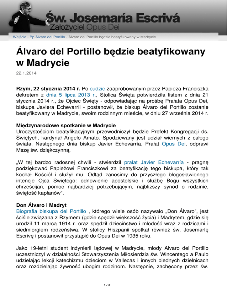 Wejście - Bp Álvaro del Portillo - Álvaro del Portillo będzie beatyfikowany w Madrycie Álvaro del Portillo będzie beatyfikowany w Madrycie 22.1.2014 Rzym, 22 stycznia 2014 r. Po cudzie zaaprobowanym przez Papieża Franciszka dekretem z dnia 5 lipca 2013 r., Stolica Święta potwierdziła listem z dnia 21 stycznia 2014 r., że Ojciec Święty - odpowiadając na prośbę Prałata Opus Dei, biskupa Javiera Echevarríi - postanowił, że biskup Álvaro del Portillo zostanie beatyfikowany w Madrycie, swoim rodzinnym mieście, w dniu 27 września 2014 r. Międzynarodowe spotkanie w Madrycie Uroczystościom beatyfikacyjnym przewodniczył będzie Prefekt Kongregacji ds. Świętych, kardynał Angelo Amato. Spodziewany jest udział wiernych z całego świata. Następnego dnia biskup Javier Echevarría, Prałat Opus Dei, odprawi Mszę św. dziękczynną. „W tej bardzo radosnej chwili - stwierdził prałat Javier Echevarría - pragnę podziękować Papieżowi Franciszkowi za beatyfikację tego biskupa, który tak kochał Kościół i służył mu. Odtąd zanosimy do przyszłego błogosławionego intencje Ojca Świętego: odnowienie apostolskie i służbę Bogu wszystkich chrześcijan, pomoc najbardziej potrzebującym, najbliższy synod o rodzinie, świętość kapłanów". Don Álvaro i Madryt Biografia biskupa del Portillo , którego wiele osób nazywało „Don Álvaro”, jest ściśle związana z Rzymem (gdzie spędził większość życia) i Madrytem, gdzie się urodził 11 marca 1914 r. oraz spędził dzieciństwo i młodość wraz z rodzicami i siedmiorgiem rodzeństwa. W stolicy Hiszpanii spotkał również św. Josemaríę Escrivę i postanowił przystąpić do Opus Dei w 1935 roku. Jako 19-letni student inżynierii lądowej w Madrycie, młody Alvaro del Portillo uczestniczył w działalności Stowarzyszenia Miłosierdzia św. Wincentego a Paulo udzielając lekcji katechizmu dzieciom w Vallecas i innych biednych dzielnicach oraz rozdzielając żywność ubogim rodzinom. Następnie, zachęcony przez św. 1/3 Josemaríę, kontynuował podobną działalność z młodymi ludźmi uczestniczącymi w początkach pracy Opus Dei organizowanych przy Akademii DYA. W dniu 2 czerwca 1944 r., po ukończeniu studiów świeckich i kościelnych, otrzymał święcenia kapłańskie w Madrycie z rąk biskupa diecezji Leopoldo Eijo y Garay i tam pełnił posługę kapłańską dopóki nie przeniósł się do Rzymu w 1946 roku. Miejsce beatyfikacji Jak powszechnie wiadomo, dekret papieski Benedykta XVI w sprawie obrzędów beatyfikacji kanonizacji, promulgowany przez Kongregację ds. Świętych w dniu 29 września 2005 r., stwierdza, że uroczystościom beatyfikacyjnym będzie przewodniczył przedstawiciel Ojca Świętego, zazwyczaj prefekt powyższej Kongregacji, w miejscu uznanym za najbardziej stosowne. Ten sam dekret stanowi również, że jedynie uroczystościom kanonizacyjnym będzie przewodniczył Papież. Z tego powodu, po ogłoszeniu planowanej beatyfikacji, rozważano kilka możliwości, w szczególności miejsce w centrum Rzymu, inne niż Plac św. Piotra, który zarezerwowany jest dla Ojca Świętego. Z uwagi na dużą liczbę spodziewanych uczestników uroczystości propozycja ta okazała się jednak trudna do zrealizowania i Kongregacja uznała za szczególnie dogodne drugie rozwiązanie, które samo się narzucało: organizację uroczystości w Madrycie, miejscu urodzin Álvaro del Portillo, w roku, w którym obchodzone jest 100-lecie jego urodzin, co również umożliwi udział w uroczystościach większej liczbie jego rodaków, dla których podróż do Rzymu byłaby trudna z powodu trwającego kryzysu gospodarczego. Przygotowywane są są już plany przyjęcia uczestników z całego świata, m.in. wizyty w Katedrze Almudena i miejscach związanych z życiem Álvaro del Portillo oraz początkami Opus Dei, założonego przez św. Josemaríę Escrivę w Madrycie w dniu 2 października 1928 r. W Rzymie, blisko Papieża Franciszka Komitet organizacyjny przygotowuje również szereg wydarzeń w Rzymie dla uczestników, którzy zechcą przedłużyć swoją pielgrzymkę, aby odwiedzić Następcę św. Piotra („videre Petrum” - zobaczyć Piotra, jak lubił powtarzać św. Josemaría, cytując zdanie św. Pawła). Władze cywilne rozważają możliwość tymczasowego przeniesienia trumny z ciałem Don Álvaro, która spoczywa w krypcie Kościoła Prałackiego Matki Bożej 2/3 Królowej Pokoju w Rzymie, do dużo większej Bazyliki św. Eugeniusza, aby zrobić miejsce dla osób pragnących pomodlić się przed doczesnymi szczątkami Błogosławionego Álvaro del Portillo. Po beatyfikacji w jednej z rzymskich bazylik odprawiona zostanie Msza św. dziękczynna. Wierni będą mogli również wziąć udział w środowej audiencji z Papieżem Franciszkiem i w ten sposób wyrazić swoją pełną wdzięczności więź z Ojcem Świętym. Wszyscy razem, śladami Don Álvaro Zarówno w Rzymie jak i w Madrycie organizowane będą działania promowane przez Harambee Africa International w celu sfinansowania czterech projektów w dziedzinie ochrony zdrowia i edukacji w regionie podsaharyjskim, które powstały z inspiracji biskupa Alvaro del Portillo w latach, gdy był on Prałatem Opus Dei. W języku suahili Harambee oznacza „jeden za wszystkich”. Uczestnicy beatyfikacji będą mogli wesprzeć swoimi ofiarami uruchomienia centrum matki i dziecka przy szpitalu Niger (Enugu, Nigeria), rozbudowy i unowocześnienia placówek w trzech centrach medycznych szkoły pielęgniarskiej przy szpitalu Monkole (Kinszasa, Kongo) oraz rozwoju programu zwalczającego niedożywienie dzieci w ośrodku wiejskim Ilomba (Bingerville, Wybrzeże Kości Słoniowej). Celem czwartego projektu jest ufundowanie stypendiów dla seminarzystów z Afryki na Papieskim Uniwersytecie Świętego Krzyża, instytucji założonej w Rzymie przez biskupa Alvaro del Portillo, zgodnie z pragnieniem św. Josemaríi Escrivy. Rosalinda Corbi, koordyn