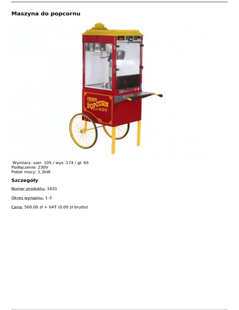 Maszyna do popcornu Wymiary: szer. 105 / wys. 174 / gł. 65 Podłączenie: 230V Pobór mocy: 1,3kW Szczegóły Numer produktu: 1631 Okres wynajmu: 1-3 Cena: 500.00 zł + VAT (0.00 zł brutto) Powered by TCPDF (www.tcpdf.org)
