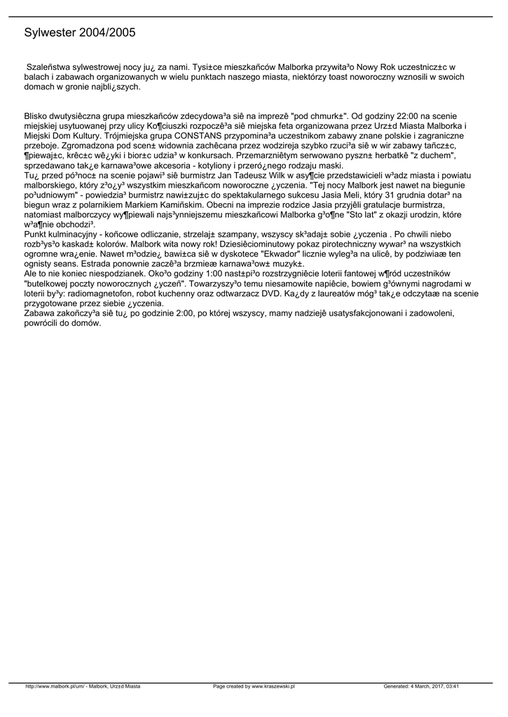 Sylwester 2004/2005 Szaleñstwa sylwestrowej nocy ju¿ za nami. Tysi±ce mieszkañców Malborka przywita³o Nowy Rok uczestnicz±c w balach i zabawach organizowanych w wielu punktach naszego miasta, niektórzy toast noworoczny wznosili w swoich domach w gronie najbli¿szych. Blisko dwutysiêczna grupa mieszkañców zdecydowa³a siê na imprezê "pod chmurk±". Od godziny 22:00 na scenie miejskiej usytuowanej przy ulicy Ko¶ciuszki rozpoczê³a siê miejska feta organizowana przez Urz±d Miasta Malborka i Miejski Dom Kultury. Trójmiejska grupa CONSTANS przypomina³a uczestnikom zabawy znane polskie i zagraniczne przeboje. Zgromadzona pod scen± widownia zachêcana przez wodzireja szybko rzuci³a siê w wir zabawy tañcz±c, ¶piewaj±c, krêc±c wê¿yki i bior±c udzia³ w konkursach. Przemarzniêtym serwowano pyszn± herbatkê "z duchem", sprzedawano tak¿e karnawa³owe akcesoria - kotyliony i przeró¿nego rodzaju maski. Tu¿ przed pó³noc± na scenie pojawi³ siê burmistrz Jan Tadeusz Wilk w asy¶cie przedstawicieli w³adz miasta i powiatu malborskiego, który z³o¿y³ wszystkim mieszkañcom noworoczne ¿yczenia. "Tej nocy Malbork jest nawet na biegunie po³udniowym" - powiedzia³ burmistrz nawi±zuj±c do spektakularnego sukcesu Jasia Meli, który 31 grudnia dotar³ na biegun wraz z polarnikiem Markiem Kamiñskim. Obecni na imprezie rodzice Jasia przyjêli gratulacje burmistrza, natomiast malborczycy wy¶piewali najs³ynniejszemu mieszkañcowi Malborka g³o¶ne "Sto lat" z okazji urodzin, które w³a¶nie obchodzi³. Punkt kulminacyjny - koñcowe odliczanie, strzelaj± szampany, wszyscy sk³adaj± sobie ¿yczenia . Po chwili niebo rozb³ys³o kaskad± kolorów. Malbork wita nowy rok! Dziesiêciominutowy pokaz pirotechniczny wywar³ na wszystkich ogromne wra¿enie. Nawet m³odzie¿ bawi±ca siê w dyskotece "Ekwador" licznie wyleg³a na ulicê, by podziwiaæ ten ognisty seans. Estrada ponownie zaczê³a brzmieæ karnawa³ow± muzyk±. Ale to nie koniec niespodzianek. Oko³o godziny 1:00 nast±pi³o rozstrzygniêcie loterii fantowej w¶ród uczestników "butelkowej poczty noworocznych ¿yczeñ". Towarzyszy³o temu niesamowite napiêcie, bowiem g³ównymi nagrodami w loterii by³y: radiomagnetofon, robot kuchenny oraz odtwarzacz DVD. Ka¿dy z laureatów móg³ tak¿e odczytaæ na scenie przygotowane przez siebie ¿yczenia. Zabawa zakoñczy³a siê tu¿ po godzinie 2:00, po której wszyscy, mamy nadziejê usatysfakcjonowani i zadowoleni, powrócili do domów. http://www.malbork.pl/um/ - Malbork, Urz±d Miasta Page created by www.kraszewski.pl Generated: 4 March, 2017, 03:41