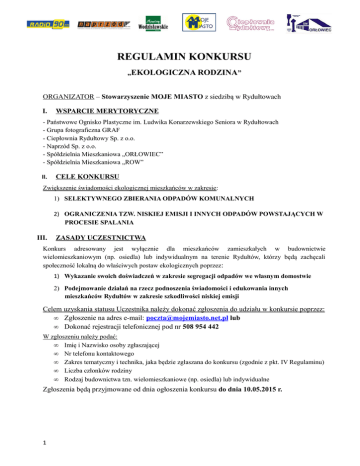 REGULAMIN KONKURSU „EKOLOGICZNA RODZINA” ORGANIZATOR – Stowarzyszenie MOJE MIASTO z siedzibą w Rydułtowach I. WSPARCIE MERYTORYCZNE - Państwowe Ognisko Plastyczne im. Ludwika Konarzewskiego Seniora w Rydułtowach - Grupa fotograficzna GRAF - Ciepłownia Rydułtowy Sp. z o.o. - Naprzód Sp. z o.o. - Spółdzielnia Mieszkaniowa „ORŁOWIEC” - Spółdzielnia Mieszkaniowa „ROW” II. CELE KONKURSU Zwiększenie świadomości ekologicznej mieszkańców w zakresie: 1) SELEKTYWNEGO ZBIERANIA ODPADÓW KOMUNALNYCH 2) OGRANICZENIA TZW. NISKIEJ EMISJI I INNYCH ODPADÓW POWSTAJĄCYCH W PROCESIE SPALANIA III. ZASADY UCZESTNICTWA Konkurs adresowany jest wyłącznie dla mieszkańców zamieszkałych w budownictwie wielomieszkaniowym (np. osiedla) lub indywidualnym na terenie Rydułtów, którzy będą zachęcali społeczność lokalną do właściwych postaw ekologicznych poprzez : 1) Wykazanie swoich doświadczeń w zakresie segregacji odpadów we własnym domostwie 2) Podejmowanie działań na rzecz podnoszenia świadomości i edukowania innych mieszkańców Rydułtów w zakresie szkodliwości niskiej emisji Celem uzyskania statusu Uczestnika należy dokonać zgłoszenia do udziału w konkursie poprzez: • Zgłoszenie na adres e-mail: [email protected] lub • Dokonać rejestracji telefonicznej pod nr 508 954 442 W zgłoszeniu należy podać: • Imię i Nazwisko osoby zgłaszającej • Nr telefonu kontaktowego • Zakres tematyczny i technika, jaka będzie zgłaszana do konkursu (zgodnie z pkt. IV Regulaminu) • Liczba członków rodziny • Rodzaj budownictwa tzn. wielomieszkaniowe (np. osiedla) lub indywidualne Zgłoszenia będą przyjmowane od dnia ogłoszenia konkursu do dnia 10.05.2015 r. 1 IV. DZIAŁANIA PODLEGAJĄCE OCENIE W RAMACH KONKURSU W ramach konkursu zadaniem uczestników będzie, w sposób jak najbardziej innowacyjny zachęcić mieszkańców Rydułtów do właściwych postaw proekologicznych. Dopuszcza się takie techniki jak: a) MEDIALNE np. • film (do 5 min. w formacie mp4 lub wav na płycie CD/DVD lub innym nośniku) • fotografia (w formie drukowanej lub medialnej na płycie CD/DVD lub innym nośniku) • prezentacja multimedialna (w programie MS Power Point na płycie CD/DVD lub innym nośniku) • wpisy na portalach społecznościowych (wydruk na papierze formatu A4 zrzutów ekranowych wpisów na wybranym portalu społecznościowym np. Facebook, Twitter lub inny oraz wskazanie linku do danego portalu) b) PLASTYCZNE np. • malarstwo, • rysunek, • plakat, • grafika, • techniki mieszane (płaskie) (format prac A4 lub A 3, prace można oprawiać. Prosimy nie rolować prac) Prace powinny wskazywać działania proekologiczne swojej rodziny oraz pobudzające świadomość ekologiczną innych mieszkańców w zakresie segregacji odpadów lub skutków spalania odpadów na cele ogrzewania i emisji do środowiska. c) OPISY DZIAŁANIA PROEKOLOGICZNEGO np. • Żywieniowy recykling, czyli jak ja i moja rodzina dbamy o czyste środowisko poprzez odpowiedni dobór kupowanych produktów ograniczających ilości powstających odpadów. • Dlaczego nie wolno spalać odpadów i jakie skutki rodzi to w środowisku człowieka. • Jakie działania mogą prowadzić do ograniczenia lub wyeliminowania wpływu instalacji grzewczych na środowisko • Jak ja i moja rodzina zapobiegamy i co radzimy innym, aby nie degradować środowiska naturalnego z uwzględnieniem segregacji odpadów i/lub ograniczenia niskiej emisji. Opis działań może być w formie opowiadania, do którego mogą być dołączone fotografie lub inne dokumenty. Objętość pracy nie powinna przekraczać 3 stron formatu A4 V. TERMIN I MIEJSCE ZGŁASZANIA PRAC Prace należy składać do 20.05.2015 roku w siedzibie Stowarzyszenia MOJE MIASTO ul. Bohaterów Warszawy 104 B w godzinach od 1100 do 1800 od poniedziałku do piątku. Prace powinny być opisane i zawierające takie informacje jak: • Imię i nazwisko osoby zgłaszającej • • 2 Nr telefonu kontaktowego Zakres tematyczny i technika, jakie zostały zgłoszone do konkursu VI. KRYTERIA OCENY PRAC KONKURSOWYCH Ocena prac dokonana zostanie przez Komisję konkursową powołaną przez organizatora konkursu. Komisja składać się będzie z przedstawicieli wspierających merytorycznie konkurs „Ekologiczna Rodzina” wskazanych w pkt. I niniejszego Regulaminu jak również mediów. Komisja uwzględni następujące kryteria: • • Oryginalność i innowacyjność pracy • Pomysłowość i efektywność przekazu • Sposób prezentacji działań ekologicznych • • Wartość merytoryczną przekazu Walory estetyczne prezentowanych materiałów Przekaz treści ekologicznej zawartej w haśle konkursu VII. NAGRODY Przewiduje się nagrody rzeczowe dla laureatów konkursu jak i wszystkich uczestników projektu. 1) Dla laureatów konkursu w zakresie: a) SELEKTYWNEGO ZBIERANIA ODPADÓW KOMUNALNYCH I miejsce – nagroda o wartości 550,00 zł II miejsce – nagroda o wartości 450,00 zł III miejsce – nagroda o wartości 350,00 zł Dodatkowo, dla mieszkańców zamieszkałych w zabudowie wielomieszkaniowej (na zasobach Spółdzielni „ORŁOWIEC”) w zakresie selektywnego zbierania odpadów komunalnych przewidziano dla laureatów następującą pulę nagród: I miejsce – nagroda o wartości 400,00 zł II miejsce – nagroda o wartości 300,00 zł III miejsce – nagroda o wartości 200,00 zł Fundatorem nagród w tym zakresie tematycznym będzie Spółdzielnia Mieszkaniowa „ORŁOWIEC” b) OGRANICZENIA TZW. NISKIEJ EMISJI I miejsce – nagroda o wartości 550,00 zł II miejsce – nagroda o wartości 450,00 zł III miejsce – nagroda o wartości 350,00 zł Fundatorem nagród w tym zakresie tematycznym będzie Ciepłownia Rydułtowy Sp. zo.o. z siedzibą w Rydułtowach. Dla pozostałych uczestników (nie będących laureatami w wymienionych wyżej kategoriach) przewiduje się nagrody na które Organizator przeznacza łączną pulę środków w wysokości 