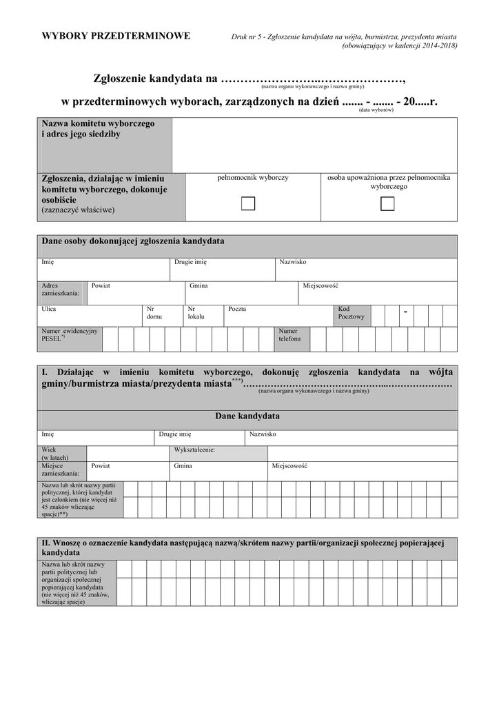 WYBORY PRZEDTERMINOWE Druk nr 5 - Zgłoszenie kandydata na wójta, burmistrza, prezydenta miasta (obowiązujący w kadencji 2014-2018) Zgłoszenie kandydata na ……………………..…………………, (nazwa organu wykonawczego i nazwa gminy) w przedterminowych wyborach, zarządzonych na dzień ....... - ....... - 20.....r. (data wyborów) Nazwa komitetu wyborczego i adres jego siedziby pełnomocnik wyborczy Zgłoszenia, działając w imieniu komitetu wyborczego, dokonuje osobiście osoba upoważniona przez pełnomocnika wyborczego (zaznaczyć właściwe) Dane osoby dokonującej zgłoszenia kandydata Imię Drugie imię Adres zamieszkania: Powiat Ulica Nazwisko Gmina Nr domu Miejscowość Nr lokalu Poczta Kod Pocztowy Numer ewidencyjny PESEL*) - Numer telefonu wyborczego, dokonuję zgłoszenia kandydata na wójta gminy/burmistrza miasta/prezydenta miasta***)………………………………………...………………… I. Działając w imieniu komitetu (nazwa organu wykonawczego i nazwa gminy) Dane kandydata Imię Wiek (w latach) Miejsce zamieszkania: Drugie imię Nazwisko Wykształcenie: Powiat Gmina Miejscowość Nazwa lub skrót nazwy partii politycznej, której kandydat jest członkiem (nie więcej niż 45 znaków wliczając spacje)**) II. Wnoszę o oznaczenie kandydata następującą nazwą/skrótem nazwy partii/organizacji społecznej popierającej kandydata Nazwa lub skrót nazwy partii politycznej lub organizacji społecznej popierającej kandydata (nie więcej niż 45 znaków, wliczając spacje) III. Skrót nazwy komitetu wyborczego: IV. Do zgłoszenia dołączono: - postanowienie (kopię) o przyjęciu zawiadomieniu o utworzeniu komitetu wyborczego przez Państwową Komisję Wyborczą lub właściwego komisarza wyborczego (zaznaczyć właściwe) TAK NIE - dokument stwierdzający ustanowienie pełnomocnika wyborczego z podaniem jego nazwiska i dokładnego adresu zamieszkania i numeru ewidencyjnego PESEL (zaznaczyć właściwe) TAK NIE TAK NIE TAK NIE TAK NIE TAK NIE TAK NIE - imienne upoważnienie wystawione przez pełnomocnika wyborczego komitetu do dokonania zgłoszenia kandydata (zaznaczyć właściwe) - pisemną zgodę na kandydowanie kandydata wraz z oświadczeniem o posiadaniu prawa wybieralności (zaznaczyć właściwe) - złożone przez kandydata — obywatela polskiego urodzonego przed dniem 1 sierpnia 1972 r. oświadczenie, o którym mowa w art. 7 ust. 1 ustawy z dnia 18 października 2006 r. o ujawnianiu informacji o dokumentach organów bezpieczeństwa państwa z lat 1944–1990 (zaznaczyć właściwe) - złożoną przez kandydata — obywatela polskiego urodzonego przed dniem 1 sierpnia 1972 r. informację, o której mowa w art. 7 ust. 3a ustawy z dnia 18 października 2006 r. o ujawnianiu informacji o dokumentach organów bezpieczeństwa państwa z lat 1944–1990 (zaznaczyć właściwe) - pismo właściwego statutowo organu partii politycznej lub organizacji społecznej popierającej zgłaszanego kandydata (zaznaczyć właściwe) - wykaz osób popierających zgłoszenie kandydata na wójta, burmistrza, prezydenta miasta***) Liczba podpisów: …………… ................................................... (podpis osoby zgłaszającej listę) ..........................................., dnia ....... - ....... - 20.....r. (miejscowość ) *) W przypadku obywatela Unii Europejskiej niebędącego obywatelem polskim należy podać numer paszportu lub innego dokumentu stwierdzającego tożsamość **) W przypadku kandydata, który nie należy do partii politycznej należy wpisać adnotację „nie należy do partii politycznej” ***) Niepotrzebne skreślić lub pominąć strona nr ........