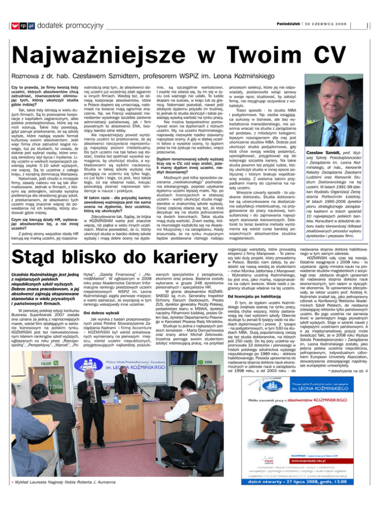 ◊ rp .pl dodatek promocyjny Poniedziałek | 30 czerwca 2008 I Najwa˝niejsze w Twoim CV Rozmowa z dr. hab. Czes∏awem Szmidtem, profesorem WSPiZ im. Leona Koêmiƒskiego Czy to prawda, ˝e firmy tworzà listy uczelni, których absolwentów chcà zatrudniaç, równoczeÊnie eliminujàc tych, którzy ukoƒczyli studia gdzie indziej? Tak, takie listy istniejà w wielu du˝ych firmach. Sà to przewa˝nie korporacje z kapita∏em zagranicznym, albo polskie przedsi´biorstwa, które si´ na nich wzorujà. Takie listy powstajà, gdy˝ panuje przekonanie, ˝e sà szko∏y wy˝sze, które nadajà wysoki format kulturowy swoim absolwentom. JeÊli wi´c firma chce zatrudniç kogoÊ nowego, tu˝ po studiach, to uwa˝a, ˝e dobrze jest wybraç osoby, które wnoszà okreÊlony styl bycia i myÊlenia. Listy uczelni w wielkich korporacjach zawierajà zwykle 5-10 szkó∏ wy˝szych, nie wi´cej. Sà to uczelnie z ca∏ego kraju, z wyraênà dominacjà Warszawy. Natomiast, jeÊli chodzi o mniejsze firmy, zasady naboru nie sà tak sformalizowane. Jednak w firmach, z którymi si´ zetknà∏em, istnia∏a wyraêna preferencja dla okreÊlonej grupy szkó∏, z przekonaniem, ˝e absolwenci tych uczelni majà znacznie wi´cej do powiedzenia ni˝ ich koledzy, którzy studiowali gdzie indziej. Czym si´ kierujà dzia∏y HR, wybierajàc absolwentów tej, a nie innej uczelni? Z jednej strony wszystkie dzia∏y HR kierujà si´ markà uczelni, jej rozpozna- walnoÊcià oraz tym, ˝e absolwenci danej uczelni ju˝ wczeÊniej zdali egzamin w innych firmach. Wiedzà te˝, ˝e istniejà korporacje absolwentów, które w Polsce dopiero si´ umacniajà, natomiast na Êwiecie majà ogromne znaczenie. Np. we Francji wi´kszoÊç mened˝erów wysokiego szczebla zarówno administracji paƒstwowej, jak i firm prywatnych to absolwenci ENA, tworzàcy bardzo silne lobby. Ale najwa˝niejszy powód wyró˝nienia uczelni to przekonanie, ˝e jej absolwenci rzeczywiÊcie reprezentujà najwy˝szy poziom intelektualny. Do tych uczelni nie tak ∏atwo si´ dostaç, trzeba te˝ spe∏niaç wysokie wymagania, by ukoƒczyç studia, a wyk∏adowcami sà wybitni naukowcy. Studia w takiej szkole wy˝szej nie polegajà na uczeniu si´ tylko tego, co ju˝ by∏o i tego, co jest, lecz tak˝e tego, co si´ w∏aÊnie rodzi, kreuje; pozwalajà poznaç najnowsze tendencje w nauce i praktyce. W takim razie - dla przysz∏ej kariery zawodowej wa˝niejsza jest nie sama ocena na dyplomie, lecz uczelnia, którà si´ ukoƒczy∏o? Zdecydowanie tak. Sàdz´, ˝e trójka w KOèMI¡SKIM warta jest znacznie wi´cej, ni˝ piàtka w wielu innych uczelniach. Mo˝na powiedzieç, ˝e ci, którzy ukoƒczyli studia w bardzo dobrej szkole wy˝szej i majà dobre oceny na dyplo- mie, sà szczególnie wartoÊciowi. I zwykle nie zdarza si´, by im si´ w ˝yciu coÊ wa˝nego nie uda∏o. To ludzie skazani na sukces, w kraju lub za granicà. Natomiast pozostali, nawet jeÊli zdobycie dyplomu przysz∏o im trudniej, to jednak te studia skoƒczyli i tak˝e posiadajà wysokà wartoÊç na rynku pracy. Nie mo˝na bezpoÊrednio porównywaç ocen na dyplomach z ró˝nych uczelni. My, na uczelni Koêmiƒskiego, naprawd´ niezwykle rzadko stawiamy najwy˝sze oceny. A gdy w s∏abej uczelni ∏atwo o wysokie oceny, to dyplom przez to nie zyskuje na wartoÊci, wr´cz przeciwnie. Dyplom renomowanej szko∏y wy˝szej liczy si´ w CV, có˝ wi´c zrobiç, je˝eli mamy dyplom innej uczelni, niezbyt docenianej? Mo˝liwych jest kilka sposobów zacierania „niedoskona∏ego” pochodzenia edukacyjnego, poprzez uzyskanie dyplomu uczelni lepszej marki. Np. po studiach licencjackich w s∏abszej uczelni - warto ukoƒczyç studia magisterskie w znakomitej szkole wy˝szej. Coraz cz´Êciej zdarza si´ te˝, ˝e ktoÊ decyduje si´ na studia jednoczeÊnie na dwóch kierunkach. Takie studia majà du˝à wartoÊç. Znam osob´, która równolegle kszta∏ci∏a si´ na Akademii Muzycznej i na zarzàdzaniu. Kiedy zrozumia∏a, ˝e na rynku muzycznym b´dzie poddawana ró˝nego rodzaju Stàd blisko do kariery Uczelnia Koêmiƒskiego jest jednà z najstarszych polskich niepublicznych szkó∏ wy˝szych. Dobrze znana pracodawcom, a jej absolwenci zajmujà eksponowane stanowiska w wielu prywatnych i paƒstwowych firmach. W pierwszej polskiej edycji konkursu Business Superbrands 2007 zosta∏a ona uznana za jednà z najmocniejszych marek, wÊród firm dzia∏ajàcych w sektorze biznesowym na polskim rynku. KOèMI¡SKI jest te˝ niekwestionowanym liderem rankingów szkó∏ wy˝szych, og∏aszanych co roku przez „Rzeczpospolità”, „Perspektywy”, „Wprost”, „Po- lityk´”, „Gazet´ Finansowà” i „Home&Market”. W og∏oszonym w 2008 roku przez Akademickie Centrum Informacyjne rankingu presti˝owych uczelni niepaƒstwowych WSPiZ im. Leona Koêmiƒskiego zaj´∏a pierwsze miejsce; a warto zaznaczyç, ˝e zwyci´zc´ w tym rankingu wskazywa∏y inne uczelnie. Oni dobrze wybrali Jak wynika z badaƒ przeprowadzonych przez Polskie Stowarzyszenie Zarzàdzania Kadrami i firm´ Accenture – KOèMI¡SKI by∏ wÊród ankietowanych wymieniany na pierwszym miejscu, wÊród uczelni niepublicznych, przygotowujàcych najbardziej poszuki- > Wyk∏ad Laureata Nagrody Nobla Roberta J. Aumanna wanych specjalistów z zarzàdzania, ekonomii oraz prawa. Badania zosta∏y wykonane w grupie 348 dyrektorów personalnych i specjalistów HR. W gronie absolwentów KOèMI¡SKIEGO sà m.in. Generalny Inspektor Ochrony Danych Osobowych, Prezes ZUS, dyrektor generalny Poczty Polskiej, podsekretarz stanu w MSWiA, dyrektor naczelny Filharmonii ¸ódzkiej, prezes Orlen Gaz, dyrektor Departamentu Prawnego w Kancelarii Prezesa Rady Ministrów. Studiuje tu jedna z najlepszych polskich tenisistek – Marta Domachowska oraz znany aktor Micha∏ ˚ebrowski. Uczelnia pomaga swoim studentom zdobyç interesujàcà prac´, na przyk∏ad procesom selekcji, które jej nie odpowiada∏y, postanowi∏a wziàç sprawy w swoj