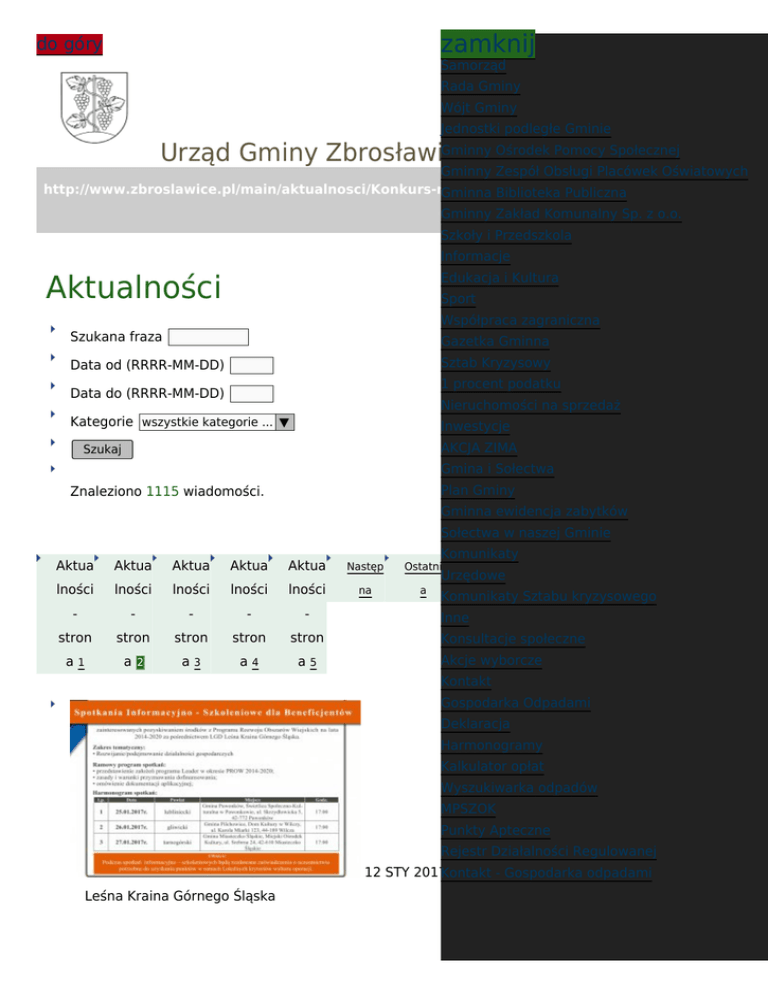 zamknij do góry Samorząd Rada Gminy Wójt Gminy Jednostki podległe Gminie Gminny Ośrodek Pomocy Społecznej Urząd Gminy Zbrosławice Gminny Zespół Obsługi Placówek Oświatowych http://www.zbroslawice.pl/main/aktualnosci/Konkurs-na-stanowisko-dyrektora-Szkoly-Podst Gminna Biblioteka Publiczna awow/printpdf/st:2 Gminny Zakład Komunalny Sp. z o.o. Szkoły i Przedszkola Informacje Aktualności Edukacja i Kultura Sport Współpraca zagraniczna Szukana fraza Gazetka Gminna Data od (RRRR-MM-DD) Sztab Kryzysowy 1 procent podatku Data do (RRRR-MM-DD) Nieruchomości na sprzedaż Kategorie wszystkie kategorie ... ▼ Inwestycje AKCJA ZIMA Szukaj Gmina i Sołectwa Plan Gminy Znaleziono 1115 wiadomości. Gminna ewidencja zabytków Sołectwa w naszej Gminie Komunikaty Aktua Aktua Aktua Aktua Aktua Następ Ostatni lności lności lności lności lności na a - - - - - stron stron stron stron stron a3 a4 a5 a1 a 2 Urzędowe Komunikaty Sztabu kryzysowego Inne Konsultacje społeczne Akcje wyborcze Kontakt Gospodarka Odpadami Deklaracja Harmonogramy Kalkulator opłat Wyszukiwarka odpadów MPSZOK Punkty Apteczne Rejestr Działalności Regulowanej 12 STY 2017Kontakt - Gospodarka odpadami Leśna Kraina Górnego Śląska kategoria: Aktualności Informacja o spotkaniach informacyjno - szkoleniowych dla beneficjentów 12 STY 2017 kategoria: Finał WOŚP Aktualności W niedzielę w Wieszowie odbędzię się 25 finał Wielkiej Orkiestry Świątecznej Pomocy 11 STY 2017 Informacja o wykazach nieruchomości do sprzedaży oraz na wynajem kategoria: Aktualności Informacja o wykazach nieruchomości do sprzedaży (Księży Las) oraz lokali do oddania w najem 11 STY 2017 kategoria: Zebranie Wiejskie w Czekanowie Aktualności 18 stycznia br. w Czekanowie odbędzie się Zebranie Wiejskie, którego głównym celem będzie wybór nowego Sołysa 04 STY 2017 Bezpłatne porady prawne kategoria: Aktualności Od pierwszego stycznia w Gminie Zbrosławice działa punkt nieodpłatnej pomocy prawnej. Mieści się w Gminnym Ośrodku Pomocy Społecznej ul. Tarnogórska 4a w Kamieńcu. 30 GRU 2016 Informacja o wspieraniu kobiet w ciąży i rodzin kategoria: Aktualności Z dniem 1 stycznia 2017 r. Gmina Zbrosławice przystępuje do realizacji zadania wynikającego z ustawy z dnia 4 listopada 2016 r. o wspieraniu kobiet w ciąży i rodzin „Za życiem”. 29 GRU 2016 Informacja o wydaniu decyzji środowiskowych kategoria: Aktualności WÓJT GMINY ZBROSŁAWICE INFORMUJE O PRZYSTĄPIENIU DO PRZEPROWADZENIA OCENY ODDZIAŁYWANIA NA ŚRODOWISKO 23 GRU 2016 Otwarty Konkurs Ofert w zakresie wspierania i upowszechniania kultury fizycznej kategoria: Aktualności Ogłoszenie 21 GRU 2016 OGŁOSZENIE Starosty Powiatowego kategoria: Aktualności Informujemy o rozpoczęciu prac geodezyjnych w związku z wszczęciem postępowania w sprawie modernizacji ewidencji gruntów i budynków w obrębach ewidencyjnych Czekanów, Przezchlebie, Szałsza, Świętoszowice i Ziemięcice 20 GRU 2016 Funkcjonowanie komunikacji autobusowej w okresie Świąt Bożego Narodzenia kategoria: Aktualności Zmiany w funkcjonowaniu komunikacji autobusowej w okresie Świąt Bożego Narodzenia i Nowego Roku Aktua Aktua Aktua Aktua Aktua Następ Ostatni lności lności lności lności lności na a - - - - - stron stron stron stron stron a3 a4 a5 a1 a 2