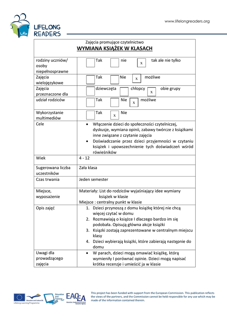 www.lifelongreaders.org Zajęcia promujące czytelnictwo WYMIANA KSIĄŻEK W KLASACH rodziny uczniów/ osoby niepełnosprawne Zajęcia wielojęzykowe Zajęcia przeznaczone dla udział rodziców Tak nie Tak Nie Wykorzystanie multimediów Cele Tak dziewczęta Tak   x możliwe chłopcy Nie x tak ale nie tylko x x x obie grupy możliwe Nie Włączenie dzieci do społeczności czytelniczej, dyskusje, wymiana opinii, zabawy twórcze z książkami inne związane z czytanie zajęcia Doświadczanie przez dzieci przyjemności w czytaniu książek i upowszechnienie tych doświadczeń wśród rówieśników Wiek 4 - 12 Sugerowana liczba uczestników Czas trwania Zała klasa Miejsce, wyposażenie Materiały: List do rodziców wyjaśniający idee wymiany książek w klasie Miejsce : centralny punkt w klasie 1. Dzieci przynoszą z domu książkę której nie chcą więcej czytać w domu 2. Rozmawiają o książce I dlaczego bardzo im się podobała. Opisują główna akcje książki 3. Ksiązki zostają zaprezentowane w centralnym miejscu klasy 4. Dzieci wybierają książki, które zabierają następnie do domu  W parach, dzieci mogą omawiać książkę, którą wymieniły I porównać opinie. Dzieci mogą napisać krótka recenzje i umieścić ja w klasie Opis zajęć Uwagi dla prowadzącego zajęcia Jeden semester This project has been funded with support from the European Commission. This publication reflects the views of the partners, and the Commission cannot be held responsible for any use which may be made of the information contained therein.