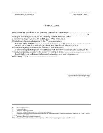 …………………………….. ………………………… ( oznaczenie przedsiębiorcy) (miejscowość i data) OŚWIADCZENIE poświadczające spełnienie przez kierowcę osobiście wykonującego…………………………... ………………………………………………………………………………………………*) wymagań określonych w art.39a ust.1 ustawy z dnia 6 września 2001r. o transporcie drogowym (Dz. U. nr.125, poz.1371,z późn. zm.) Oświadczam, że mam ukończone 21 lat **) oraz posiadam: a) prawo jazdy kategorii:………………………………….nr……………………..………... b) orzeczenie lekarskie stwierdzające brak przeciwwskazań zdrowotnych do wykonywania pracy na stanowisku kierowcy, ważne do dnia :……………………………........ c) orzeczenie psychologiczne stwierdzające brak przeciwwskazań psychologicznych do wykonywania pracy na stanowisku kierowcy, ważne do dnia:………………….……………… d) zaświadczenie o ukończeniu kursu dokształcającego w zakresie przewozu osób/rzeczy***) nr :…….............................................. ……………………………… ( czytelny podpis przedsiębiorcy) *) Wpisać odpowiednio: transport drogowy, przewozy na potrzeby własne **) Skreślić w przypadku przedsiębiorcy osobiście wykonującego: transport drogowy rzeczy pojazdem samochodowym lub zespołem pojazdów o dopuszczalnej masie całkowitej od 3,5t do 7,5t i nie mającego ukończonych 21 lat przewozy na potrzeby własne( nie dotyczy) ***) Niepotrzebne skreślić; nie dotyczy przedsiębiorcy osobiście wykonującego przewozy na potrzeby własne