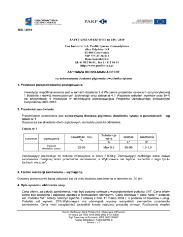 18S / 2010 ZAPYTANIE OFERTOWE nr 18S / 2010 Vox Industrie S.A. Profile Spółka Komandytowa ulica Gdyńska 143 62-004 Czerwonak NIP 777-27-76-017 Dane kontaktowe: tel. 61 812 06 61, fax 61 812 06 61 http://www.profile.vox.pl ZAPRASZA DO SKŁADANIA OFERT na sukcesywna dostawa pigmentu dwutlenku tytanu 1. Podstawa przeprowadzenia postępowania. Inwestycja współfinansowana jest w ramach działania 1.4 Wsparcie projektów celowych osi priorytetowej 1 Badania i rozwój nowoczesnych technologii oraz działania 4.1 Wsparcie wdrożeń wyników prac B+R osi priorytetowej 4 Inwestycje w innowacyjne przedsięwzięcia Programu Operacyjnego Innowacyjna Gospodarka 2007-2013. 2. Przedmiot zamówienia. Przedmiotem zamówienia jest sukcesywna dostawa pigmentu dwutlenku tytanu o parametrach tabeli nr 1 Dopuszcza się składania ofert częściowych, na każdy produkt oddzielnie. wg Tabela nr 1 surowce wymagania Pigment dwutlenku tytanu Zawartość TiO2 % Substancje lotne % Białość zażółcenie L* b* 92-93 Max 0,5 98-99 1,5-1,6 Zamawiający przewiduje że dokona zamówienia w ilości 5 000kg. Zamawiający zastrzega sobie prawo zamówienia mniejszej ilości przedmiotu zamówienia, a Wykonawca nie będzie dochodził z tego tytułu żadnych roszczeń. 3. Termin realizacji zamówienia – wymagany. Dostawy jednorazowe będą odbywać się od dnia złożenia zamówienia w terminie do 30 dni 4. Opis sposobu obliczenia ceny. Cena oferty, za całość zamówienia, musi być podana cyfrowo z wyodrębnieniem podatku VAT. Cena oferty winna być obliczona i zapisana zgodnie z formularzem ofertowym. Cena ofertowa = cena netto + podatek vat. Podatek VAT należy naliczyć zgodnie z ustawą z dnia 11 marca 2004 r. o podatku od towarów i usług. Podatek vat wynosi: 22%.Wykonawca ma obowiązek wyceny wszystkich elementów przedmiotu zamówienia. Cena musi uwzględniać wszystkie koszty realizacji przyszłej umowy. Rozliczenia między Konto: Raiffeisen Bank Polska S.A. Warszawa O/Poznań Nr konta: 22 1750 1019 0000 0000 0704 5239 Sąd Rejonowy w Poznaniu, KRS 0000210637 Kapitał zakładowy: 1.050.000,00 zł Strona 1 z 3 18S / 2010 Zamawiającym a Wykonawcą prowadzone będą w walucie polskiej (złoty polski), UE Euro lub USD. W przypadku Wykonawców, którzy przedstawią wartości robót w innej walucie niż PLN, Zamawiający przeliczy ich wartość wg kursu średniego z kursowej tabeli NBP datowanej z ostatniego dnia roboczego poprzedzającego dzień otwarcia ofert. 5. Termin związania ofertą. Wykonawcy pozostają związani ofertą przez okres 13 miesięcy od ostatecznego upływu terminu do składania ofert na warunkach zawartych w pkt. 9. Bieg terminu związania ofertą rozpoczyna się wraz z upływem terminu składania ofert. 6. Termin i miejsce składania ofert. Oferty należy składać do dnia 13.05.2010 do godziny 10.00 w siedzibie Zamawiającego Vox Industrie S.A. Profile Spółka Komandytowa, ul. Gdyńska 143, 62-004 Czerwonak, w sekretariacie. 7. Termin i miejsce otwarcia ofert. Przegląd złożonych ofert nastąpi w dniu 14.05.2010 r. o godzinie 12.00 w siedzibie Zamawiającego Vox Industrie S.A. Profile Spółka Komandytowa, ul. Gdyńska 143, 62-004 Czerwonak, w sali konferencyjnej. 8. Opis kryteriów, którymi zamawiający będzie się kierował przy wyborze oferty, wraz z podaniem znaczenia tych kryteriów i sposobu oceny ofert. Zamawiający wybiera ofertę z najniższą ceną. Najniższa cena – 100% Najniższa cena = cena najniższa spośród badanych ofert x 100/ cena badanej oferty Oferty nie spełniające parametrów zawartych w tabeli nr 1 nie będą rozpatrywane. 9. Warunki zmian cen jednostkowych 9.1. Zamawiający dopuszcza przy dokonywaniu zamówień jednorazowych, zmianę cenny jednostkowej przedmiotu zamówienia w trakcje realizacji zamówienia w przypadku zmian cen surowców, zmian kursu waluty w jakiej dokonywany jest zakup (EURO; USD) lub innych istotnych czynników mających wpływ na cenę przedmiotu zamówienia. 9.2. Każdorazowa zmiana ceny (podwyżka) wymaga zgody Zamawiającego w postaci zamówienia. Ustalenie nowych cen następować będzie każdorazowo w drodze negocjacji pomiędzy stronami, z uwzględnieniem różnicy między cenami surowców i kursów walut w dniu negocjacji, a cenami surowców i kursów w dniu złożenia ofert. Różnica ta będzie obliczana w oparciu o aktualne powszechnie dostępne cenniki. 9.3. Każdorazowa zmiana ceny będzie uzgadniana w drodze negocjacji 10. Informacje o sposobie porozumiewania się Zamawiającego z Wykonawcami oraz przekazywania oświadczeń lub dokumentów, a także wskazanie osób uprawnionych do porozumiewania się z Wykonawcami: Oświadczenia, dokumenty, wnioski, zawiadomienia oraz informacje Zamawiający oraz Wykonawcy przekazują: a) pisemnie na adres: Vox Industrie S.A. Profile Spółka Komandytowa, ul. Gdyńska 143, 62-004 Czerwonak, lub b) faxem na nr (+48) 61 892 83 13, lub c) drogą elektroniczną na adres e-mail: [email protected] Konto: Raiffeisen Bank Polska S.A. Warszawa O/Poznań Nr konta: 22 1750 1019 0000 0000 0704 5239 Sąd Rejonowy w Poznaniu, KRS 0000210637 Kapitał zakładowy: 1.050.000,00 zł Strona 2 z 3 18S / 2010 Osobą ze strony Zamawiającego uprawnioną do porozumiewania się z Wykonawcami jest Pani Patrycja Rozynek w godzinach od 9:00 – 15:00 od poniedziałku do piątku Podpis Zamawiającego......................... Konto: Raiffeisen Bank Polska S.A. Warszawa O/Poznań Nr konta: 22 1750 1019 0000 0000 0704 5239 Sąd Rejonowy w Poznaniu, KRS 0000210637 Kapitał zakładowy: 1.050.000,00 zł Strona 3 z 3