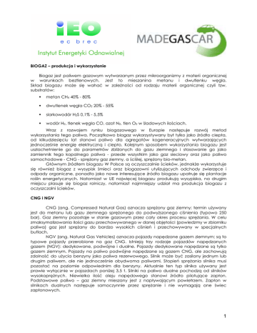 BIOGAZ – produkcja i wykorzystanie Biogaz jest paliwem gazowym wytwarzanym przez mikroorganizmy z materii organicznej w warunkach beztlenowych. Jest to mieszanina metanu i dwutlenku węgla. Skład biogazu moŜe się wahać w zaleŜności od rodzaju materii organicznej czyli tzw. substratów: metan CH4 40% - 80% dwutlenek węgla CO2 20% - 55% siarkowodór H2S 0,1% - 5,5% wodór H2, tlenek węgla CO, azot N2, tlen O2 w śladowych ilościach. Wraz z rozwojem rynku biogazowego w Europie następuje rozwój metod wykorzystania tego paliwa. Początkowo biogaz wykorzystywany był tylko jako źródło ciepła, od kilkudziesięciu lat stanowi paliwo dla agregatów kogeneracyjnych wytwarzających jednocześnie energię elektryczną i ciepło. Kolejnym sposobem wykorzystania biogazu jest uszlachetnienie go do parametrów zbliŜonych do gazu ziemnego i stosowanie go jako zamiennik tego kopalnego paliwa - przede wszystkim jako gaz sieciowy oraz jako paliwo samochodowe - CNG - spręŜony gaz ziemny, a ściślej, spręŜony bio-metan. Głównym źródłem biogazu W Polsce są oczyszczalnie ścieków, jednakŜe wykorzystuje się równieŜ biogaz z wysypisk śmieci oraz biogazowni utylizujących odchody zwierzęce i odpady organiczne, ponadto jako nowe interesujące źródło biogazu upatruje się plantacje roślin energetycznych. Natomiast w UE najwięcej biogazu produkują wysypiska, na drugim miejscu plasuje się biogaz rolniczy, natomiast najmniejszy udział ma produkcja biogazu z oczyszczalni ścieków. CNG i NGV CNG (ang. Compressed Natural Gas) oznacza spręŜony gaz ziemny; termin uŜywany jest do metanu lub gazu ziemnego spręŜonego do podwyŜszonego ciśnienia (typowo 250 bar). Gaz ziemny pozostaje w stanie gazowym przez cały okres procesu spręŜania. W celu zmaksymalizowania ilości gazu przechowywanego w danej objętości (powiedzmy w zbiorniku paliwa) gaz jest spręŜany do bardzo wysokich ciśnień i przechowywany w specjalnych butlach. NGV (ang. Natural Gas Vehicles) oznacza pojazdy napędzane gazem ziemnym; są to typowe pojazdy przerobione na gaz CNG. Istnieją trzy rodzaje pojazdów napędzanych gazem (NGV): dedykowane, podwójne i dualne. Pojazdy dedykowane napędzane są tylko gazem ziemnym. Pojazdy na paliwo podwójne napędzane są gazem CNG, ale zachowują zdolność do uŜycia benzyny jako paliwa rezerwowego. Silnik moŜe być zasilany jednym lub drugim paliwem, ale nie jednocześnie obydwoma paliwami. Stopień spręŜania silnika musi pozostać na poziomie odpowiednim dla benzyny. Aktualnie ten typ silnika uŜywany jest prawie wyłącznie w pojazdach poniŜej 3,5 t. Silniki na paliwo dualne pochodzą od silników wysokopręŜnych. Niewielka ilość oleju napędowego stanowi źródło pilotujące zapłon. Podstawowe paliwo – gaz ziemny mieszany jest z napływającym powietrzem. Zapłon w silnikach dualnych następuje samoczynnie przez spręŜanie i nie wymagają one świec zapłonowych. 1 Stacje tankowania CNG Stacje tankowania CNG, to termin zbiorczy dla kompletnej instalacji wymaganej do tankowania pojazdu spręŜonym gazem ziemnym. Stacja zawiera zasadniczo zasilanie gazu, spręŜarkę gazu, butle, panel priorytetowy i dystrybutor. Stacje CNG mają róŜne kształty i wymiary, ale wszystkie zawierają podane podstawowe elementy. Stacje tankowania dzieli się na dwie główne grupy: napełniania czasowego (lub powolnego) i napełniania szybkiego. Stacje napełniania czasowego wykorzystują spręŜarkę do bezpośredniego tankowania pojazdu w określonym okresie czasu, zazwyczaj, gdy pojazd parkuje na noc. Dlatego stacje tego rodzaju nie wymagają drogich dystrybutorów elektronicznych, ale mają ograniczenia, gdyŜ nie nadają się do publicznego tankowania lub na podjeździe. Ten typ stacji nadaje się do duŜych zajezdni autobusów, gdzie wszystkie pojazdy wracają na noc. Tankowanie szybkie jest bardziej powszechne dla lekkich pojazdów, jak samochody osobowe i taksówki i nadaje się do podjazdów benzynowych. W tych stacjach gaz dozowany jest ze zbiorników statycznych pod wysokim ciśnieniem (250 bar). SpręŜarki utrzymują zawsze maksymalne ciśnienie przez okresowe wyłączanie i załączanie w zaleŜności od potrzeb, gdy pojazdy pobierają gaz. Takie rozwiązanie nadaje się idealnie do stacji publicznych lub, gdy wymagane jest szybkie napełnienie, a pojazd musi pojechać w inne miejsce oddalone od stacji tankowania gazu. Stacje szybkiego napełniania nadają się do samochodów, taksówek, samochodów dostawczych, śmieciarek i samochodów cięŜarowych powyŜej 3,5 t., lecz mogą tutaj tankować wszystkie pojazdy. 2 Projekt MADEGASCAR MADEGASCAR (Market development for gas driven cars) jest projektem finansowanym przez Unię Europejską. Realizowany jest w terminie od września 2007 do stycznia 2010 roku przy udziale 17 partnerów europejskich w tym Polski. Celem projektu jest polepszenie rynku samochodów napędzanych gazem ziemnym oraz biometanolem. Realizacja projektu przyczyni się do zwiększenia udziału samochodów efektywnych energetycznie oraz zasilanych paliwami alternatywnymi. Projekt ma na celu zdiagnozowanie istniejących barier rozwoju i przezwycięŜenie ich m.in. poprzez zwiększenie akceptacji społeczeństwa. MoŜliwe będzie to dzięki edukacji właścicieli flot samochodowych, dealerów samochodów, motywowania klientów do zakupu aut CNG oraz zwiększaniu wiedzy społeczeństwa na temat samochodów CNG. Z drugiej strony podjęte zostaną działania mające na celu zwiększenie ilości stacji zasilania gazem, poprawę uwarunkowań rynkowych i włączenie biogazu w cykl paliw. Potencjalnymi partnerami projektu mogą być: floty samochodowe i autobusowe, prywatni właściciele samochodów, dostawcy paliw, dealerzy samochodów, producenci i osoby decyzyjne. Strona WWW projektu: www.madegascar.eu/ Partnerzy ze strony Polski: Instytut Energetyki Odnawialnej (EC BREC IEO), http://www.ieo.pl/, telefon: 022 8254652, 022 8758678 Anna Oniszk-Popław