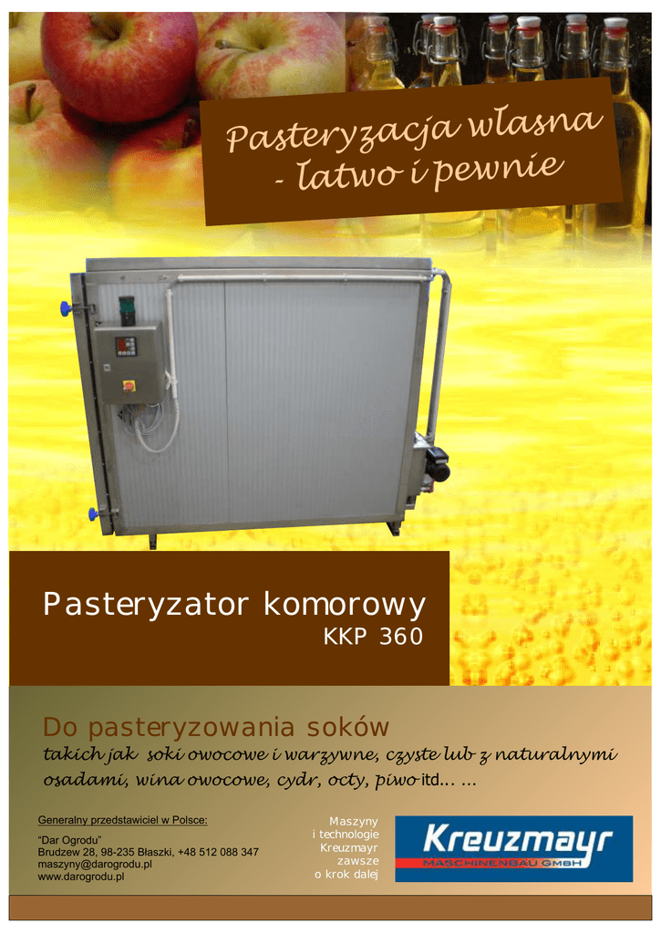 a n s a l w ja c a z y r Paste e i n w e p i o w t a -l Pasteryzator komorowy KKP 360 Do pasteryzowania soków takich jak soki owocowe i warzywne, czyste lub z naturalnymi osadami, wina owocowe, cydr, octy, piwo itd... ... Generalny przedstawiciel w Polsce: “Dar Ogrodu” Brudzew 28, 98-235 Błaszki, +48 512 088 347 [email protected] www.darogrodu.pl Maszyny i technologie Kreuzmayr zawsze o krok dalej Pasteryzator komorowy KKP 360 Wersja profesjonalna. Kompletne urządzenie gotowe do eksploatacji Wykonanie ze stali szlachetnej z izolowaną obudową Elektroniczna regulacja temperatury i czasu Łatwa obsługa. Zamknięte napełnione butelki ustawić na wózku do butelek, wózek wsunąć do pasteryzatora, zamknąć drzwi i nacisnąć przycisk Start Automatyczne wyłączenie po zakończeniu procesu Z łatwością można nastawić lub przestawić żądaną temperaturę pasteryzacji, czas grzania i czas chłodzenia Zalety. Możliwe pasteryzowanie przeróżnych produktów np.: soków owocowych, win owocowych, marmolad, napojów gazowanych, warzyw poddanych fermentacji mlekowej, sosu chutney, konserw owocowych i warzywnych. Łatwa obsługa dzięki ergonomicznej budowie. Wydajność nominalna /h: .............................. 360 butelek 1-litrowych Moc grzewcza: .. podłączenie do ogrzewania inwestora (min. 36 kW) Przyłącze elektryczne: ...................................... 400 V / 16 A / 1,5 kW Ilość napełniania: .......................................... 360 butelek 1-litrowych Wymiary szer. x wys. x głęb.: .......................1200 x 1800 x 2500 mm Waga: ................................................................................... ~ 650 kg w ów ść, jako oka ne wys chnicz nie, te cowa a, g ra dop a obsłu , łatw igiena eby h otrz p yjne małe erwac s kon ob Inne urzadzenia do produkcji soku: tencja oc pe w m Zastrzegamy sobie prawo dokonywania zmian! Ko g hh Dane techniczne: róbce o - Wersja dla przyłącza grzewczego inwestora - PAS 250-2000 Pasteryzator przepływowy, wersja dla początkujących 400 - KZE 1500 / 3000 urządzenie grzewcze krótkotrwale z systemem ochładzania i podgrzewania soku - Urządzenia ruchome, konstrukcje specjalne - Urządzenia do rozlewania w systemie Bag-in-Box A-4702 Wallern / Tr. Schallerbacher Straße 77 (+43) 07249 / 48817 [email protected] www.kreuzmayr.com Generalny przedstawiciel w Polsce: “Dar Ogrodu” Brudzew 28, 98-235 Błaszki +48 512 088 347 [email protected] www.darogrodu.pl Maszyny i technologie Kreuzmayr ZAWSZE O KROK DALEJ