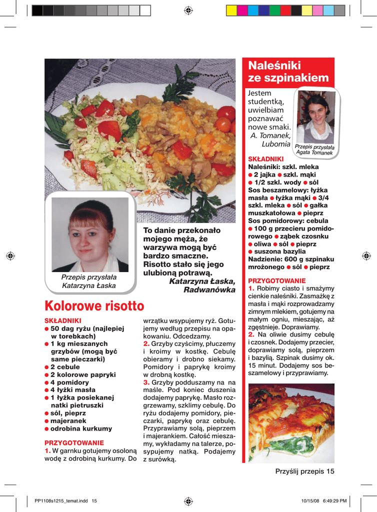 Naleśniki ze szpinakiem Jestem studentką, uwielbiam poznawać nowe smaki. A. Tomanek, Lubomia Przepis przysłała Katarzyna Łaska To danie przekonało mojego męża, że warzywa mogą być bardzo smaczne. Risotto stało się jego ulubioną potrawą. Katarzyna Łaska, Radwanówka Kolorowe risotto wrzątku wsypujemy ryż. Gotujemy według przepisu na opakowaniu. Odcedzamy. 2. Grzyby czyścimy, płuczemy i kroimy w kostkę. Cebulę obieramy i drobno siekamy. Pomidory i paprykę kroimy w drobną kostkę. 3. Grzyby podduszamy na na maśle. Pod koniec duszenia dodajemy paprykę. Masło rozgrzewamy, szklimy cebulę. Do ryżu dodajemy pomidory, pieczarki, paprykę oraz cebulę. Przyprawiamy solą, pieprzem i majerankiem. Całość mieszaPRZYGOTOWANIE my, wykładamy na talerze, po1. W garnku gotujemy osoloną sypujemy natką. Podajemy wodę z odrobiną kurkumy. Do z surówką. SKŁADNIKI ● 50 dag ryżu (najlepiej w torebkach) ● 1 kg mieszanych grzybów (mogą być same pieczarki) ● 2 cebule ● 2 kolorowe papryki ● 4 pomidory ● 4 łyżki masła ● 1 łyżka posiekanej natki pietruszki ● sól, pieprz ● majeranek ● odrobina kurkumy Przepis przysłała Agata Tomanek SKŁADNIKI Naleśniki: szkl. mleka ● 2 jajka ● szkl. mąki ● 1/2 szkl. wody ● sól Sos beszamelowy: łyżka masła ● łyżka mąki ● 3/4 szkl. mleka ● sól ● gałka muszkatołowa ● pieprz Sos pomidorowy: cebula ● 100 g przecieru pomidorowego ● ząbek czosnku ● oliwa ● sól ● pieprz ● suszona bazylia Nadzienie: 600 g szpinaku mrożonego ● sól ● pieprz PRZYGOTOWANIE 1. Robimy ciasto i smażymy cienkie naleśniki. Zasmażkę z masła i mąki rozprowadzamy zimnym mlekiem, gotujemy na małym ogniu, mieszając, aż zgęstnieje. Doprawiamy. 2. Na oliwie dusimy cebulę i czosnek. Dodajemy przecier, doprawiamy solą, pieprzem i bazylią. Szpinak dusimy ok. 15 minut. Dodajemy sos beszamelowy i przyprawiamy. Przyślij przepis 15 PP1108s1215_temat.indd 15 10/15/08 6:49:29 PM