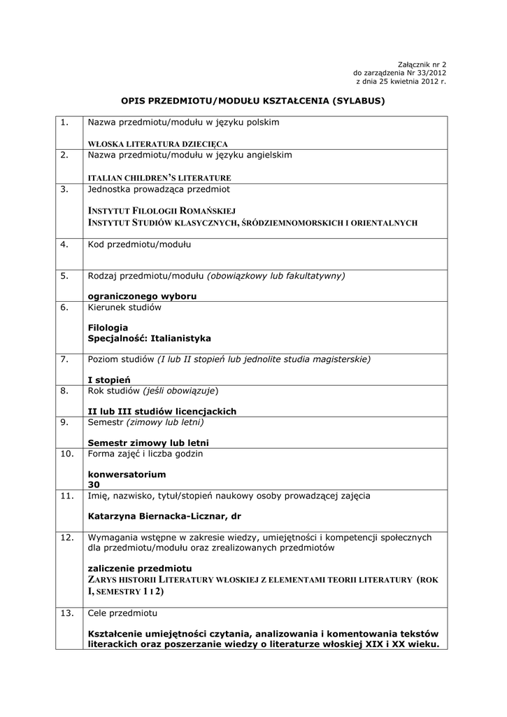 Załącznik nr 2 do zarządzenia Nr 33/2012 z dnia 25 kwietnia 2012 r. OPIS PRZEDMIOTU/MODUŁU KSZTAŁCENIA (SYLABUS) 1. Nazwa przedmiotu/modułu w języku polskim WŁOSKA LITERATURA DZIECIĘCA 2. Nazwa przedmiotu/modułu w języku angielskim ITALIAN CHILDREN’S LITERATURE 3. Jednostka prowadząca przedmiot INSTYTUT FILOLOGII ROMAŃSKIEJ INSTYTUT STUDIÓW KLASYCZNYCH, ŚRÓDZIEMNOMORSKICH I ORIENTALNYCH 4. Kod przedmiotu/modułu 5. Rodzaj przedmiotu/modułu (obowiązkowy lub fakultatywny) 6. ograniczonego wyboru Kierunek studiów Filologia Specjalność: Italianistyka 7. Poziom studiów (I lub II stopień lub jednolite studia magisterskie) 8. I stopień Rok studiów (jeśli obowiązuje) 9. II lub III studiów licencjackich Semestr (zimowy lub letni) 10. Semestr zimowy lub letni Forma zajęć i liczba godzin 11. konwersatorium 30 Imię, nazwisko, tytuł/stopień naukowy osoby prowadzącej zajęcia Katarzyna Biernacka-Licznar, dr 12. Wymagania wstępne w zakresie wiedzy, umiejętności i kompetencji społecznych dla przedmiotu/modułu oraz zrealizowanych przedmiotów zaliczenie przedmiotu ZARYS HISTORII LITERATURY WŁOSKIEJ Z ELEMENTAMI TEORII LITERATURY (ROK I, SEMESTRY 1 I 2) 13. Cele przedmiotu Kształcenie umiejętności czytania, analizowania i komentowania tekstów literackich oraz poszerzanie wiedzy o literaturze włoskiej XIX i XX wieku. 14. 15. Zakładane efekty kształcenia Symbole kierunkowych efektów kształcenia, np.: K_W01*, K_U05, K_K03 Student zna podstawową terminologię z zakresu literaturoznawstwa. K_W02 Student ma wiedzę o źródłach informacji (opracowania encyklopedyczne, syntezy podręcznikowe) dotyczących literatury studiowanego języka. K_W03 Student ma wiedzę dotyczącą wybranych zjawisk z historii literatury studiowanego języka. K_W09 Student potrafi, posługując się typowymi metodami, analizować wytwory kultury charakterystyczne dla obszaru kultury studiowanego języka oraz interpretować je, dążąc do określenia ich znaczeń, zakresu oddziaływania społecznego oraz ich miejsca w procesie historycznym i w przemianach kultury. K_U06 Student ma świadomość różnic kulturowych i związanych z tym wyzwań. K_K06 Treści programowe 1) Praca z fragmentami włoskich utworów przeznaczonych dla dzieci (Carlo Collodi, Giannettino, Ida Baccini Le memorie di un pulcino; Bertelli Luigi Ciondolino; Cammarano Bianca Fiori d’autunno e d’inverno; De Amicis Cuore; Del Soldato ) nastawiona na równoległe zdobywanie i zwiększanie kompetencji w zakresie literatury włoskiej, teorii literatury i języka włoskiego : - ćwiczenie rozumienia tekstu pisanego - rozwijanie kompetencji w zakresie języka włoskiego mówionego 2) Porównywanie fragmentów/aspektów oryginału z polskimi przekładami jako punkt wyjścia do refleksji komparatystycznej i przekładoznawczej (recepcja tekstu literackiego, różnice między oryginałem a przekładem, seria przekładowa, problemy kulturowe w przekładzie) 3) Ukazanie utworów wyżej wymienionych pisarzy na tle włoskiej literatury XIX i XX wieku i w powiązaniu z realiami społecznopolitycznymi 16. Zalecana literatura (podręczniki) Krzysztof Żaboklicki, Historia literatury włoskiej, PWN, Warszawa 2008. Historia literatury włoskiej, pod red. Piotra Salwy, t. II, Wydawnictwo Naukowe Semper, Warszawa 1997. I libri per ragazzi che hanno fatto l’Italia, a cura di Hamelin, Hamelin Associazione Culturale, Bologna 2011. Angelo Nobile, Daniele Giancane, Carlo Marini, Letteratura per l’infanzia e l’adolescenza, Editrice La Scuola, Brescia 2011. Pino Boero, Carmine De Luca, La letteratura per l’infanzia, Editori Laterza, Bari 2010. Justyna Łukaszewicz, La letteratura italiana nelle scuole polacche: Pinocchio forever?, Italica Wratislaviensia, nr 4, 2013, s.141-158. Katarzyna Biernacka-Licznar, La nascita della letteratura per l’infanzia nell’Italia unita, Italica Wratislaviensia, nr 3, 2012, s.27-46. Olga Płaszczewska, Przestrzenie komparatystyki – italianizm, Wydawnictwo Uniwersytetu Jagiellońskiego, Kraków 2010. i inne pozycje wybrane przez wykładowcę. 17. Forma zaliczenia poszczególnych komponentów przedmiotu/modułu, sposób sprawdzenia osiągnięcia zamierzonych efektów kształcenia: 18. Zaliczenie na ocenę na podstawie obecności i aktywności na zajęciach, przygotowania do zajęć i wygłoszonych referatów. Język wykładowy 19. włoski i polski Obciążenie pracą studenta Forma aktywności studenta Średnia liczba godzin na zrealizowanie aktywności Godziny zajęć (wg planu studiów) z nauczycielem: 30 Praca własna studenta: - lektura zalecanych tekstów - przygotowanie do zajęć, w tym wykonanie zleconych zadań i przygotowanie referatów Suma godzin Liczba punktów ECTS *objaśnienie symboli: K (przed podkreśleniem) - kierunkowe efekty kształcenia W - kategoria wiedzy U - kategoria umiejętności K (po podkreśleniu) - kategoria kompetencji społecznych 01, 02, 03 i kolejne - numer efektu kształcenia 60 90 3