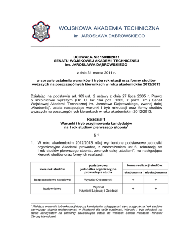 WOJSKOWA AKADEMIA TECHNICZNA im. JAROSŁAWA DĄBROWSKIEGO _______________________________________________________________ UCHWAŁA NR 150/III/2011 SENATU WOJSKOWEJ AKADEMII TECHNICZNEJ im. JAROSŁAWA DĄBROWSKIEGO z dnia 31 marca 2011 r. w sprawie ustalenia warunków i trybu rekrutacji oraz formy studiów wyższych na poszczególnych kierunkach w roku akademickim 2012/2013 Działając na podstawie art. 169 ust. 2 ustawy z dnia 27 lipca 2005 r. Prawo o szkolnictwie wyższym (Dz. U. Nr 164 poz. 1365, z późn. zm.) Senat Wojskowej Akademii Technicznej im. Jarosława Dąbrowskiego, zwanej dalej „Akademią”, ustala następujące warunki i tryb rekrutacji oraz formy studiów wyższych na poszczególnych kierunkach w roku akademickim 2012/2013: Rozdział 1 Warunki i tryb przyjmowania kandydatów na I rok studiów pierwszego stopnia1 §1 1. W roku akademickim 2012/2013 niżej wymienione podstawowe jednostki organizacyjne Akademii prowadzą, z zastrzeżeniem ust. 6, rekrutację na I rok studiów pierwszego stopnia, zwanych dalej „studiami”, na następujące kierunki studiów oraz formy ich realizacji: forma realizacji studiów: podstawowa jednostka organizacyjna prowadząca studia stacjonarna niestacjonarna bezpieczeństwo narodowe Wydział Cybernetyki + + budownictwo Wydział Inżynierii Lądowej i Geodezji + + kierunek studiów Niniejsze warunki i tryb rekrutacji dotyczą kandydatów ubiegających się o przyjęcie na I rok studiów pierwszego stopnia realizowanych w Akademii dla osób cywilnych. Warunki i tryb rekrutacji na studia kandydatów na żołnierzy zawodowych ustala - na wniosek Senatu Akademii - Minister Obrony Narodowej. 1 forma realizacji studiów: podstawowa jednostka organizacyjna prowadząca studia stacjonarna niestacjonarna chemia Wydział Nowych Technologii i Chemii + + elektronika i telekomunikacja Wydział Elektroniki + + energetyka Wydział Elektroniki + + fizyka techniczna* studia międzywydziałowe koordynowane przez Wydział Nowych Technologii i Chemii + kierunek studiów *Rekrutacja na kierunek „fizyka techniczna” prowadzona będzie po I semestrze studiów, spośród wyróżniających się studentów kierunków technicznych, którzy uzyskali najlepsze wyniki w nauce według zasad określonych w „Regulaminie studiów wyższych w WAT”. geodezja i kartografia Wydział Inżynierii Lądowej i Geodezji + + informatyka Wydział Cybernetyki + + inżynieria bezpieczeństwa Wydział Mechatroniki + + inżynieria materiałowa Wydział Nowych Technologii i Chemii + logistyka Wydział Mechaniczny + + lotnictwo i kosmonautyka Wydział Mechatroniki + + mechanika i budowa maszyn Wydział Mechaniczny + + mechatronika Wydział Mechatroniki + + zarządzanie Wydział Cybernetyki + + 2. Na studia może być przyjęta wyłącznie osoba posiadająca świadectwo dojrzałości. 3. Uruchomienie określonego kierunku i formy studiów uwarunkowane jest liczbą kandydatów. Wybór specjalności dokonywany jest w trakcie studiów. Uruchomienie określonej specjalności uwarunkowane jest liczbą chętnych studentów. 4. 2 5. Preferowany kierunek studiów kandydat określa w podaniu-ankiecie o przyjęcie na studia. Kandydat ma prawo określić do trzech kierunków studiów na każdej z form realizacji studiów. W przypadku nieprzyjęcia na pierwszy kierunek studiów stacjonarnych, kandydat jest rozpatrywany kolejno na drugim i trzecim określonym przez siebie kierunku studiów. W przypadku nieprzyjęcia na studia stacjonarne kandydat rozpatrywany jest na studiach niestacjonarnych w sposób analogiczny jak na studiach stacjonarnych. 6. Limit przyjęć na określony kierunek i formę studiów ustala rektor na wniosek kierownika podstawowej jednostki organizacyjnej prowadzącej studia zaopiniowany przez radę tej jednostki. Ustalenie limitu przyjęć na określony kierunek i formę studiów oznacza uruchomienie rekrutacji na ten kierunek i formę studiów. §2 1. Rejestracja kandydatów przeprowadzana jest na szczeblu Akademii (centralnie). 2. Kandydat może zarejestrować się wyłącznie za pośrednictwem Internetu. 3. W czasie rejestracji kandydat: 1) wypełnia podanie-ankietę o przyjęcie na studia, 2) wnosi opłatę rekrutacyjną. 4. Przed zakończeniem terminu rejestracji kandydat zobowiązany jest uaktualnić podanie-ankietę o wyniki, oceny oraz inne osiągnięcia uzyskane w szkole ponadgimnazjalnej, o których mowa w § 3, będące podstawą naliczenia punktów rankingowych. 5. Kandydat przyjęty na studia jest zobowiązany w terminie do 14 dni od daty ogłoszenia wyników rekrutacji (dokładny termin dostarczenia wymaganych dokumentów zawiera decyzja, o której mowa w § 5 ust. 3) dostarczyć: 1) świadectwo dojrzałości (oryginał lub odpis wydany przez szkołę), 2) świadectwo ukończenia szkoły ponadgimnazjalnej (nie dotyczy kandydata, który zdawał „nową maturę” w latach 2007 ÷ 2012), 3) dokumenty potwierdzające osiągnięcia uzyskane w szkole ponadgimnazjalnej uwzględniane w procesie rekrutacji (dyplomy olimpiad), 4) 2 aktualne fotografie (zgodne z wymaganiami stosowanymi przy wydawaniu dowodów osobistych) oraz kolorową fotografię w formie cyfrowej, 5) kserokopię dowodu osobistego lub innego dokumentu potwierdzającego tożsamość kandydata. 6. Kandydat legitymujący się świadectwem dojrzałości uzyskanym poza granicami Polski składa dodatkowo zaświadczenie nostryfikujące potwierdzające równoważność świadectwa uzyskanego za granicą z polskim świadectwem dojrzałości, wydane przez kuratora oświaty właściwego ze 3 względu na miejsce zamieszkania kandydata oraz tłumaczenie świadectwa dojrzałości sporządzone przez tłumacza przysięgłego. 7. Harmonogram postępowania rekrutacyjnej ustala rektor. rekrutacyjnego 8. Opłata rekrutacyjna nie podlega zwrotowi. oraz wysokość opłaty §3 1. Do przeprowadzenia postępowania rekrutacyjnego rektor powołuje uczelnianą komisję rekrutacyjną oraz komisje rekrutacyjne podstawowych jednostek o