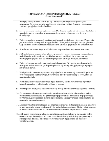 12 PRZYKAZAŃ LOGOPEDYCZNYCH dla rodziców (Leon Kaczmarek) 1. Narządy mowy dziecka kształtują się i zaczynają funkcjonować już w życiu płodowym. Są one ogromnie wrażliwe na wszystkie bodźce fizyczne i chemiczne, zarówno sprzyjające jak i szkodliwe. 2. Mowa otoczenia powinna być poprawna. Do dziecka trzeba mówić wolno, dokładnie i wyraźnie, trzeba zaniechać sztucznego spieszczania i używania tzw. języka dziecięcego. 3. Dziecko powinno reagować na aktywność uczuciową i słowną otoczenia. Z początku jest to uśmiech, ruch rączki, przegięcie ciała. Wnet jednak nastąpią reakcje głosowe. Gdy ich brak, trzeba koniecznie zbadać słuch dziecka, gdyż może on być osłabiony. 4. Absolutnie nie wolno krępować dziecka w reagowaniu na aktywność otoczenia. 5. Jeśli dziecko ma nieprawidłową budowę narządów mowy (rozszczep warg, dziąseł, podniebienia, zniekształcenia w układzie szczęk, uzębienia itp.), powinno się bezwzględnie pójść z nim do lekarza specjalisty: chirurga plastyka, ortodonty. 6. Dziecko leworęczne należy otoczyć specjalną opieką. W okresie kształtowania się mowy nie wolno zmuszać go do posługiwania się prawą ręką, gdyż mogą wystąpić zaburzenia mowy. 7. Kiedy dziecko samo zaczyna coraz więcej mówić nie wolno tej skłonności gasić np. obojętnością lub cierpką uwagą, bo wówczas dziecko zamyka się w sobie, staje się nieufne, niemieje. 8. Nie należy hamować żywiołowego pędu do mowy, trzeba wykorzystać ogromny ładunek uczuciowy, jaki dziecko wkłada w mowę. 9. Należy pilnie baczyć czy kształtowanie się mowy dziecka przebiega zgodnie z normą. 10. Od momentu zdobycia przez dziecko umiejętności mówienia zdaniami nie wolno bezustannie przeszkadzać mu przez ciągłe poprawianie i zmuszanie do poprawnego powtarzania, gdyż dziecko nabawi się kompleksu niższej wartości, straci zaufanie do otoczenia, przestanie mówić. 11. Dziecko trzyletnie monologuje, ale chce też rozmawiać z otoczeniem, zadaje mnóstwo pytań i przepada za opowiadaniami. Nie wolno lekceważyć tych faktów, gdyż pomaga to dziecku w wysławianiu się, w umiejętności wyrażania swych myśli i uczuć. 12. Jeśli mimo wszystko nie udało się zapobiec powstaniu defektów mowy, nie wolno opuszczać rąk. Powstające w Polsce coraz liczniejsze poradnie logopedyczne są w stanie pomóc dziecku, o ile rodzice i wychowawcy będą z nimi jak najściślej współpracować.