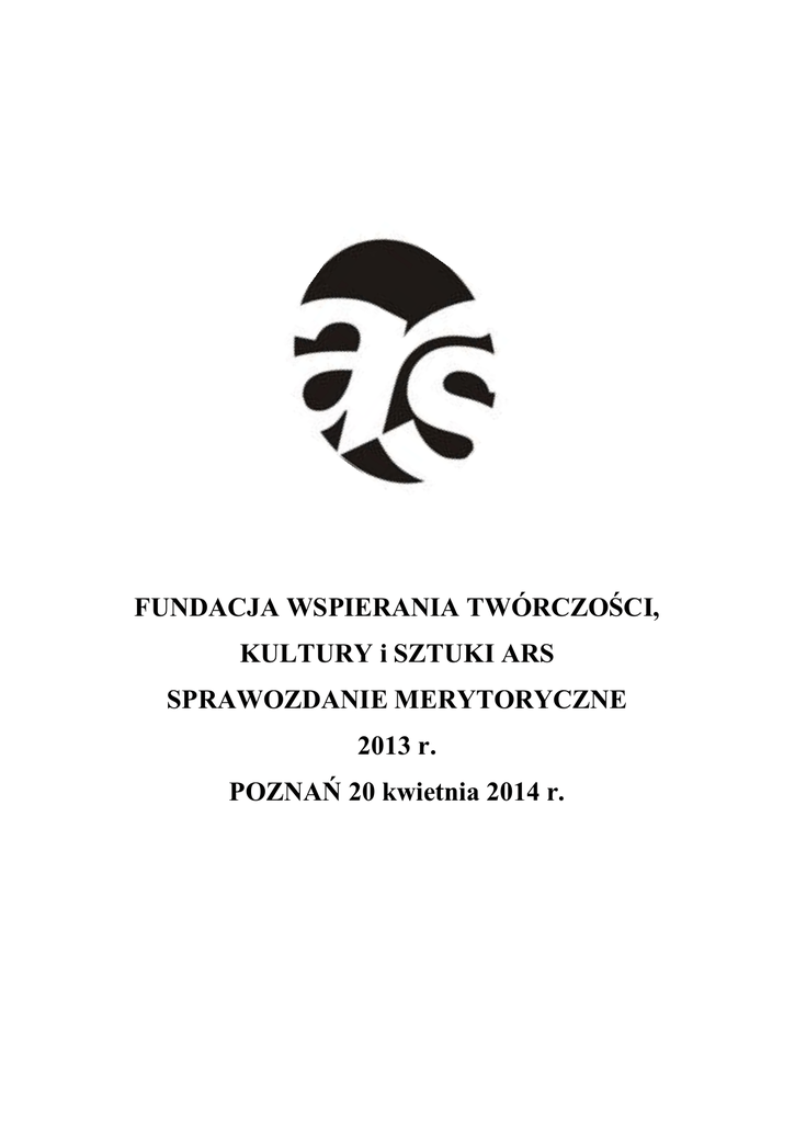 FUNDACJA WSPIERANIA TWÓRCZOŚCI, KULTURY i SZTUKI ARS SPRAWOZDANIE MERYTORYCZNE 2013 r. POZNAŃ 20 kwietnia 2014 r. Spis treści: I. Zarząd II. Biuro fundacji III. Działania programowe: a. Zajęcia „Animować Świat” b. Warsztaty artystyczne c. Noc Kupały d. III Poznański Piknik Rodzinny e. Wakacje w Ogródku Jordanowskim f. Wakacyjne Kino Ars g. Poznański Klub Filmowy h. Konkursy Plastyczne „Świąteczna Pocztówka” i. Galeria Ars IV. Fundraising a. Aukcja charytatywna „Ąrtyści Dzieciom” b. Zbiórki pieniężne c. Darowizny V. Wolontariat i działacze VI. Staże i praktyki VII. Udział Fundacji w życiu kulturalnym i obywatelskim Miasta Poznań I. Zarząd Zarząd Fundacji powołany przez Fundatora Piotra Zyznawskiego działał w składzie: Piotr Zyznawski – Prezes Zarządu Aleksandra Dmitrzak – członek Zarządu Arkadiusz Dworczak – członek Zarządu II. Biuro Fundacji Na umowę zlecenie zatrudnieni byli pracownicy: Angelika Janowiecka – koordynator programowy, animator zajęć Mirosław Nowak – pracownik biura, koordynator projektów Edyta Janicka – fundraiser Magdalena Misiak – koordynator projektów, współpraca z wolontariatem Zuzanna Markiewicz – koordynator wolontariatu, event manager Marta Łuczkowska – moderowanie stron internetowych Piotr Jarzyna- prowadzenie zajęć artystycznych Iwona Szerszeń – koordynowanie działań warsztatowych (także umowa o pracę) III. Działania programowe: a. Zajęcia „ Animować Świat” Zajęcia z zakresu animacji filmowej dla dzieci przedszkolnych i klas I-III szkoły podstawowej. Podczas trwających godzinę i trzydzieści minut zajęć, prezentuje się filmy z Poznańskiej Wytwórni Filmów Animowanych oraz na ich podstawie prowadzi się zajęcia manualne i plastyczne. W warsztatach uczestniczyło łącznie 10 500 dzieci z przedszkoli i szkół poznańskich oraz z Rokietnicy. Zajęcia odbywały się w okresie stycznia do końca grudnia z wakacyjną przerwą. Zajęcia prowadzili animatorzy Angelika Janowiecka, Piotr Jarzyna, Iwona Szerszeń oraz liczni wolontariusze i stażyści m.in. z Uniwersytetu im. Adama Mickiewicza oraz Wyższej Szkoły Nauk Humanistycznych i Dziennikarstwa. b. Warsztaty artystyczne Fundacja w roku 2013 wprowadziła do swojego programu bardzo dużo warsztatów z różnych dziedzin sztuki. Były one przeznaczone zarówno dla grup zorganizowanych jak i beneficjentów indywidualnych. Oferta zawierała między innymi warsztaty: I. Wokół Rękodzieła - hasło przewodnie brzmi „Zrób to sam". Wykorzystując materiały ekologiczne dzieci tworzyły kolekcję praktycznych przedmiotów do codziennego użytku. II. Podążać za artystą - spotkania z artystami, muzykami oraz osobami potrafiącymi zainspirować dzieci do rozwoju i zdobywania wiedzy. III. Zajęcia Teatralne z Akademią Sztuk Scenicznych - zajęcia ukierunkowane na gry i zabawy teatralne. IV. Zajęcia Muzyczne – kształtujące poczucie rytmu i wrażliwość przez śpiew oraz ćwiczenia rytmiczne. VI. Zajęcia Taneczne - poznanie podstawowych kroków tanecznych, nabycie koordynacji psychoruchowej oraz poczucia rytmu. VII. Poznański klub filmowy dla dzieci - w każdy piątek o godzinie 9.00 dzieci mogły oglądać pełnometrażowe filmy i bajki. Zajęcia nawiązywały do najważniejszych świąt kalendarzowych oraz ważnych z punktu widzenia polskiej kultury rocznic, jubileuszy i obchodów. Ważnym elementem trwających półtorej godziny zajęć było merytoryczne wprowadzenie beneficjentów w omawiany temat, przedstawienie historii i najważniejszych zagadnień poruszanego problemu artystycznego. Pozostałą część zajęć poświęcało się na twórcze i praktyczne działanie beneficjentów. Dużą wagę przywiązywało się do wykorzystywania podczas zajęć nietypowych materiałów artystycznych oraz materiałów ekologicznych. c. Noc Kupały 2013 21 czerwca 2013 r. po raz czwarty została zorganizowana Noc Kupały, a w jej ramach próba pobicia rekordu Guinnessa w puszczaniu lampionów. Impreza po raz drugi organizowana była jako impreza masowa. Podczas tej wyjątkowej czerwcowej nocy nie zabrakło tradycyjnych elementów, takich jak puszczanie wianków w oprawie pieśni ludowych i pokazów tańca, muzyki, fire show. W przygotowaniu i organizacji uczestniczyło 160 wolontariuszy ARS przy wsparciu Stowarzyszenia Edukacja dla Bezpieczeństwa, Harcerzy Chorągwi Wielkopolska oraz WOPR. Podczas imprezy wypuszczono 22 930 lampionów ustanawiając nieoficjalnie rekord Guinnessa. W trakcie imprezy wystąpili: Gooral, Teatr Szutnik, Kapela z Orliczka, Łany, Spin me. Podczas wydarzenia wręczona została nagroda w konkursie fotograficznym na najbardziej artystyczne zdjęcie z Nocy Kupały 2012. Szacunkowy udział w imprezie określono na ponad 20 000 osób. Impreza połączona była ze zbiórka pieniężną w ramach dystrybucji lampionów, które pełniły rolę upominku dla darczyńcy za przekazanie darowizny na rzecz Fundacji ARS. Na podstawie Decyzji o numerze SO-I.5311.27.2013 wydanej 23.05.2013 roku przez Prezydenta Miasta Poznania, przeprowadzona została zbiórka publiczna oraz sprzedaż cegiełek na łączną wartość 68 700 zł ze zbiórek cegiełek oraz 172,46 zł ze zbiórek do puszek. Pieniądze przekazano w części na pokrycie kosztów imprezy a pozostałą część na działania statutowe Fundacji. Wydarzenie patronatem honorowym objeli: Prezydent Miasta Poznania, Marszałek Województwa Wielkopolskiego, Ambasador Japonii. Działanie to zostało także dofinansowane kwotą 10 tysięcy złotych z Wydziału Kultury i Dziedzictwa Urzędu Miasta Poznania w formie małego grantu. d. Poznański Piknik Rodzinny Poznański Piknik Rodzinny to festyn, podczas którego Fundacja integruje społeczność lokalną, instytucje oraz organizacje pozarządowe. Przez szereg działań artystycznych i sportowych zapewnia mieszkańcom możliwość relaksu na świeżym powietrzu, promuje aktywny wypoczynek nad Wartą i stwarz