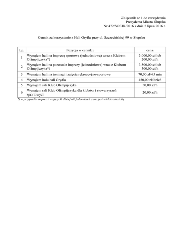 Załącznik nr 1 do zarządzenia Prezydenta Miasta Słupska Nr 472/SOSIR/2016 z dnia 5 lipca 2016 r. Cennik za korzystanie z Hali Gryfia przy ul. Szczecińskiej 99 w Słupsku Lp. Pozycja w cenniku cena 1 Wynajem hali na imprezę sportową (jednodniową) wraz z Klubem Olimpijczyka*) 3.000,00 zł lub 200,00 zł/h 2 Wynajem hali na pozostałe imprezy (jednodniowe) wraz z Klubem Olimpijczyka*) 3.500,00 zł lub 300,00 zł/h 3 Wynajem hali na treningi i zajęcia rekreacyjno-sportowe 70,00 zł/45 min 4 Wynajem holu hali Gryfia 450,00 zł/dzień 5 Wynajem sali Klub Olimpijczyka 50,00 zł/h 6 Wynajem sali Klub Olimpijczyka dla klubów i stowarzyszeń sportowych 20,00 zł/h *) w przypadku imprez trwających dłużej niż jeden dzień cena jest wielokrotnością