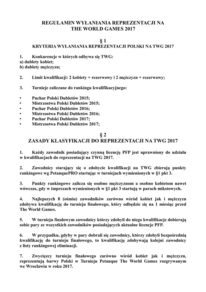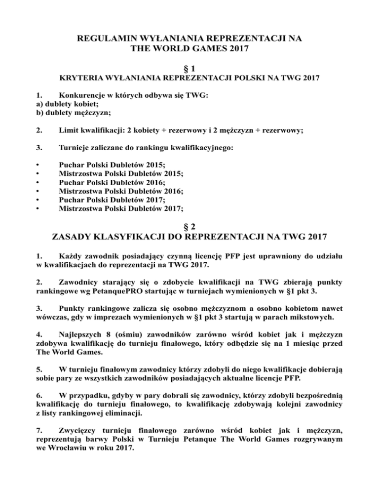 REGULAMIN WYŁANIANIA REPREZENTACJI NA THE WORLD GAMES 2017 §1 KRYTERIA WYŁANIANIA REPREZENTACJI POLSKI NA TWG 2017 1. Konkurencje w których odbywa się TWG: a) dublety kobiet; b) dublety mężczyzn; 2. Limit kwalifikacji: 2 kobiety + rezerwowy i 2 mężczyzn + rezerwowy; 3. Turnieje zaliczane do rankingu kwalifikacyjnego: • • • • • • Puchar Polski Dubletów 2015; Mistrzostwa Polski Dubletów 2015; Puchar Polski Dubletów 2016; Mistrzostwa Polski Dubletów 2016; Puchar Polski Dubletów 2017; Mistrzostwa Polski Dubletów 2017; §2 ZASADY KLASYFIKACJI DO REPREZENTACJI NA TWG 2017 1. Każdy zawodnik posiadający czynną licencję PFP jest uprawniony do udziału w kwalifikacjach do reprezentacji na TWG 2017. 2. Zawodnicy starający się o zdobycie kwalifikacji na TWG zbierają punkty rankingowe wg PetanquePRO startując w turniejach wymienionych w §1 pkt 3. 3. Punkty rankingowe zalicza się osobno mężczyznom a osobno kobietom nawet wówczas, gdy w imprezach wymienionych w §1 pkt 3 startują w parach mikstowych. 4. Najlepszych 8 (ośmiu) zawodników zarówno wśród kobiet jak i mężczyzn zdobywa kwalifikację do turnieju finałowego, który odbędzie się na 1 miesiąc przed The World Games. 5. W turnieju finałowym zawodnicy którzy zdobyli do niego kwalifikacje dobierają sobie pary ze wszystkich zawodników posiadających aktualne licencje PFP. 6. W przypadku, gdyby w pary dobrali się zawodnicy, którzy zdobyli bezpośrednią kwalifikację do turnieju finałowego, to kwalifikację zdobywają kolejni zawodnicy z listy rankingowej eliminacji. 7. Zwycięzcy turnieju finałowego zarówno wśród kobiet jak i mężczyzn, reprezentują barwy Polski w Turnieju Petanque The World Games rozgrywanym we Wrocławiu w roku 2017. 8. Trzeciego zawodnika do drużyny zarówno kobiet jak i mężczyzn desygnuje sztab szkoleniowy. 9. W przypadku kiedy zwycięzcy nie mogą uczestniczyć w TWG 2017, selekcjoner reprezentacji powołuje alternatywny skład. 10. Zarząd PFP zatwierdza skład reprezentacji kobiet i reprezentacji mężczyzn na TWG 2017. §3 Regulamin wchodzi w życie w dniu zatwierdzenia