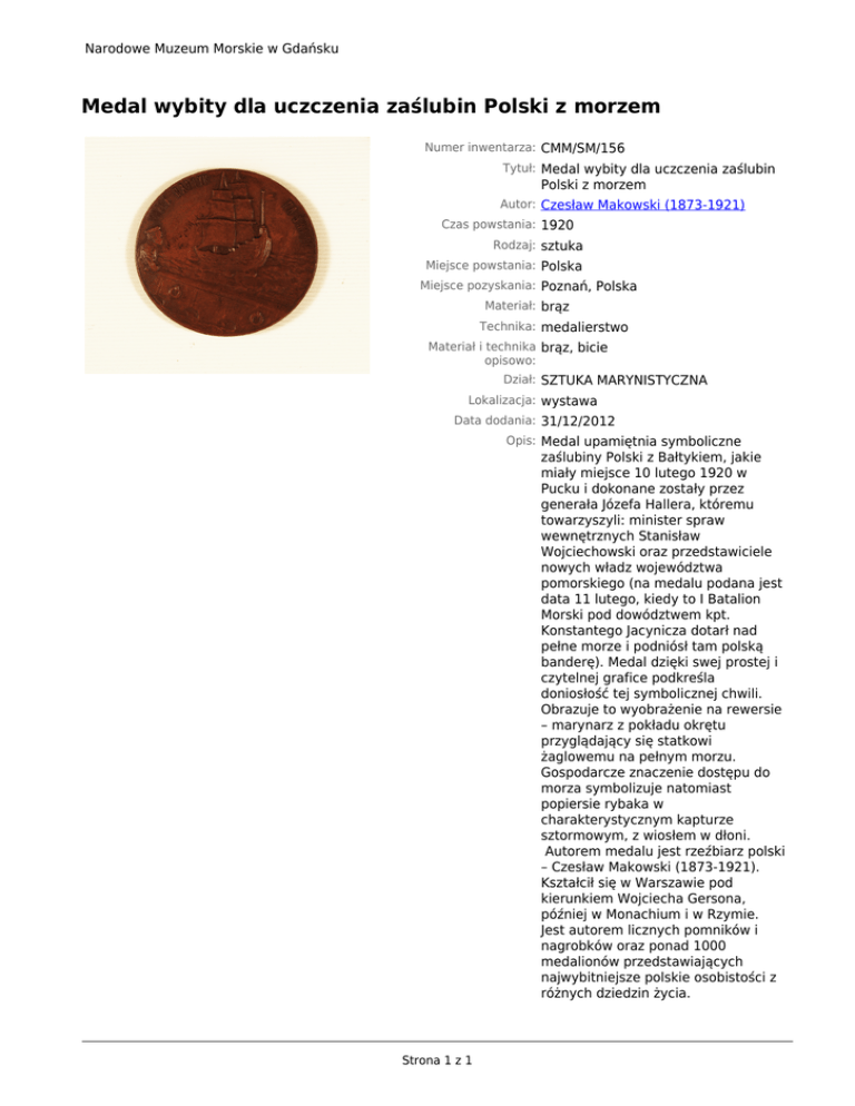Narodowe Muzeum Morskie w Gdańsku Medal wybity dla uczczenia zaślubin Polski z morzem Numer inwentarza: CMM/SM/156 Tytuł: Medal wybity dla uczczenia zaślubin Polski z morzem Autor: Czesław Makowski (1873-1921) Czas powstania: 1920 Rodzaj: sztuka Miejsce powstania: Polska Miejsce pozyskania: Poznań, Polska Materiał: brąz Technika: medalierstwo Materiał i technika brąz, bicie opisowo: Dział: SZTUKA MARYNISTYCZNA Lokalizacja: wystawa Data dodania: 31/12/2012 Opis: Medal upamiętnia symboliczne zaślubiny Polski z Bałtykiem, jakie miały miejsce 10 lutego 1920 w Pucku i dokonane zostały przez generała Józefa Hallera, któremu towarzyszyli: minister spraw wewnętrznych Stanisław Wojciechowski oraz przedstawiciele nowych władz województwa pomorskiego (na medalu podana jest data 11 lutego, kiedy to I Batalion Morski pod dowództwem kpt. Konstantego Jacynicza dotarł nad pełne morze i podniósł tam polską banderę). Medal dzięki swej prostej i czytelnej grafice podkreśla doniosłość tej symbolicznej chwili. Obrazuje to wyobrażenie na rewersie – marynarz z pokładu okrętu przyglądający się statkowi żaglowemu na pełnym morzu. Gospodarcze znaczenie dostępu do morza symbolizuje natomiast popiersie rybaka w charakterystycznym kapturze sztormowym, z wiosłem w dłoni. Autorem medalu jest rzeźbiarz polski – Czesław Makowski (1873-1921). Kształcił się w Warszawie pod kierunkiem Wojciecha Gersona, później w Monachium i w Rzymie. Jest autorem licznych pomników i nagrobków oraz ponad 1000 medalionów przedstawiających najwybitniejsze polskie osobistości z różnych dziedzin życia. Strona 1 z 1