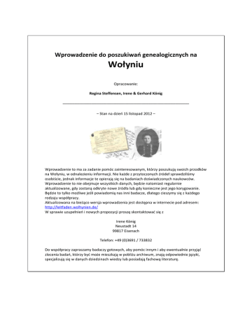 Wprowadzenie do poszukiwań genealogicznych na Wołyniu Opracowanie: Regina Steffensen, Irene & Gerhard König ___________________________________________________________________________ – Stan na dzień 15 listopad 2012 – Wprowadzenie to ma za zadanie pomóc zainteresowanym, którzy poszukują swoich przodków na Wołyniu, w odnalezieniu informacji. Nie każde z przytoczonych źródeł sprawdziliśmy osobiście, jednak informacje te opierają się na badaniach doświadczonych naukowców. Wprowadzenie to nie obejmuje wszystkich danych, będzie natomiast regularnie aktualizowane, gdy zostaną odkryte nowe źródła lub gdy konieczne jest jego korygowanie. Będzie to tylko możliwe jeśli powiadomią nas inni badacze, dlatego cieszymy się z każdego rodzaju współpracy. Aktualizowana na bieżąco wersja wprowadzenia jest dostępna w internecie pod adresem: http://leitfaden.wolhynien.de/ W sprawie uzupełnień i nowych propozycji proszę skontaktować się z Irene König Neustadt 14 99817 Eisenach Telefon: +49 (0)3691 / 733832 Do współpracy zapraszamy badaczy gotowych, aby pomóc innym i aby ewentualnie przyjąć zlecenia badań, którzy być może mieszkają w pobliżu archiwum, znają odpowiednie języki, specjalizują się w danych dziedzinach wiedzy lub posiadają fachową literaturę. Wprowadzenie do poszukiwań genealogicznych na Wołyniu SPIS TREŚCI 1. 1.1 ARCHIWA, URZḘDY I BIBLIOTEKI W NIEMCZECH ................................................................................. 7 ARCHIWA ................................................................................................................................................................. 7 1.1.1 Archiwum Federalne / Bundesarchiv w Berlinie Lichterfelde ............................................................................... 7 1.1.1.1 Zasoby Centralnego Urzędu Imigracyjnego (EWZ) ............................................................................................ 7 a. Kto jest upoważniony do przeglądania zasobu? ...................................................................................... 7 b. Jakie wymogi formalne należy spełniać? ................................................................................................. 7 c. Czego można oczekiwać? ......................................................................................................................... 8 d. Informacje o zasobach Centralnego Biura Imigracyjnego w internecie ................................................... 8 e. Indeks z Galicji .......................................................................................................................................... 8 f. Akta Centralnego Biura Imigracyjnego, znajdujące się na mikrofilmach w ośrodkach badawczych Kościoła Jezusa Chrystusa Świętych w Dniach Ostatnich (Mormonów) ................................................... 8 1.1.1.2 Dokumenty Niemieckiego Instytutu Zagranicznego/ Deutsches Ausland-Institut (DAI) ................................... 9 a. Dokumentacje .......................................................................................................................................... 9 b. Ankiety, zawierające informacje o krewnych wypełnione przez przesiedleńców z Wołynia ................... 9 c. Listy mieszkańców zamieszkałych w niemieckich miejscowościach na Wołyniu ................................... 10 d. Arkusze danych podstawowych dla przesiedleńców z Polski ................................................................. 10 e. Kartoteki................................................................................................................................................. 11 f. Warunki użytkowania ............................................................................................................................ 11 g. Opłaty..................................................................................................................................................... 11 1.1.2 Federalne Archiwum Reparacji Wojennych / Lastenausgleichsarchiv w Bayreuth ............................................ 12 1.1.3 Tajne Archiwum Państwowe Pruskiego Dziedzictwa Kulturowego w Berlinie ................................................... 12 1.1.4 Ewangelickie Archiwum Centralne / Evangelisches Zentralarchiv (EZA) w Berlinie ............................................ 12 1.1.5 Archiwum Onckena w Elstal koło Berlina ........................................................................................................... 13 1.2 Urząd Stanu Cywilnego I w Berlinie ....................................................................................................................... 13 1.3 Biblioteki ................................................................................................................................................................ 13 1.3.1 Biblioteka im. Martina Opitza w Herne .............................................................................................................. 13 1.3.2 Dolnosaksońska Biblioteka Państwowa i Uniwersytecka w Getyndze................................................................ 13 1.3.3 Państwowa Biblioteka w Berlinie ....................................................................................................................... 14 2. Biura Poszukiwań zaginionych .......................................................................................................... 14 2.1 Kartoteka Miejsca Pochodzenia / Heimatortskartei (HOK) w Stuttgarcie - Kościelne Biuro Poszukiwań .............. 14 2.2 Niemiecki Czerwony Krzyż ..................................................................................................................................... 14 2.3 Biura poszukiwań w Rosji ....................................................................................................................................