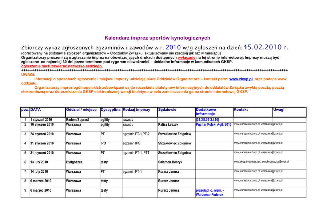 Kalendarz imprez sportów kynologicznych Zbiorczy wykaz