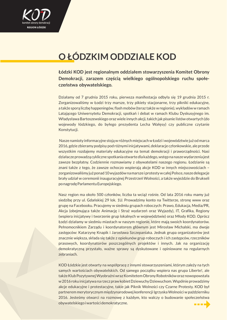 O £ÓDZKIM ODDZIALE KOD £ódzki KOD jest regionalnym oddzia³em stowarzyszenia Komitet Obrony Demokracji, zarazem czêœci¹ wielkiego ogólnopolskiego ruchu spo³eczeñstwa obywatelskiego. Dzia³amy od 7 grudnia 2015 roku, pierwsza manifestacja odby³a siê 19 grudnia 2015 r. Zorganizowaliœmy w £odzi trzy marsze, trzy pikiety stacjonarne, trzy pikniki edukacyjne, a tak¿e spor¹ liczbê happeningów, flash mobów (teraz tak¿e w regionie), wyk³adów w ramach Lataj¹cego Uniwersytetu Demokracji, spotkañ i debat w ramach Klubu Dyskusyjnego im. W³adys³awa Bartoszewskiego oraz wiele innych akcji, takich jak pisanie listów otwartych (do wojewody ³ódzkiego, do by³ego prezydenta Lecha Wa³êsy) czy publiczne czytanie Konstytucji. Nasze namioty informacyjne stoj¹ w ró¿nych miejscach w £odzi i województwie ju¿ od marca 2016, gdzie zbieramy podpisy pod ró¿nymi inicjatywami, deklaracje cz³onkowskie, ale przede wszystkim rozdajemy materia³y edukacyjne na temat demokracji i praworz¹dnoœci. Nasi dzia³acze prowadz¹ cykliczne spotkania otwarte dla ka¿dego, wstêp na nasze wydarzenia jest zawsze bezp³atny. Codziennie rozmawiamy z obywatelami naszego regionu. £odzianie s¹ znani tak¿e z tego, ¿e zawsze ochoczo wspieraj¹ akcje KOD w innych miejscowoœciach – zorganizowaliœmy ju¿ ponad 10 wyjazdów na marsze i protesty w ca³ej Polsce, nasze delegacje bra³y udzia³ w ceremonii inauguracyjnej Przestrzeñ Wolnoœci, a tak¿e wyjeŸdzie do Brukseli po nagrodê Parlamentu Europejskiego. Nasz region ma oko³o 500 cz³onków, liczba ta wci¹¿ roœnie. Od lata 2016 roku mamy ju¿ siedzibê przy ul. Gdañskiej 29 lok. 1U. Prowadzimy konto na Twitterze, stronê www oraz grupê na Facebooku. Pracujemy w siedmiu grupach roboczych: Prawo, Edukacja, Media/PR, Akcja (obejmuj¹ca tak¿e Animacjê i Stra¿ wydarzeñ oraz Wyjazdy), IT, Grafika, Regiony (wspiera inicjatywy i tworzenie grup lokalnych w województwie) oraz M³ody KOD. Oprócz £odzi dzia³amy w siedmiu miastach w naszym regionie, które maj¹ swoich koordynatorów. Pe³nomocnikiem Zarz¹du i koordynatorem g³ównym jest Miros³aw Michalski, ma dwoje zastêpców: Katarzynê Knapik i Jaros³awa Szczepaniaka. Jednak grupa organizatorów jest znacznie wiêksza, sk³ada siê tak¿e z opiekunów grup roboczych i ich zastêpców, rzeczników prasowych, koordynatorów poszczególnych projektów i innych. Jak na organizacjê demokratyczn¹ przysta³o, wa¿ne sprawy s¹ dyskutowane i opiniowane na regularnych zebraniach. KOD £ódzkie jest otwarty na wspó³pracê z innymi stowarzyszeniami, którym zale¿y na tych samych wartoœciach obywatelskich. Od samego pocz¹tku wspiera nas grupa Liberte!, ale tak¿e Klub Pozytywnej WyobraŸni wraz Komitetem Obrony Robotników oraz nowopowsta³a w 2016 roku inicjatywa na rzecz praw kobiet Dziewuchy Dziewuchom. Wspólnie prowadzimy akcje edukacyjne i protestacyjne, takie jak Piknik Wolnoœci czy Czarne Protesty. KOD by³ partnerem merytorycznym miêdzynarodowej konferencji Igrzyska Wolnoœci w paŸdzierniku 2016. Jesteœmy otwarci na rozmowê z ka¿dym, kto walczy o budowanie spo³eczeñstwa obywatelskiego i wartoœci demokratyczne. KOD REG. £ÓDZKI W LICZBACH Oprócz £odzi dzia³amy w 7 miastach w województwie Be³chatów, Kutno, Pabianice,Piotrków Trybunalski, Tomaszów Mazowiecki, Sieradz /Zduñska Wola, Zgierz Zorganizowaliœmy w samej tylko £odzi: • • • • • 3 marsze (23 .01., 17.04., 2.10. 2016) 2 pikiety (19.12.2015 i 5.07. 2016) 3 pikniki (04.06., 07.08. i 11.09.2016) 5 happeningów (9.01., 14.02. , 08.03., 02.04., 03.05.2016 ) happeningi ruchome (Tram wpopszek rasizmowi - 3 edycje od 13.09.2016) Mamy ok. 500 cz³onków w ca³ym regionie Lataj¹cy Uniwersytet Demokratyczny przeprowadzi³ ponad 10 wyk³adów w £odzi i województwie na temat historii, prawa, reformy rolnej, mowy nienawiœci i indoktrynacji w mediach Klub Dyskusyjny im. W³adys³awa Bartoszewskiego zaaran¿owa³ 8 spotkañ z wyj¹tkowymi goœæmi. Zorganizowaliœmy 10 wyjazdów na manifestacje w ca³ej Polsce Dzia³amy w 7 grupach roboczych (Akcja, Edukacja, Prawo, Media i PR, Regiony, Grafika, Stra¿) w w w . k o d - l o d z k i e . p [email protected] l